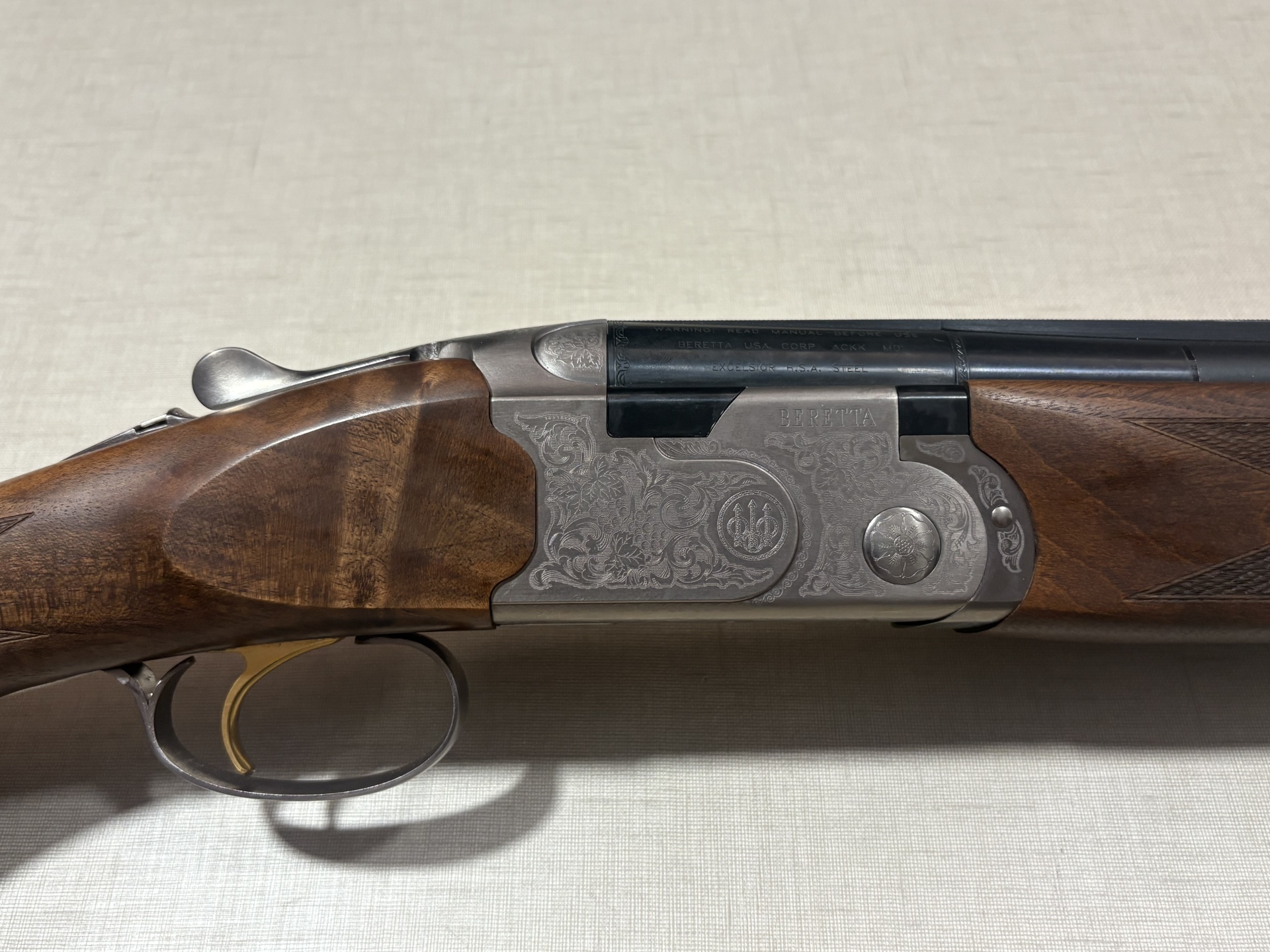 Espingarda Beretta de canos duplos com coronha de madeira e caixa metálica gravada