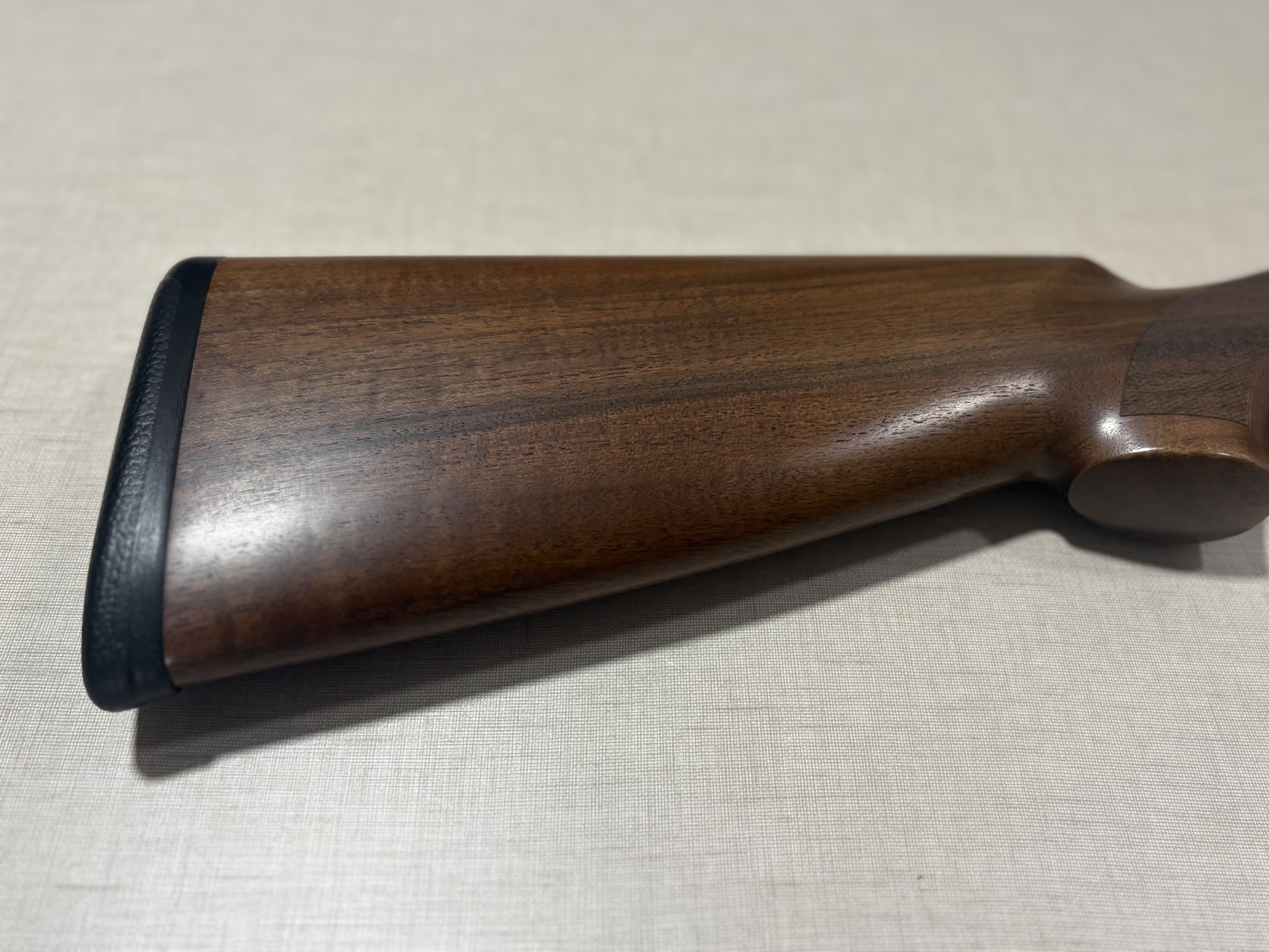 Parte traseira de espingarda em madeira castanha com apoio de borracha preto