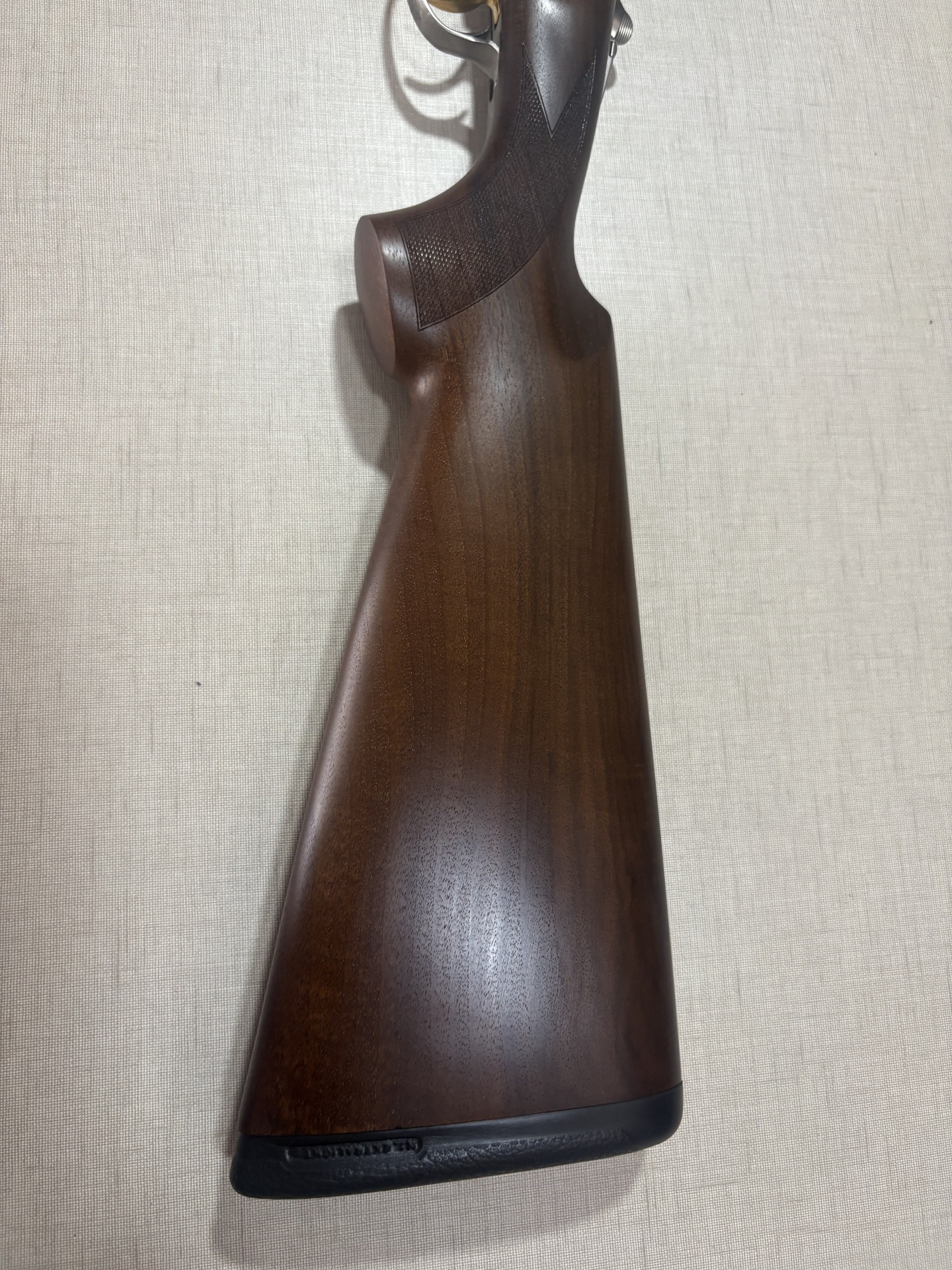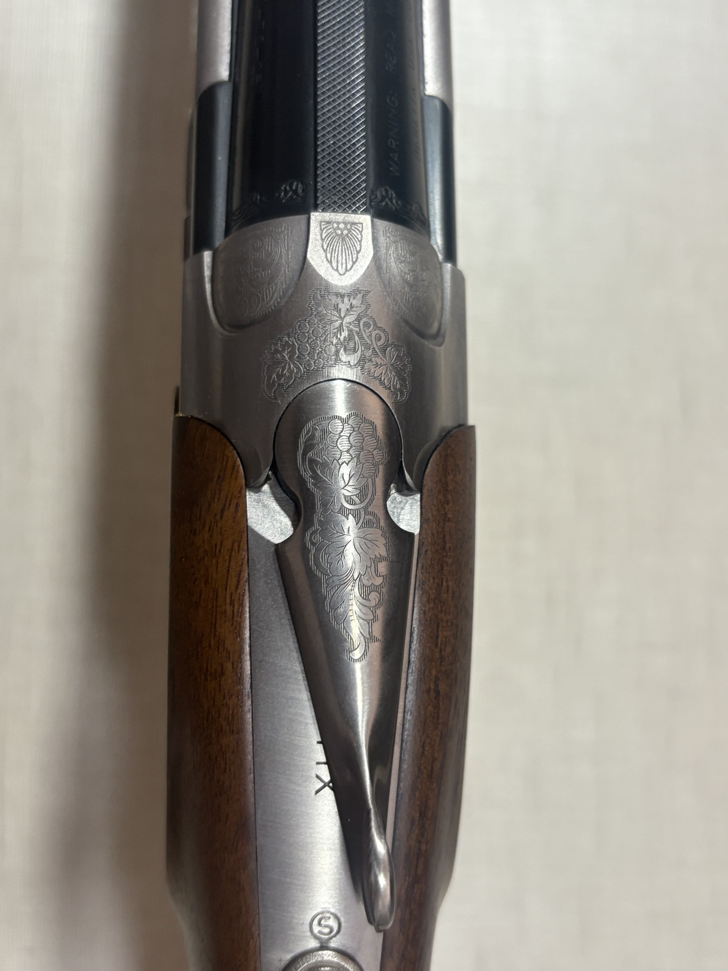Espingarda Beretta em madeira e metal com gravações detalhadas e gatilho dourado