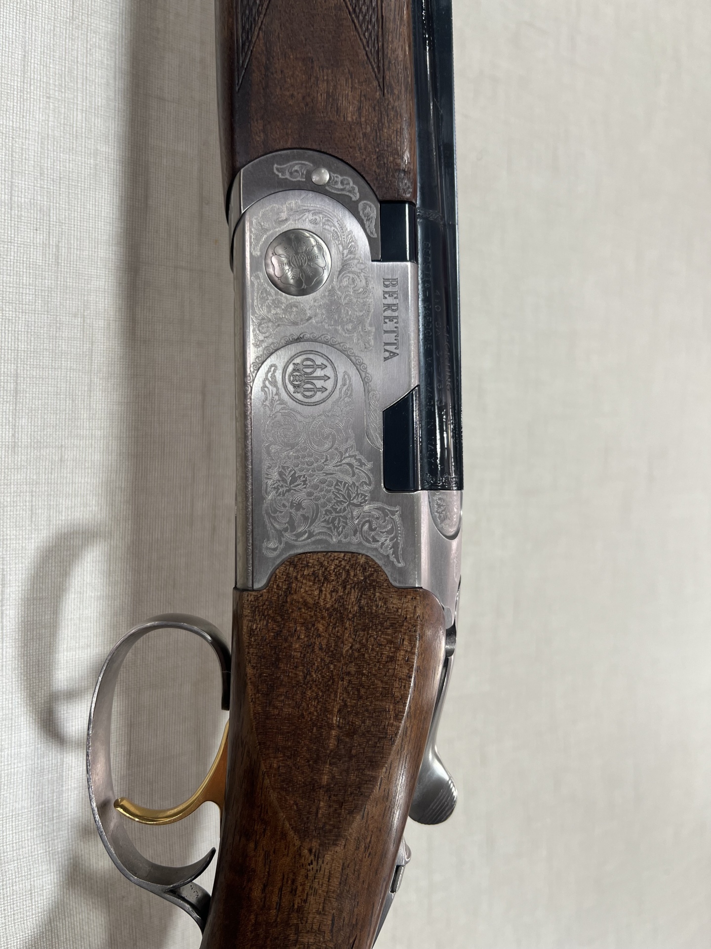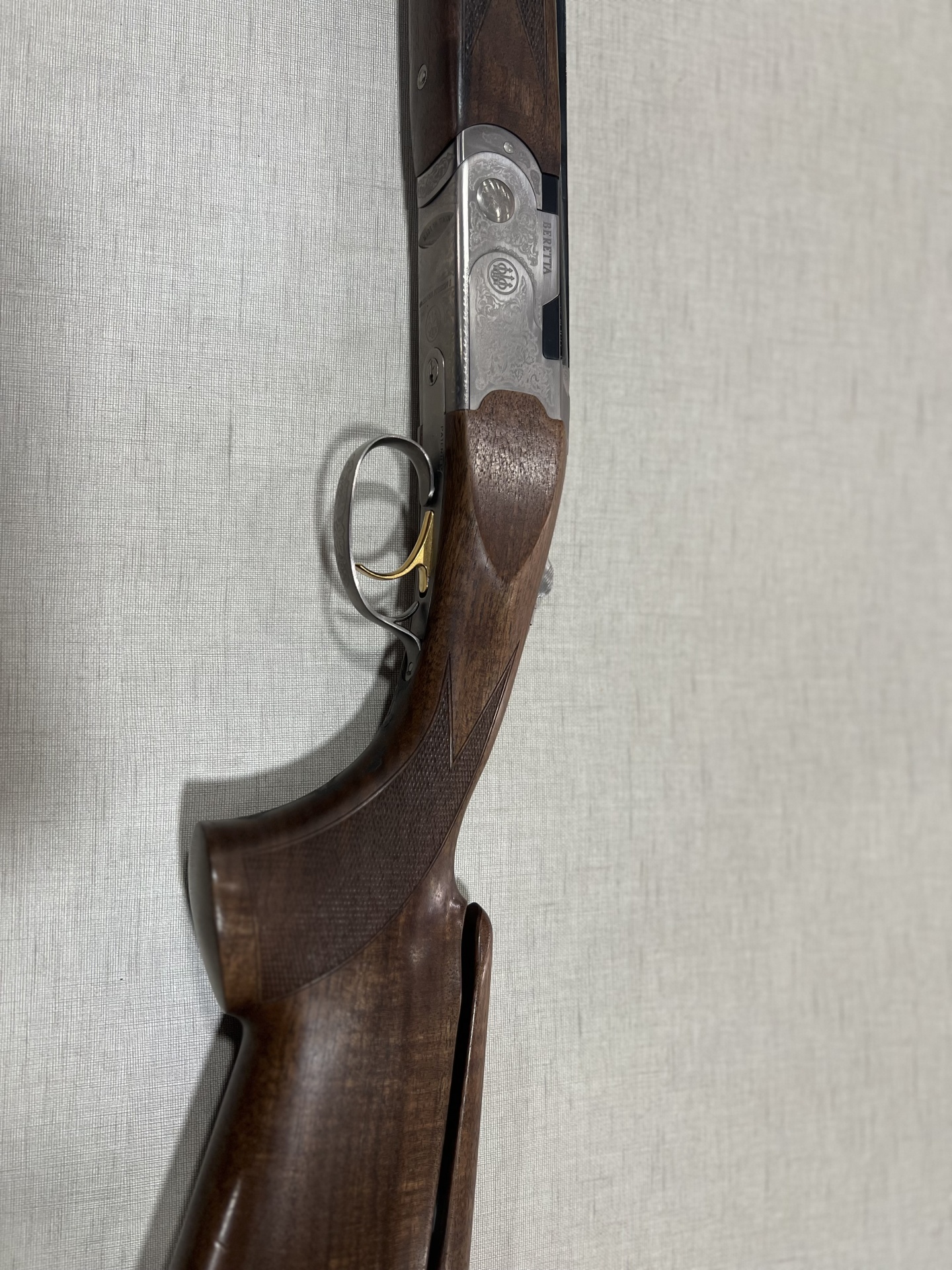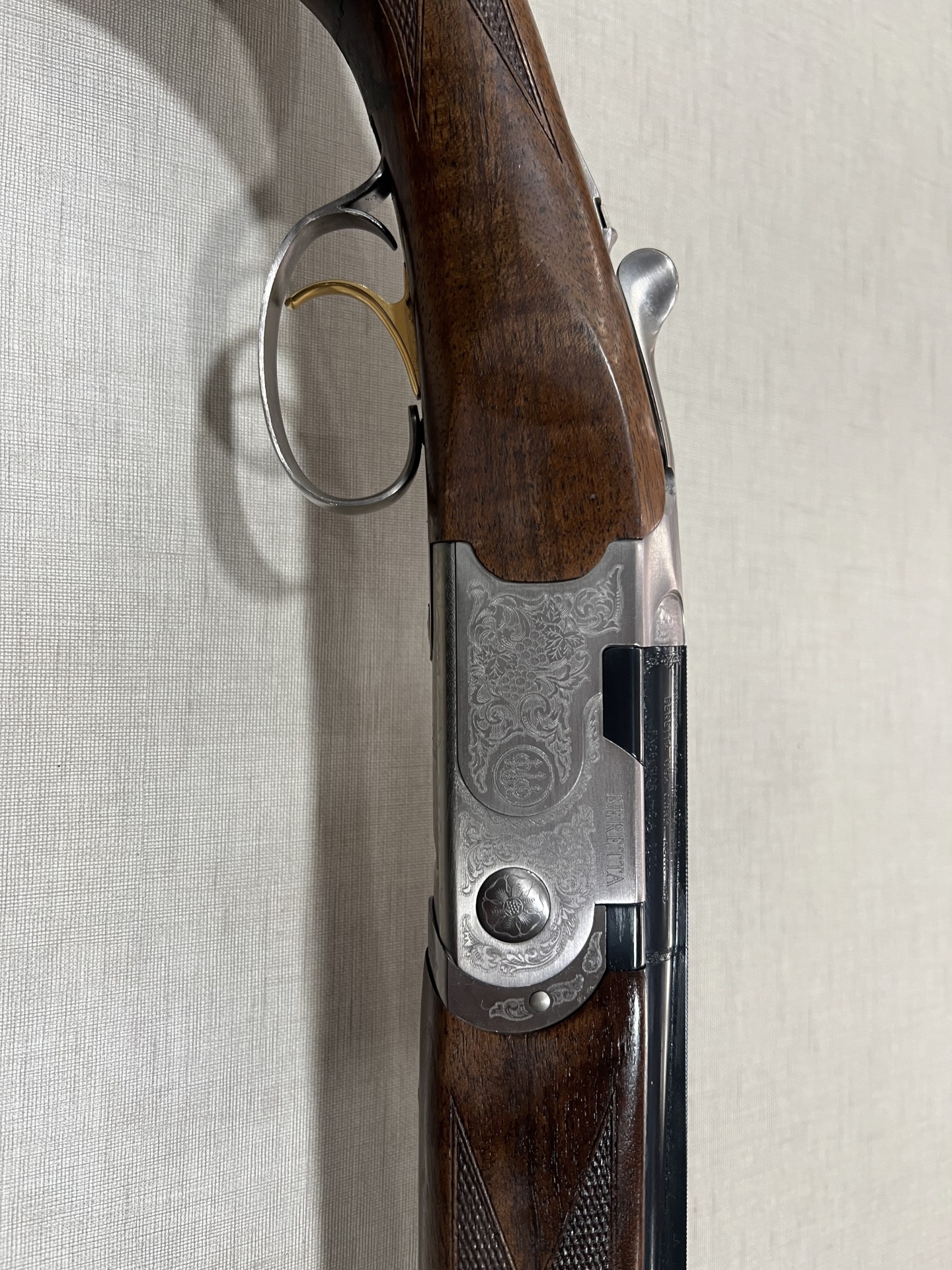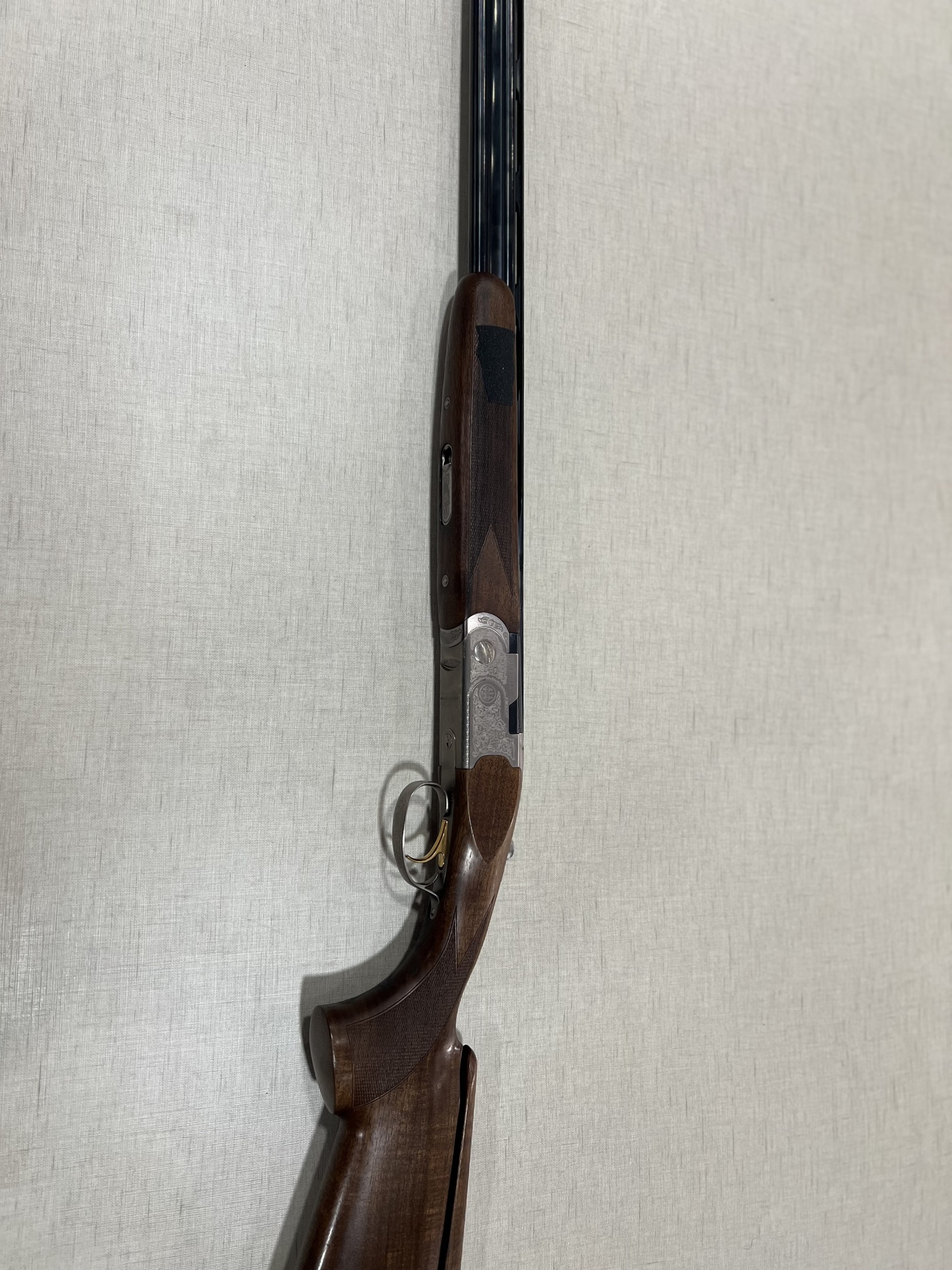 Espingarda com empunhadura em madeira castanha e corpo metálico gravado sobre tecido cinzento