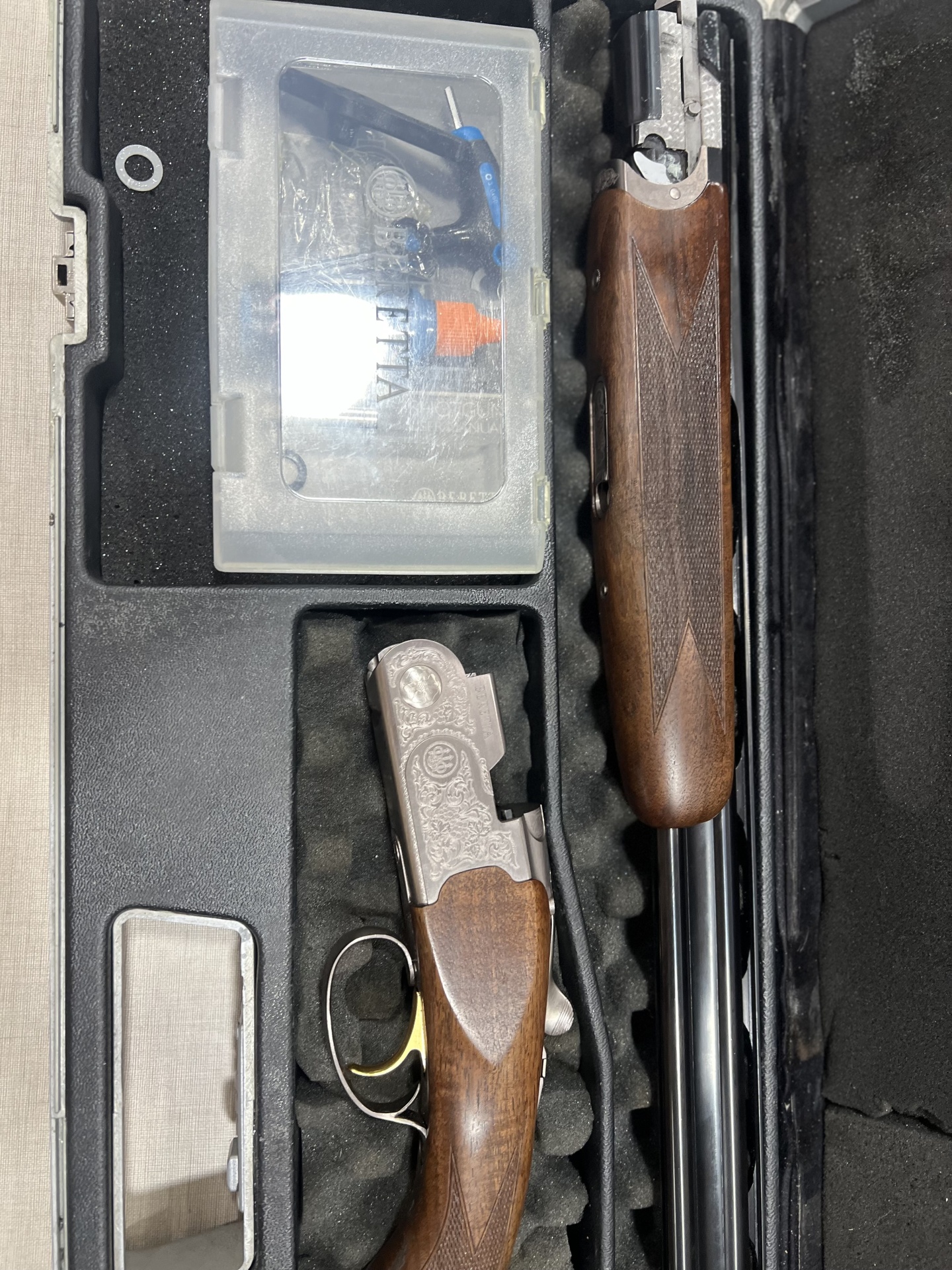 Arma de fogo desmontada com peças em madeira e metal num estojo de transporte