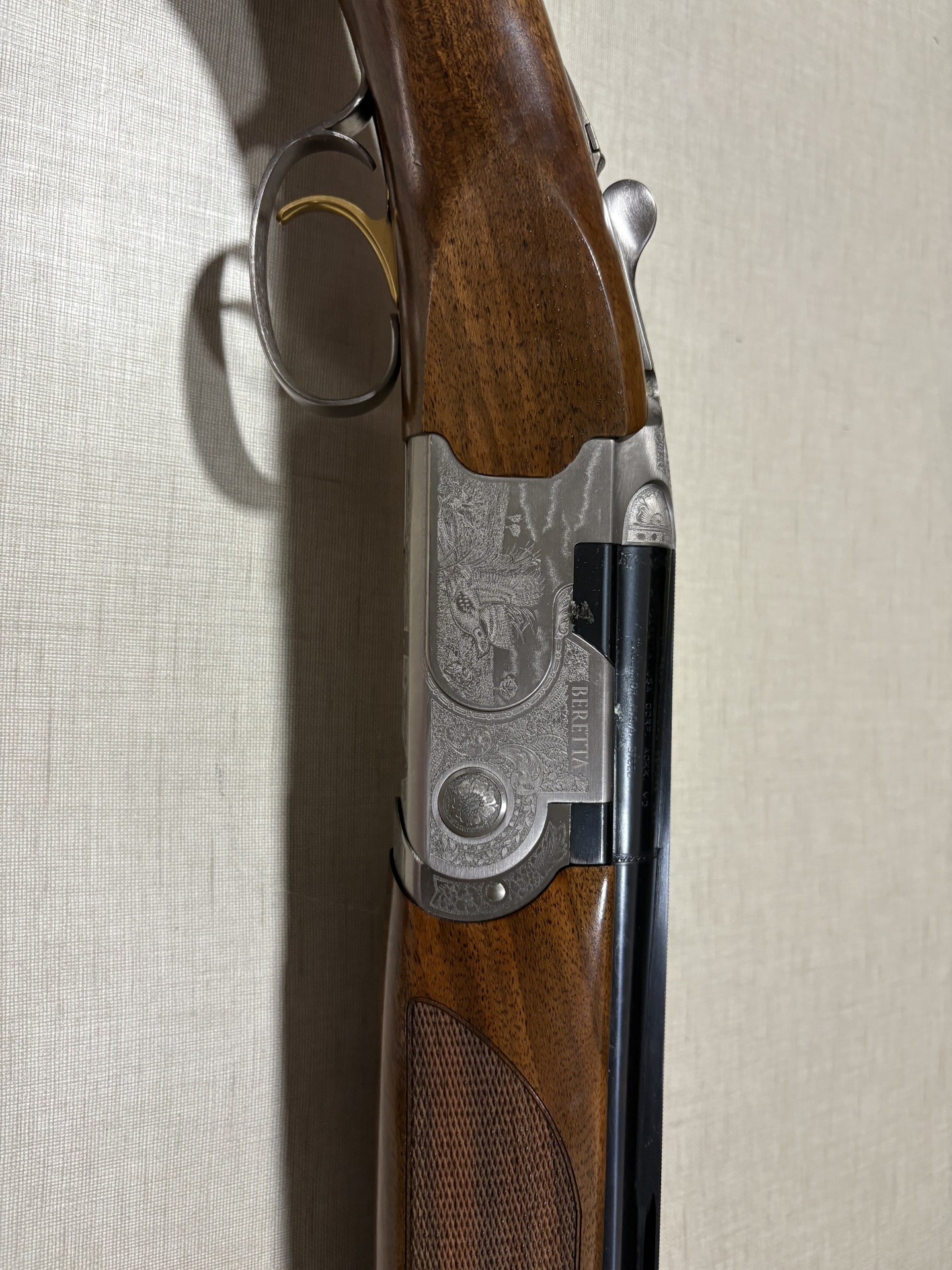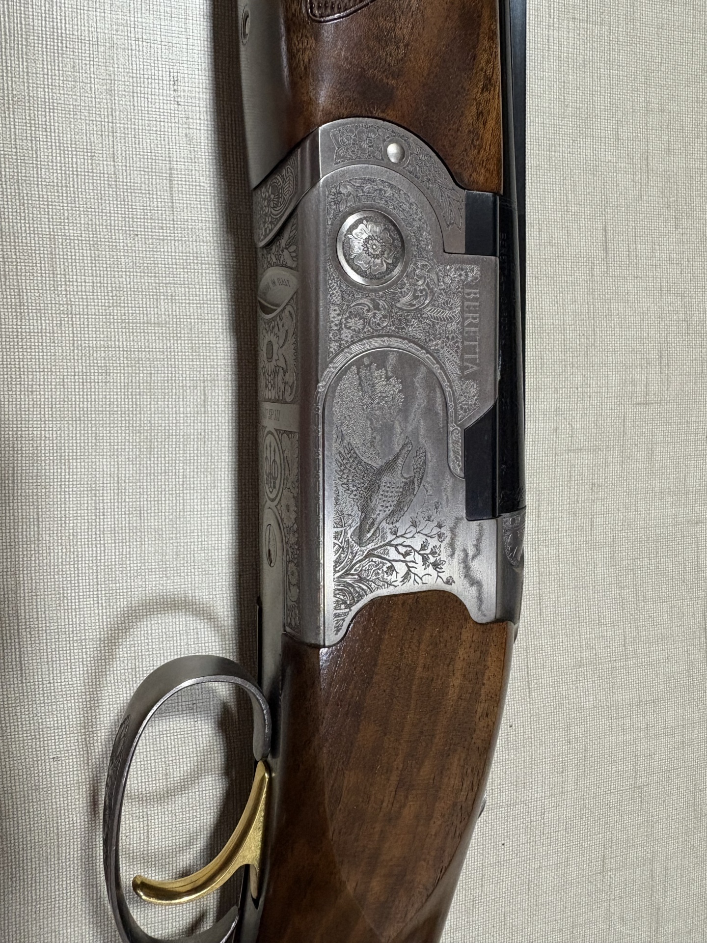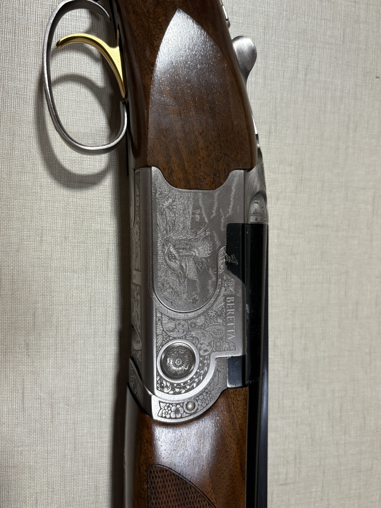 espingarda Beretta com madeira castanha e gravações metálicas detalhadas