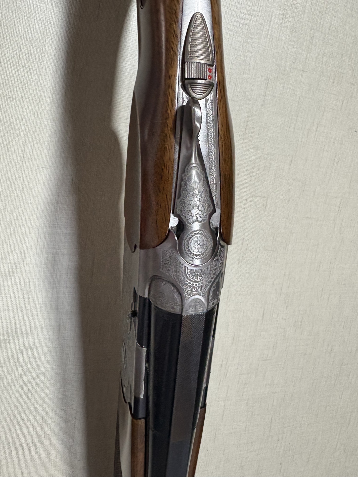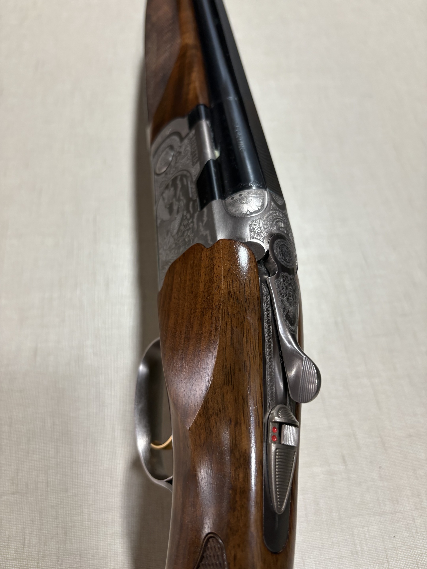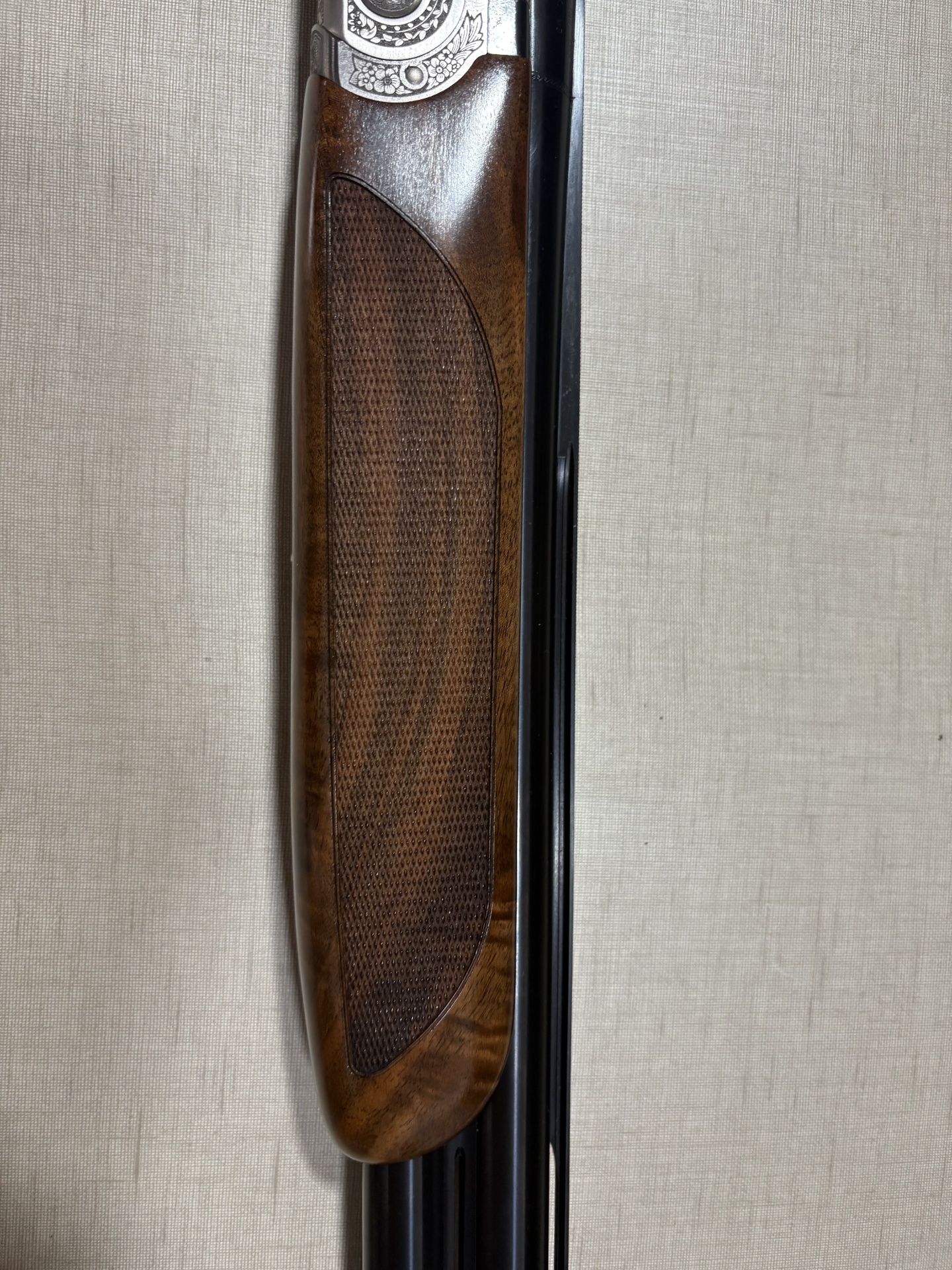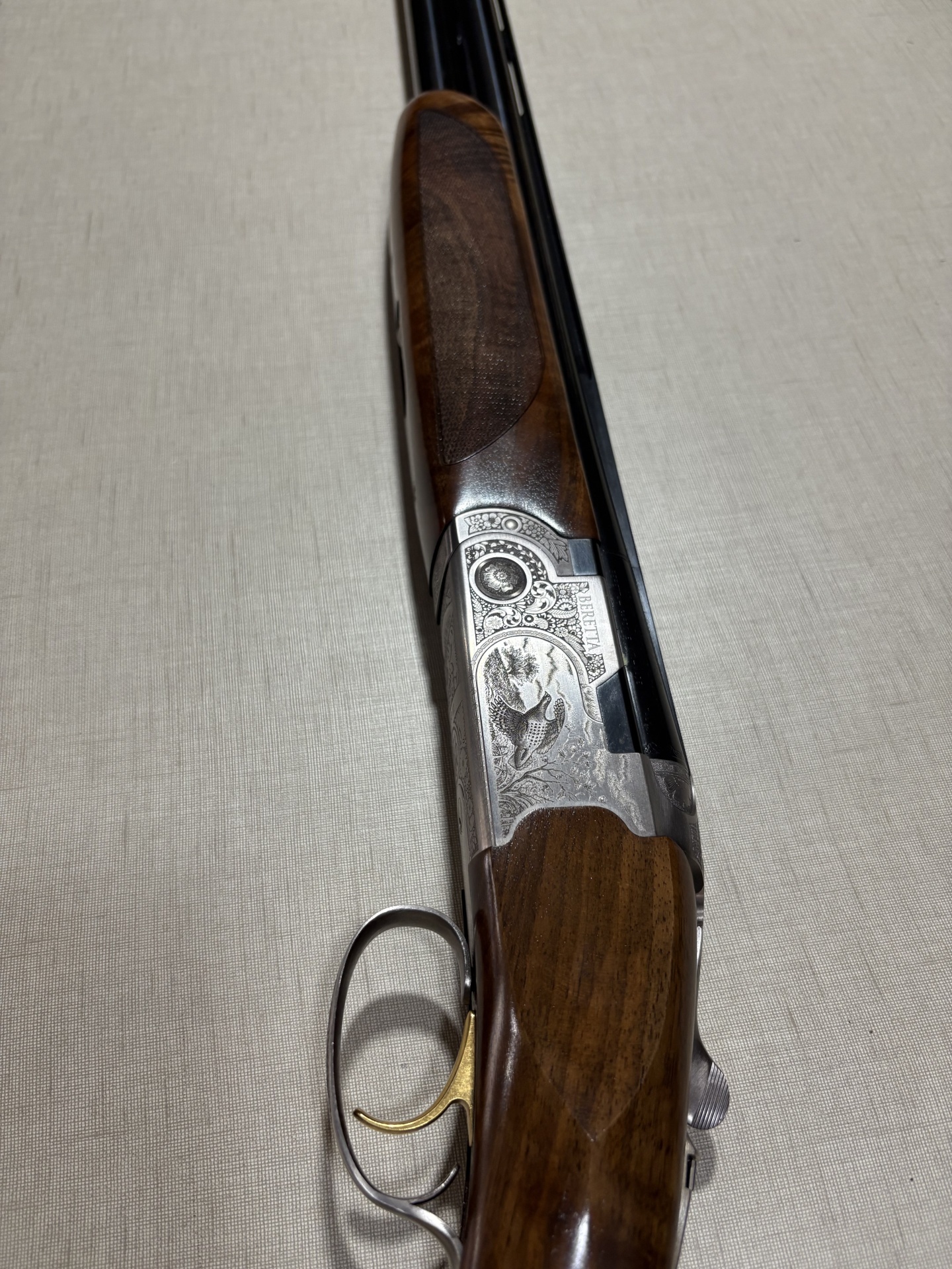 espingarda Beretta com madeira castanha e gravações metálicas detalhadas