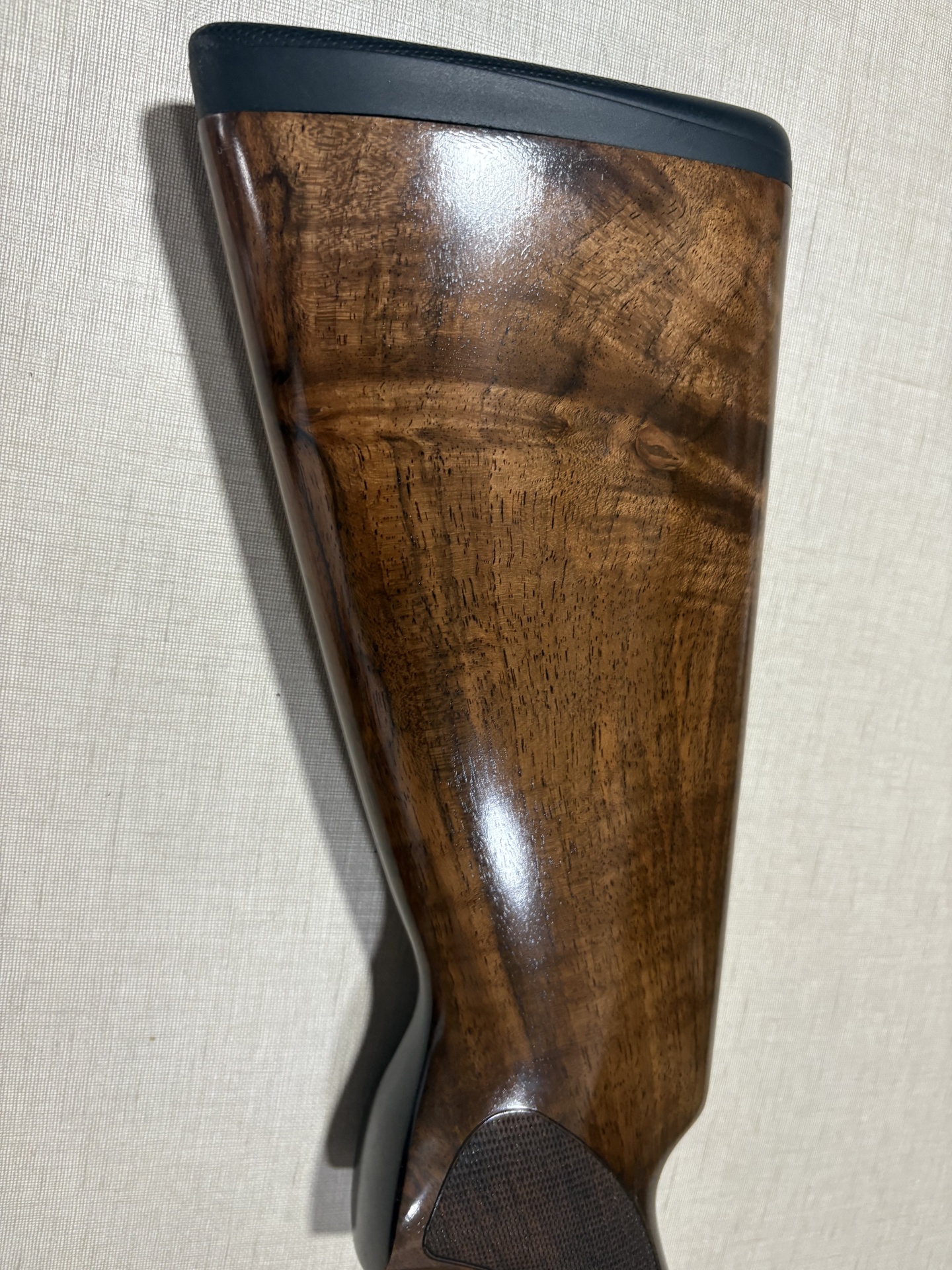 Coronha de arma de fogo em madeira polida com ponteira preta