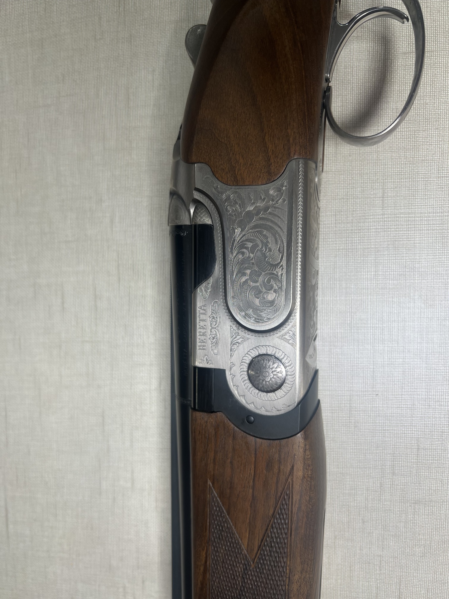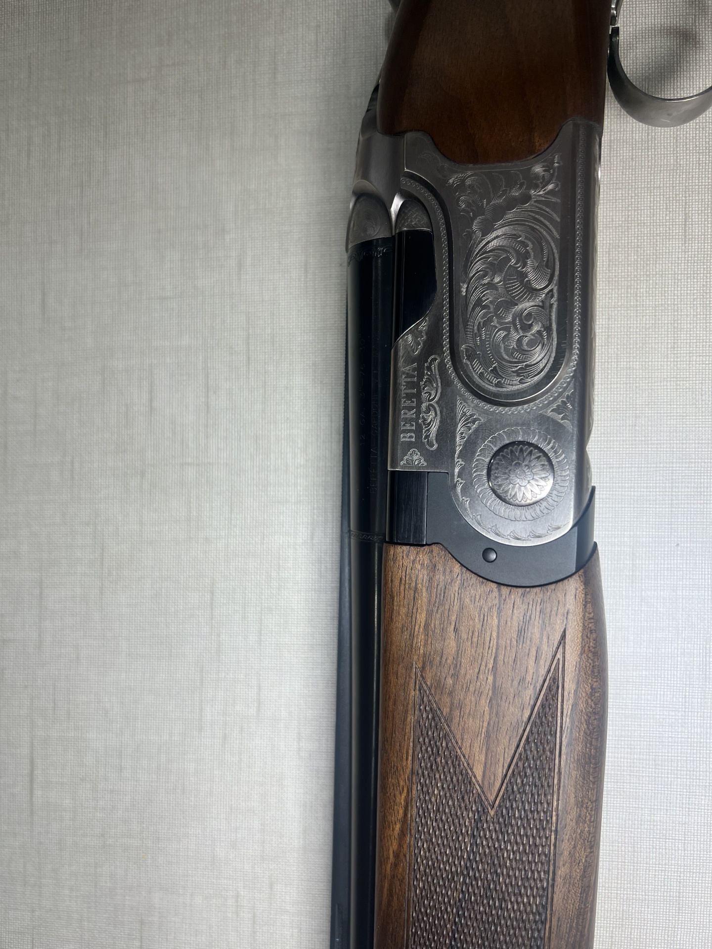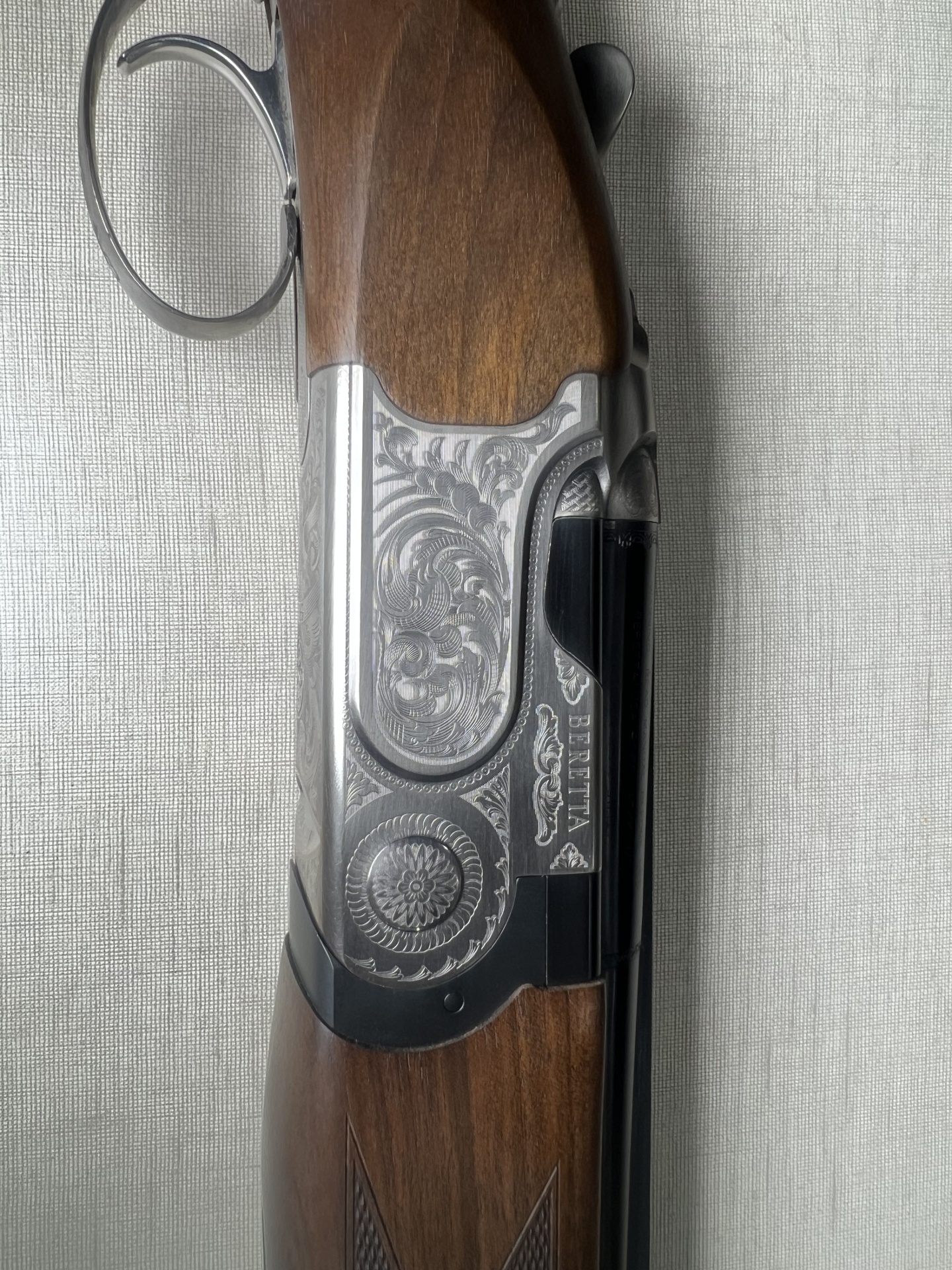 Espingarda Beretta com corpo em metal gravado e madeira polida
