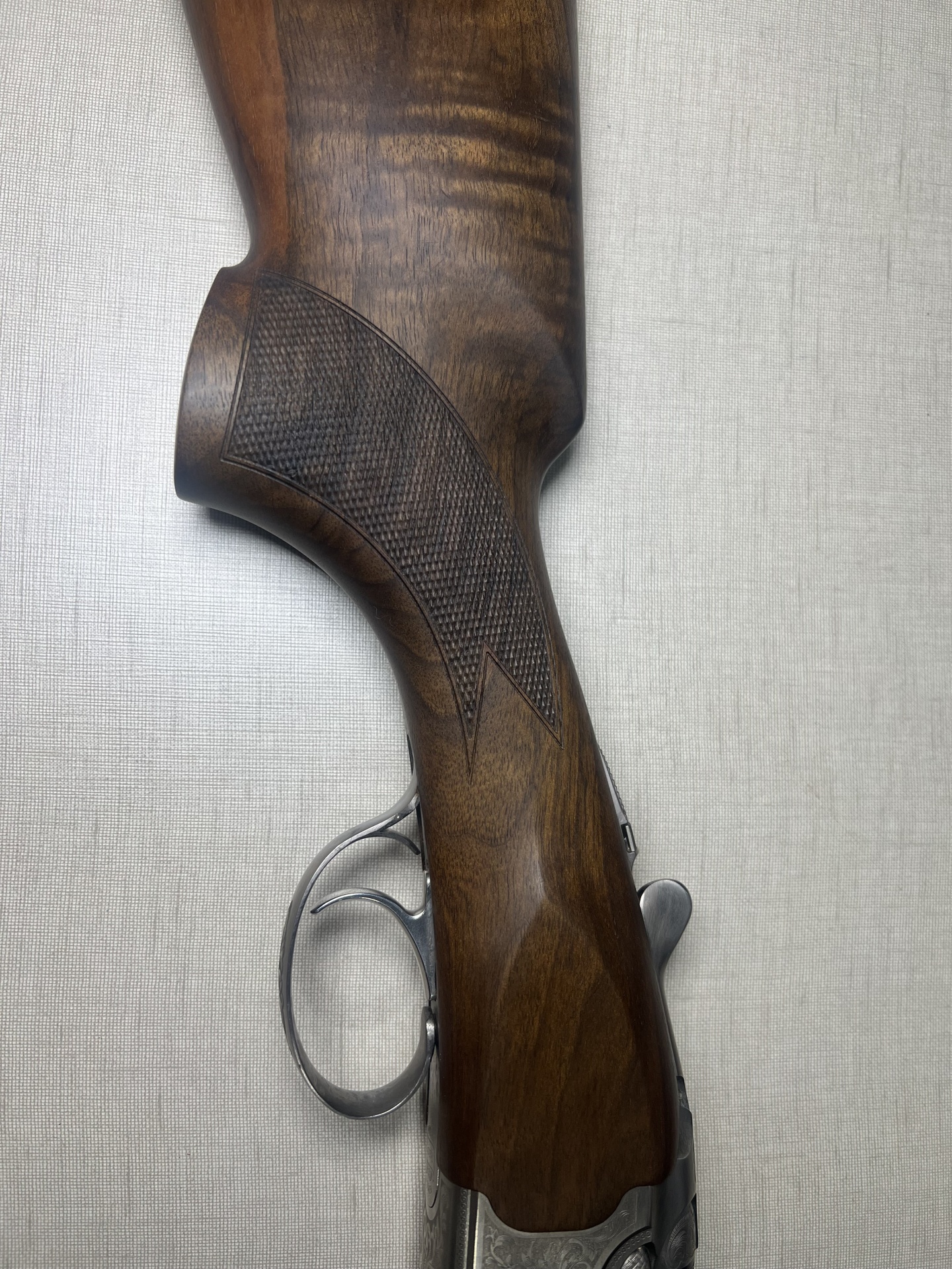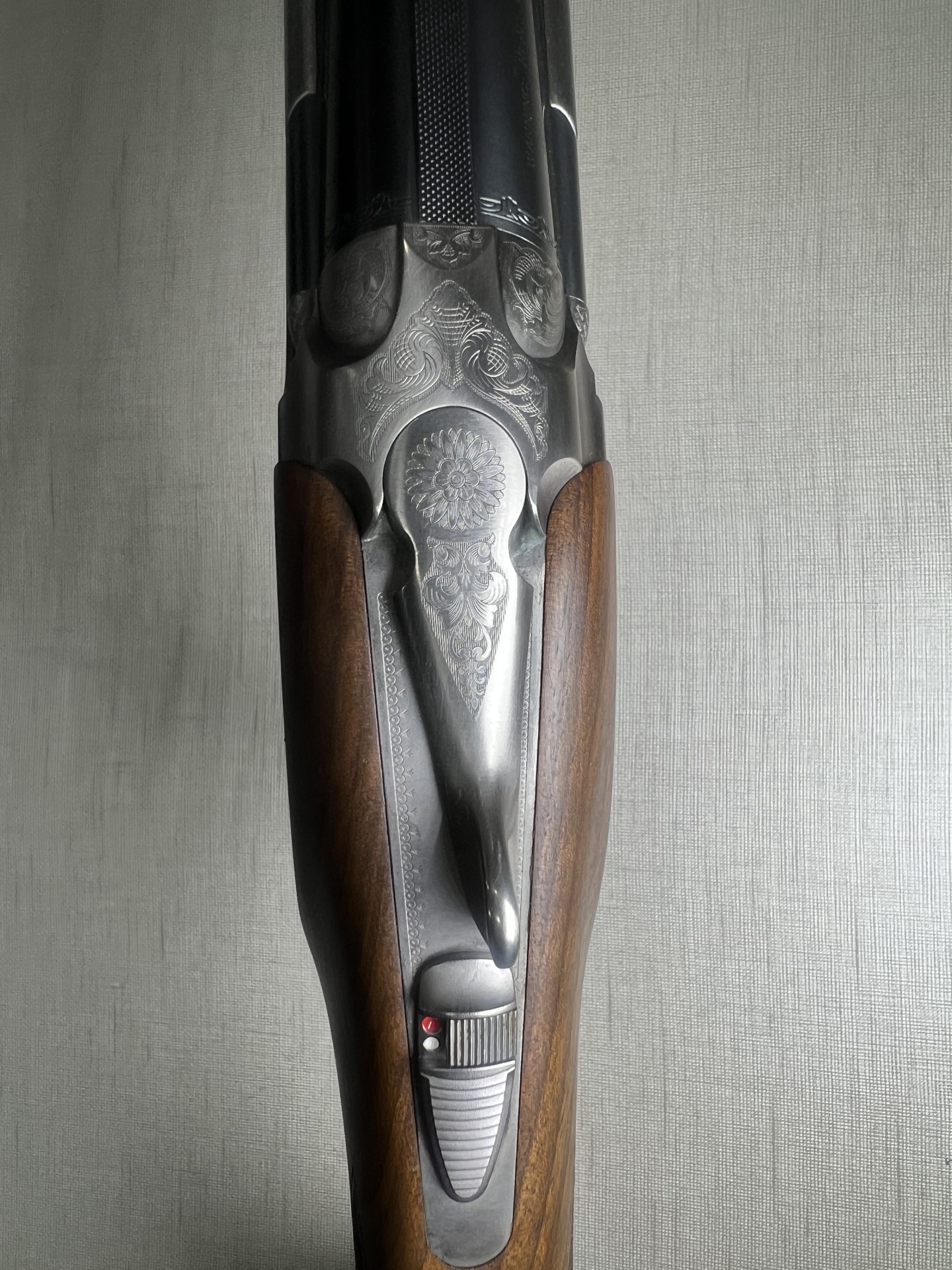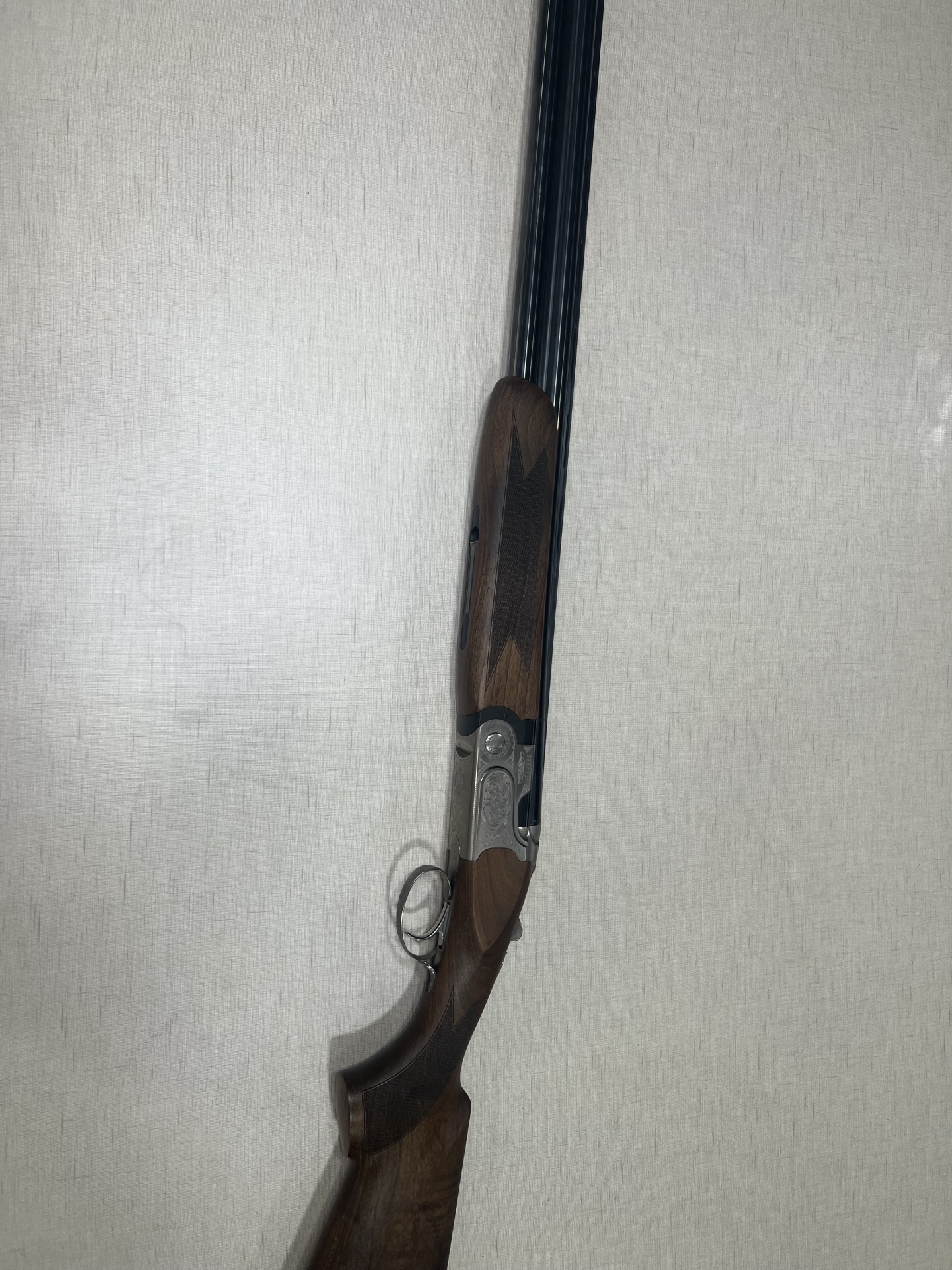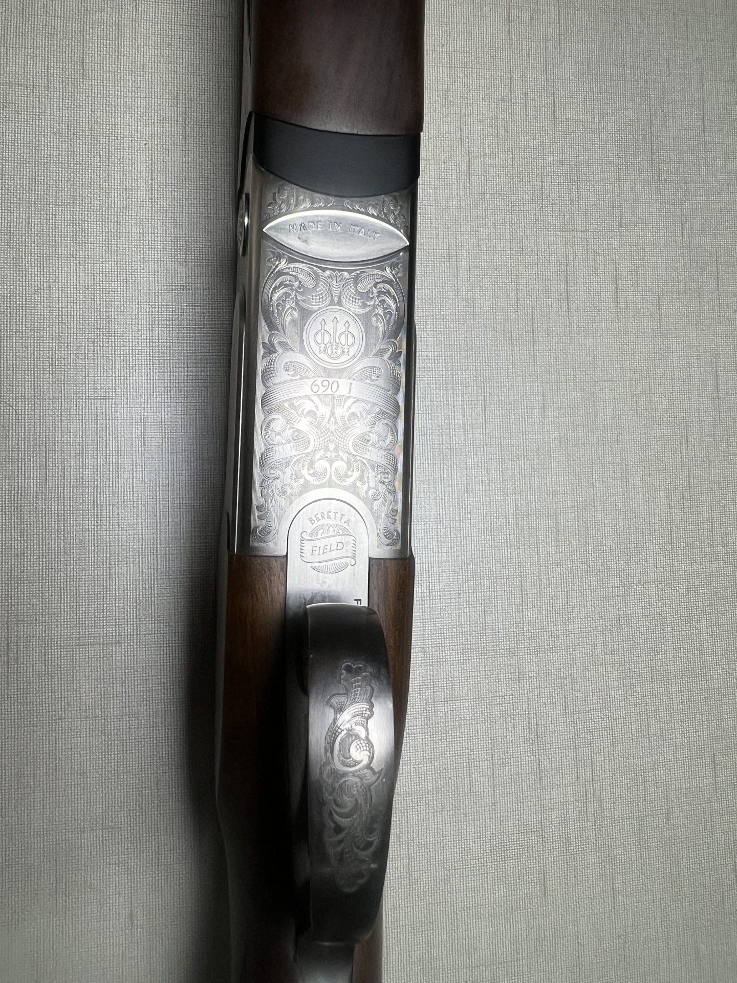 Espingarda Beretta com corpo em metal gravado e madeira polida