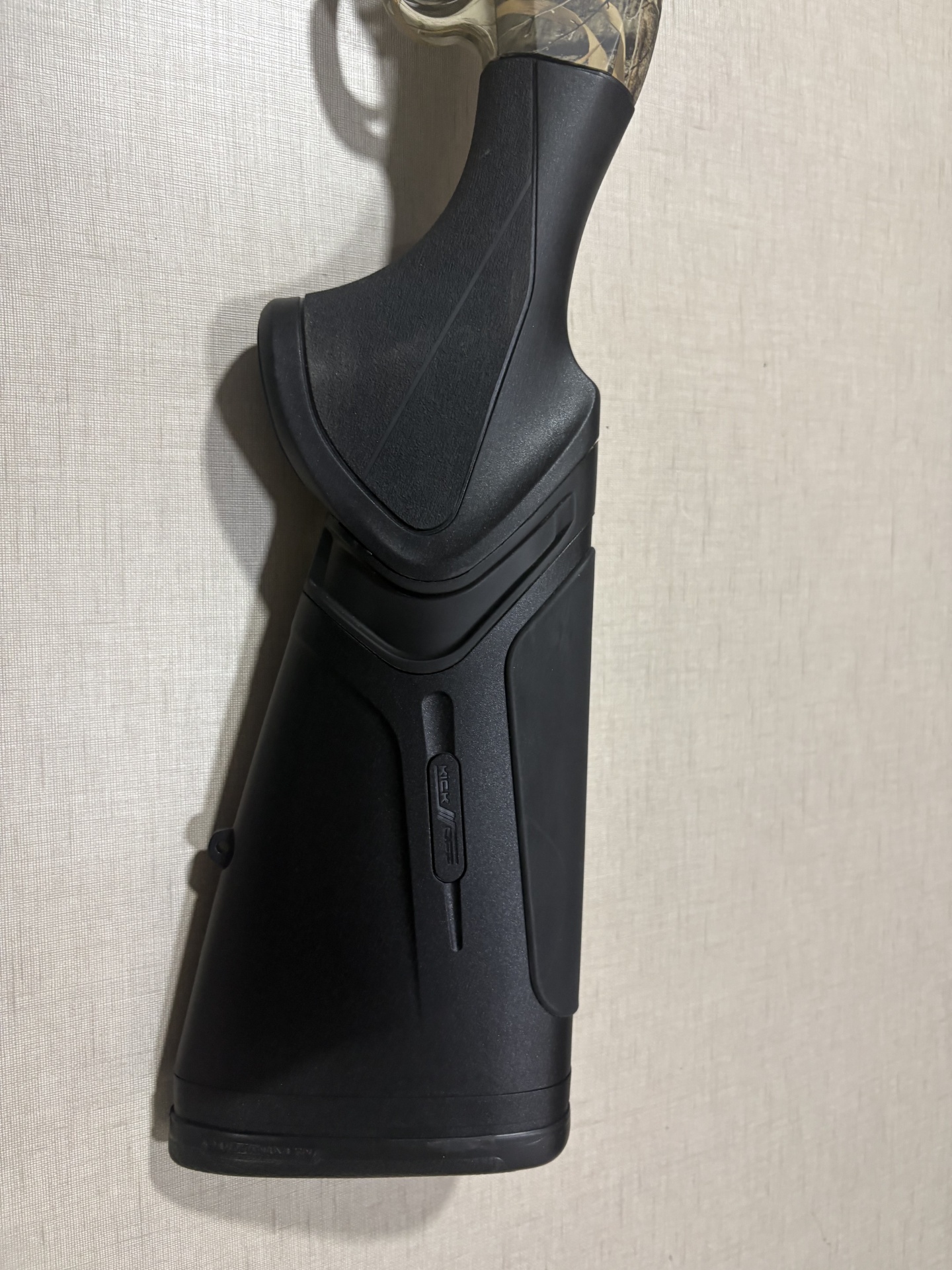 Coronha de arma preta com textura antiderrapante e marcação KICK em relevo