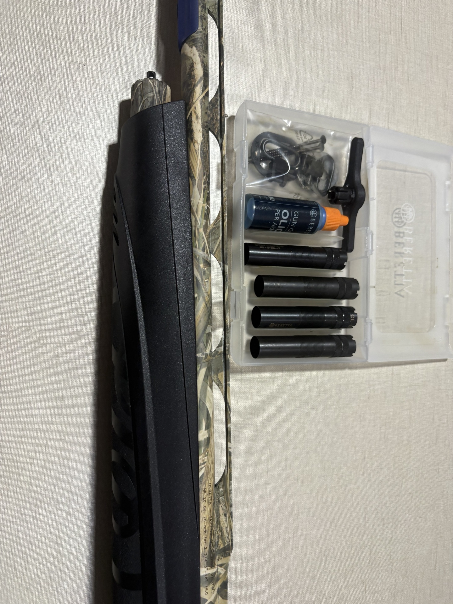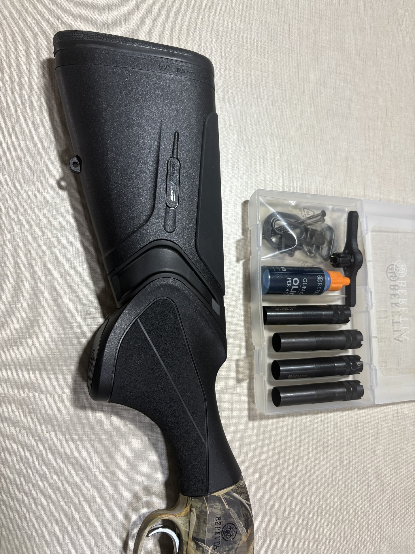 Coronha preta de espingarda Beretta ao lado de estojo transparente com chokes metálicos e acessórios.