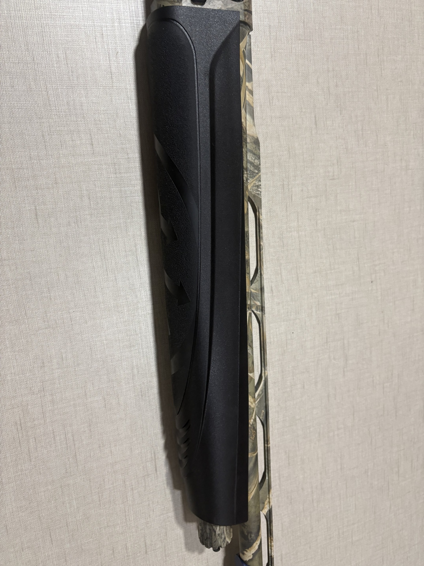 Espingarda em padrão camuflado com guarda-mão preto texturizado encostada numa parede clara
