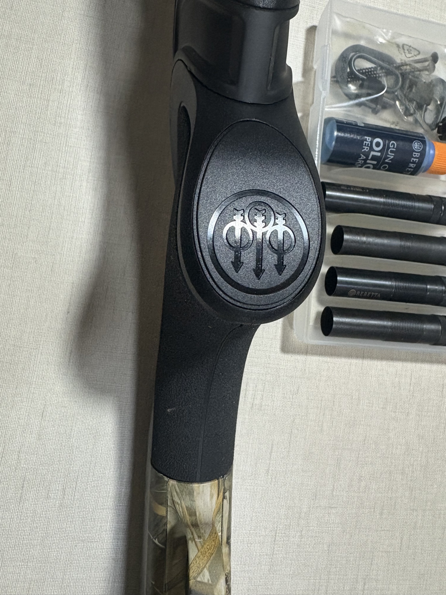 Punho de arma Beretta preto e camuflado com acessórios e óleo para armas.