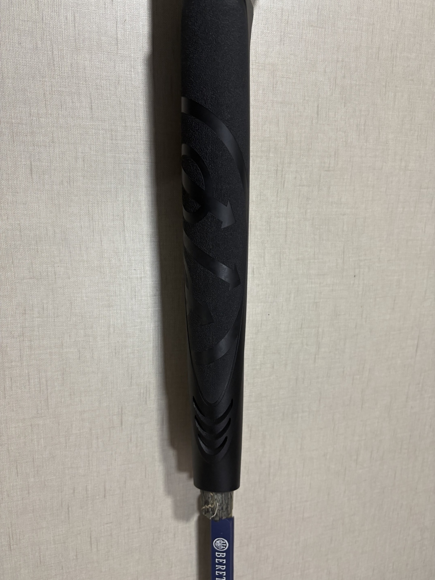 Empunhadura preta texturada com design circular e setas, haste azul com texto BERETTA
