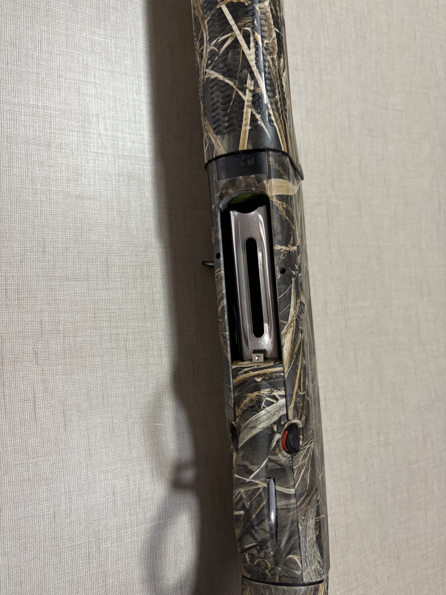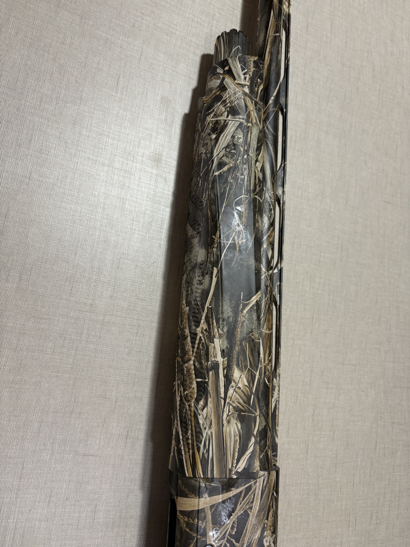 Espingarda de caça camuflada preta, cinza e bege com padrão de ramos