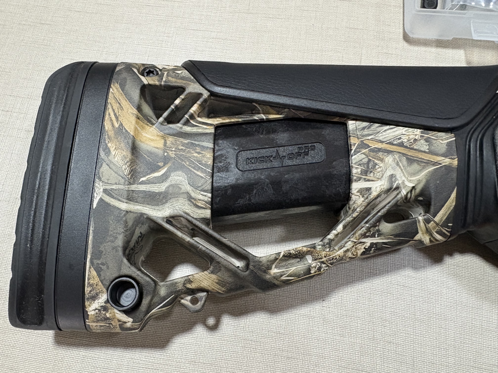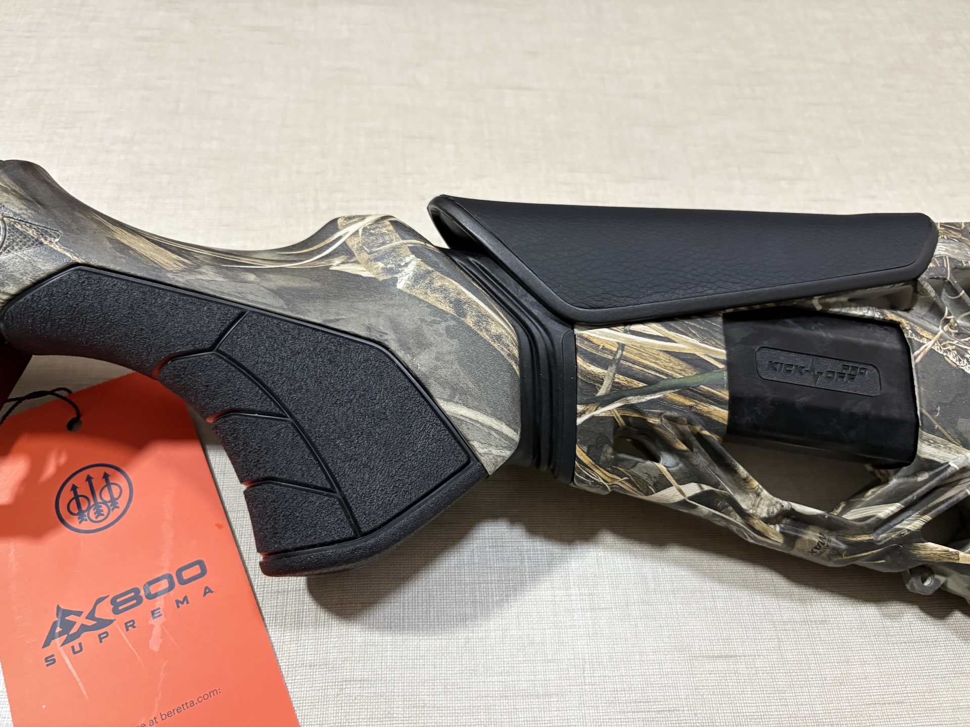 Parte traseira de espingarda camuflada AX800 SUPREMA com punho preto e apoio KICK-OFF PRO