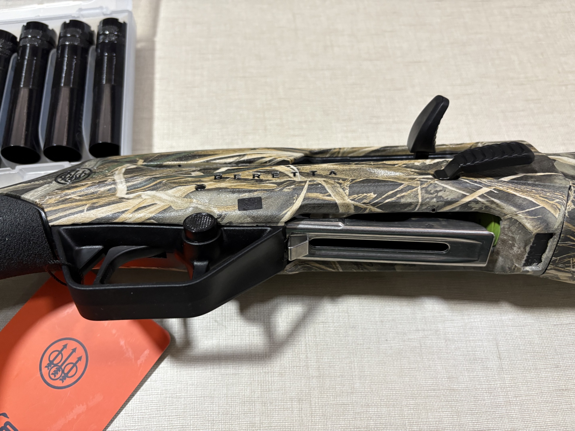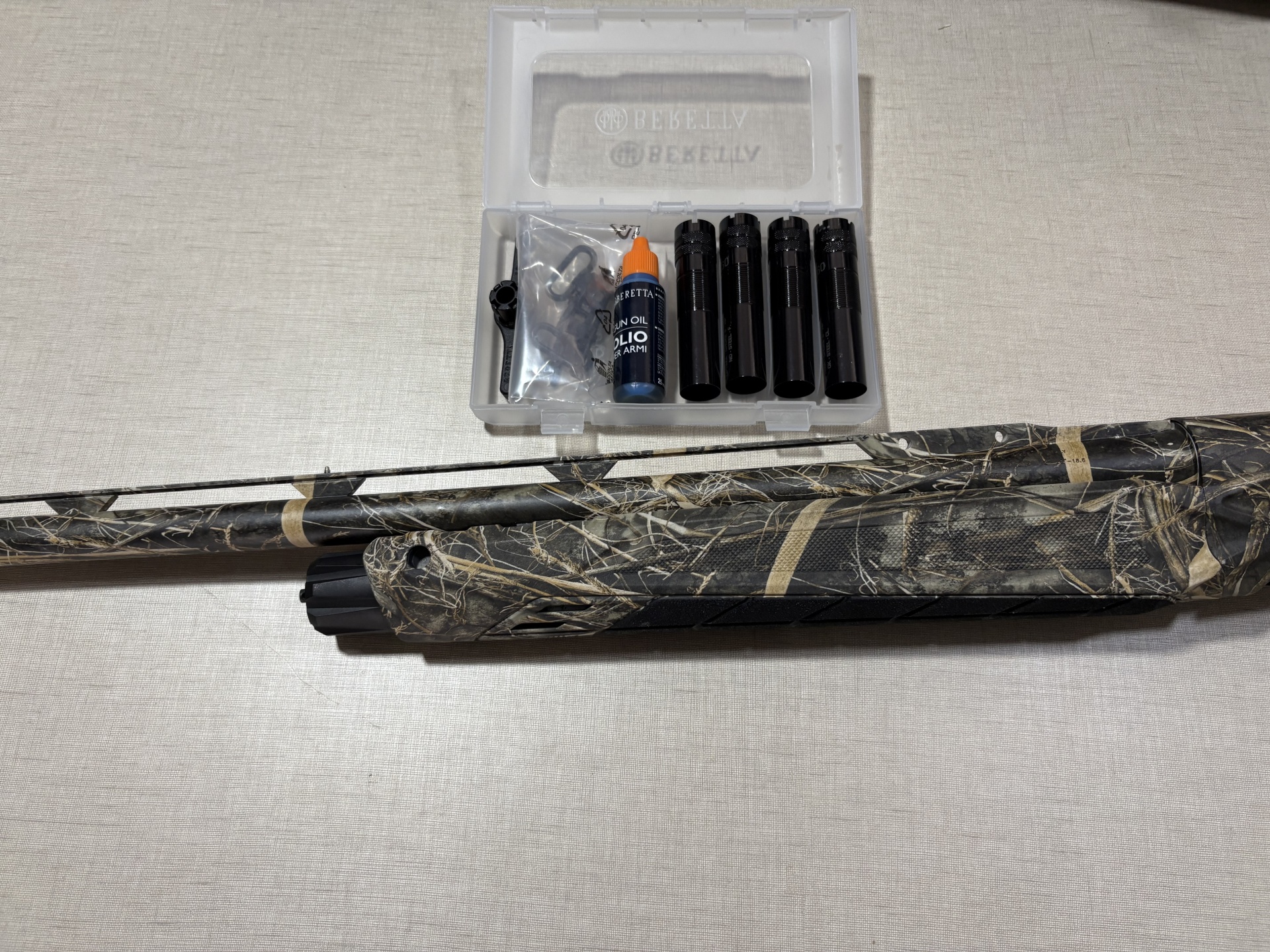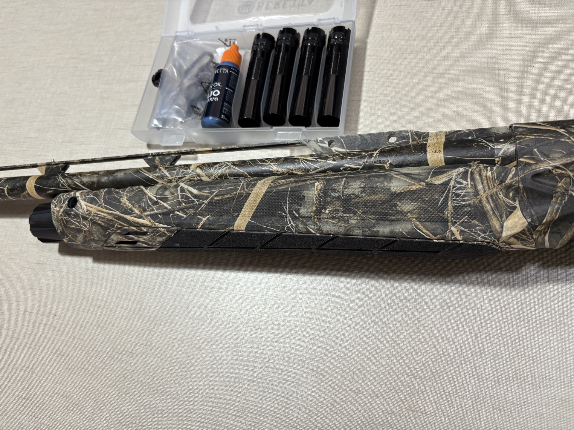 Espingarda caça Beretta camuflada A380 SUPREMA com caixa de cartuchos ao fundo