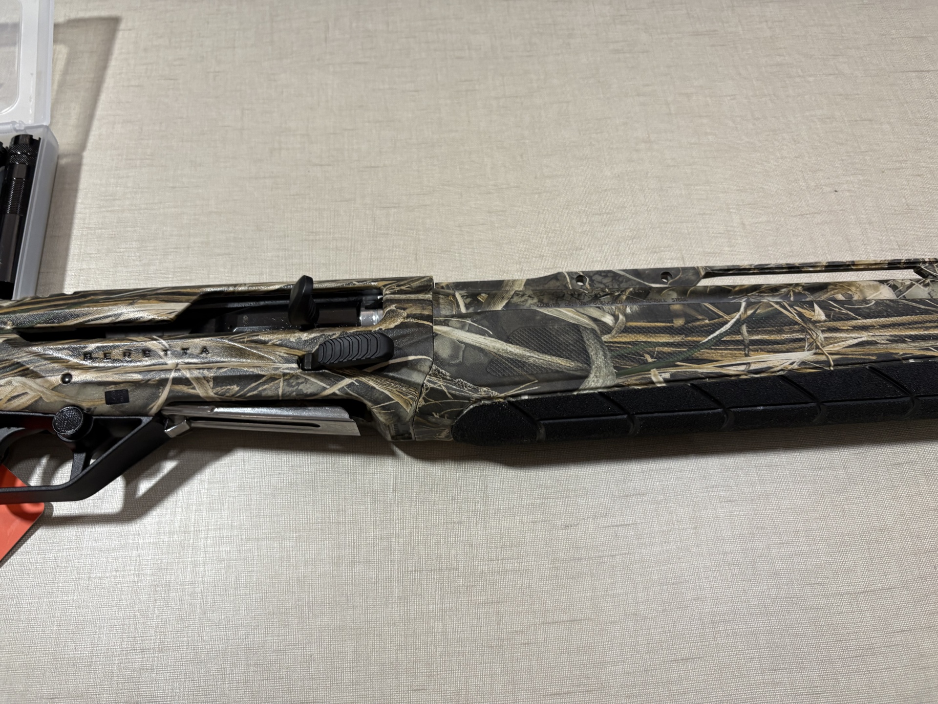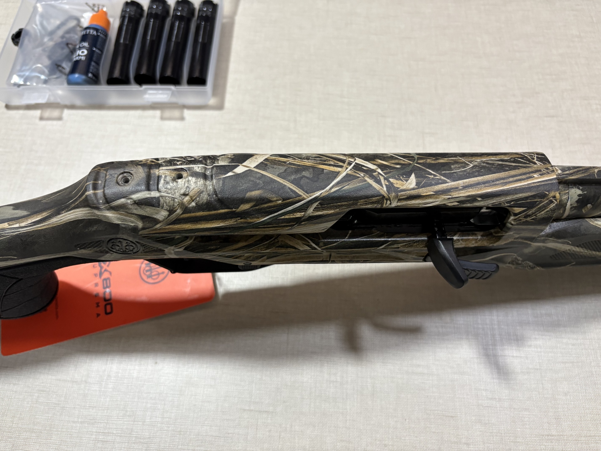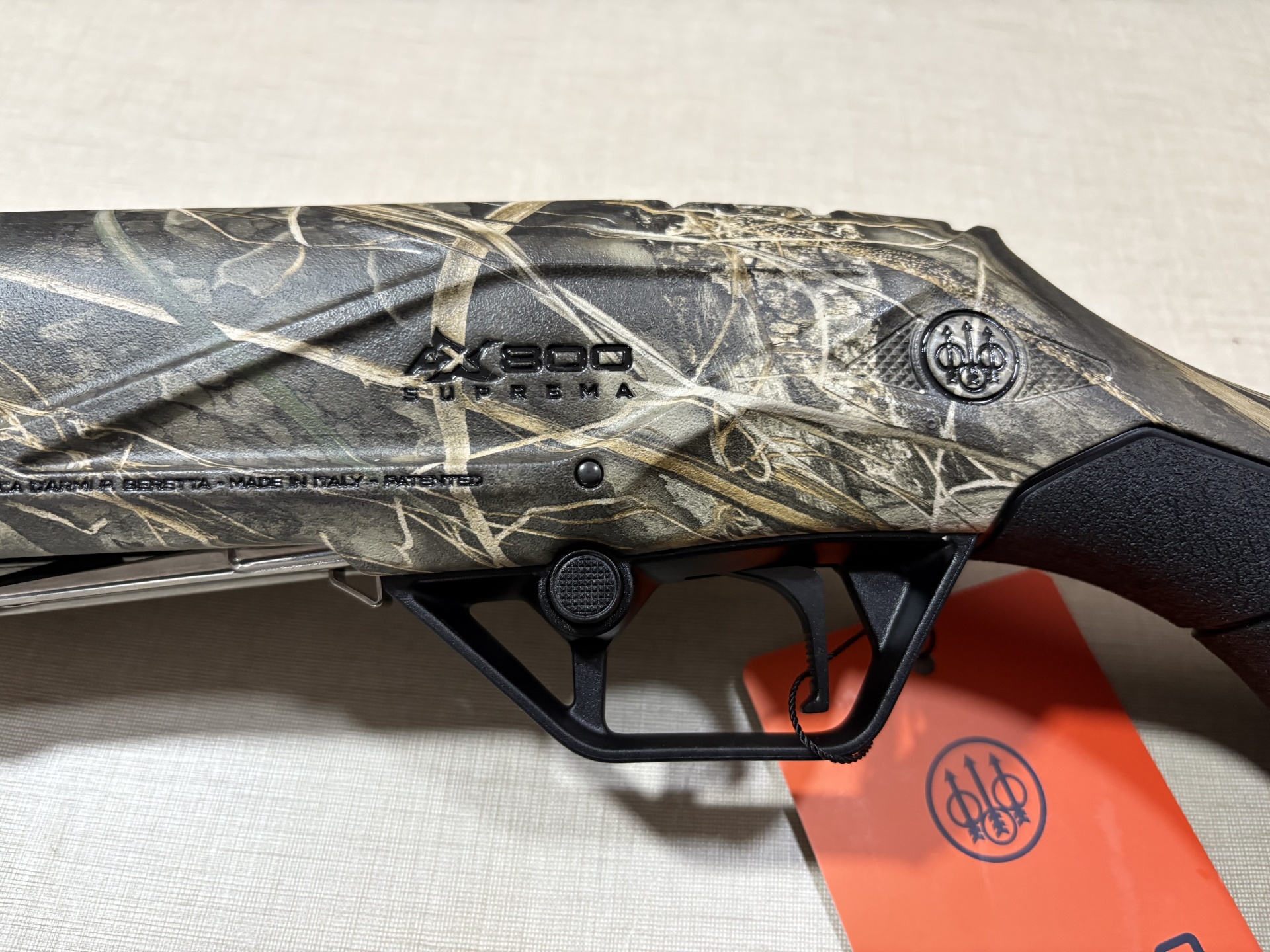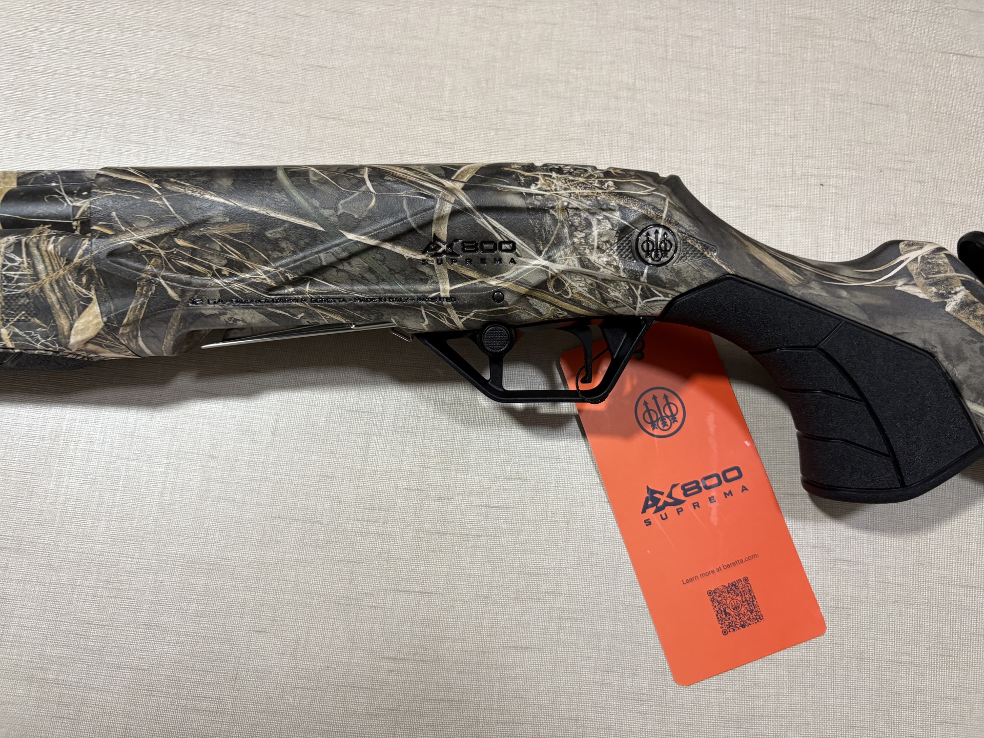 Espingarda camuflada Beretta AX800 Suprema com pega preta e etiqueta laranja sobre fundo bege.