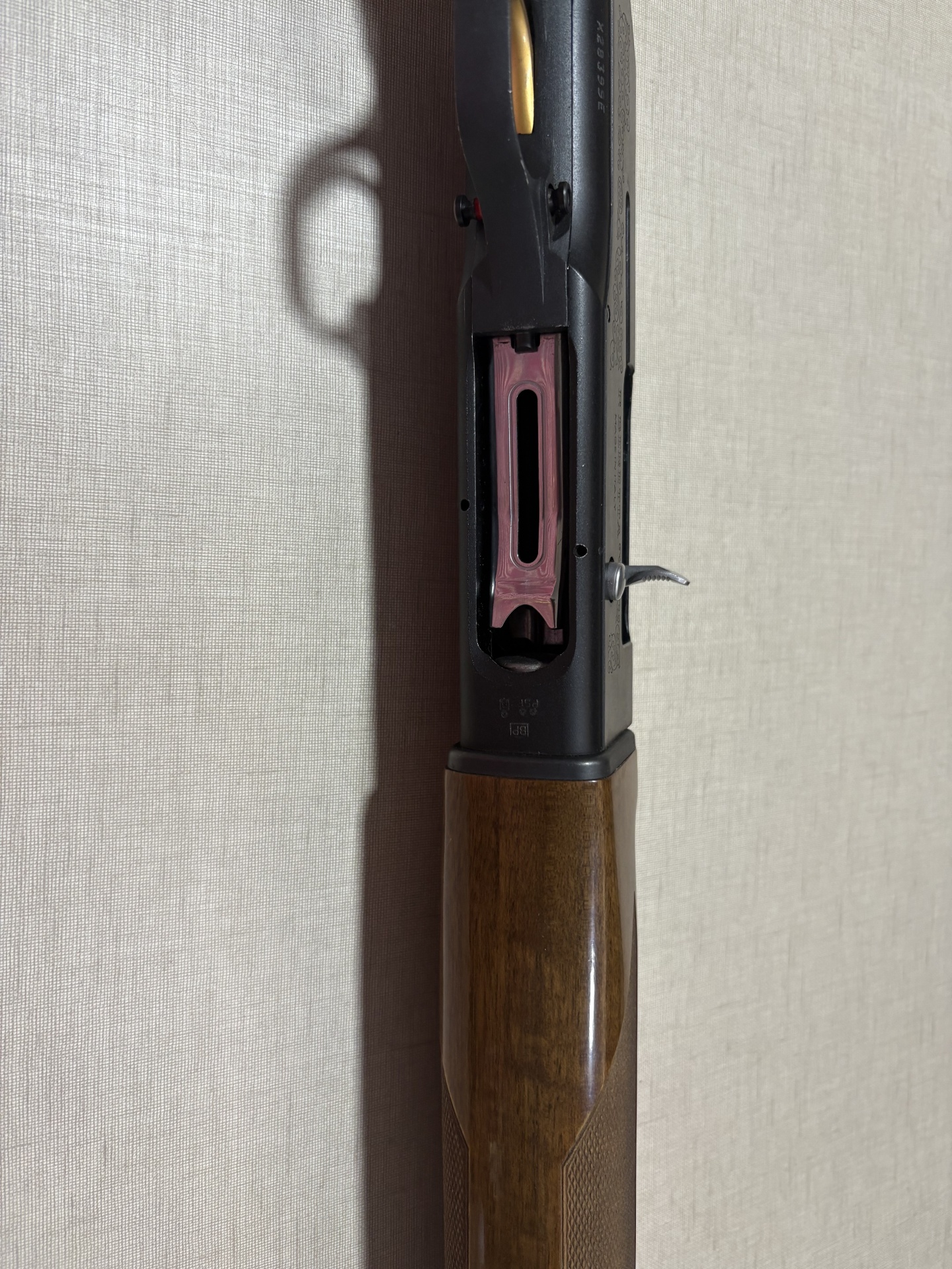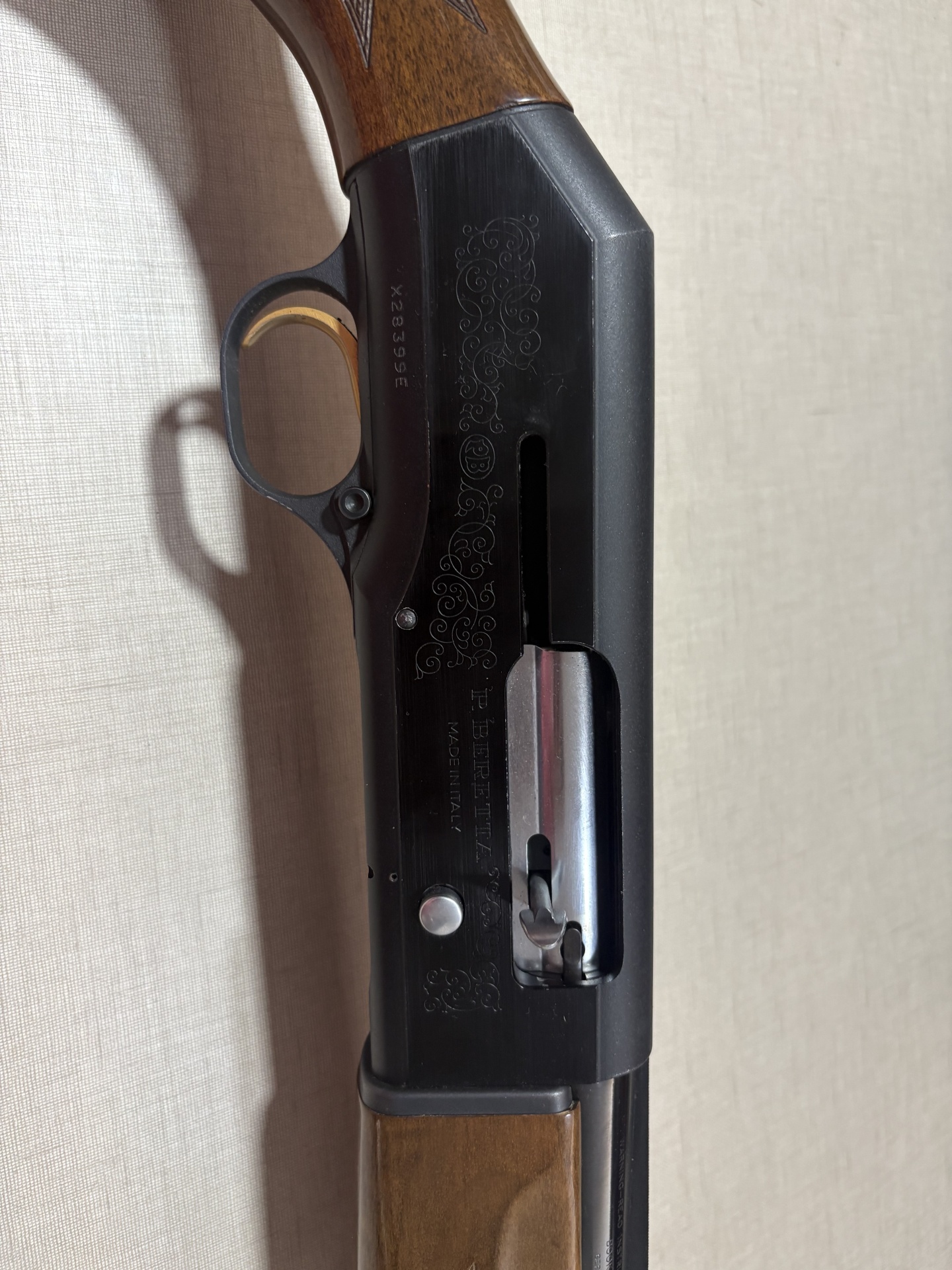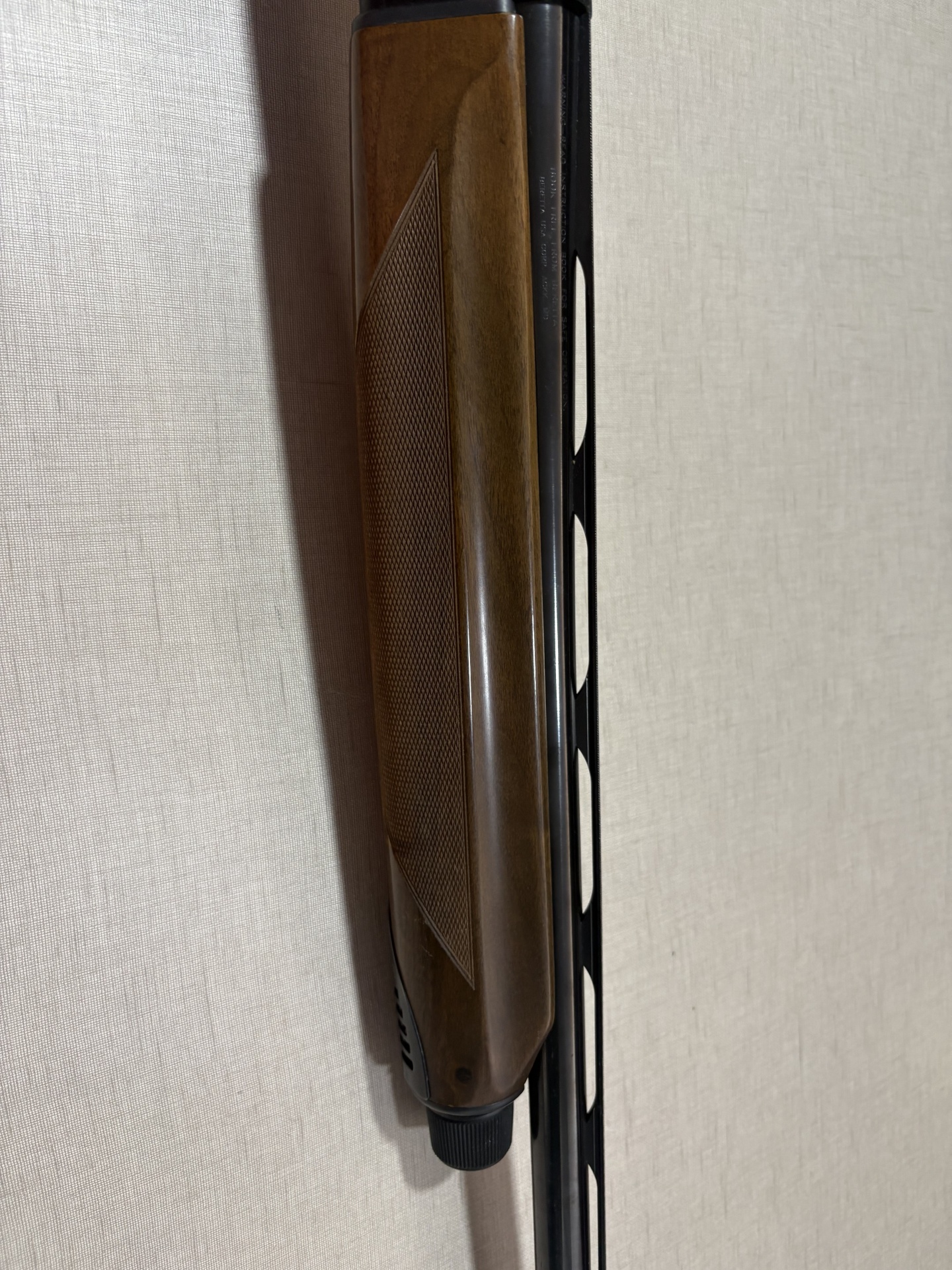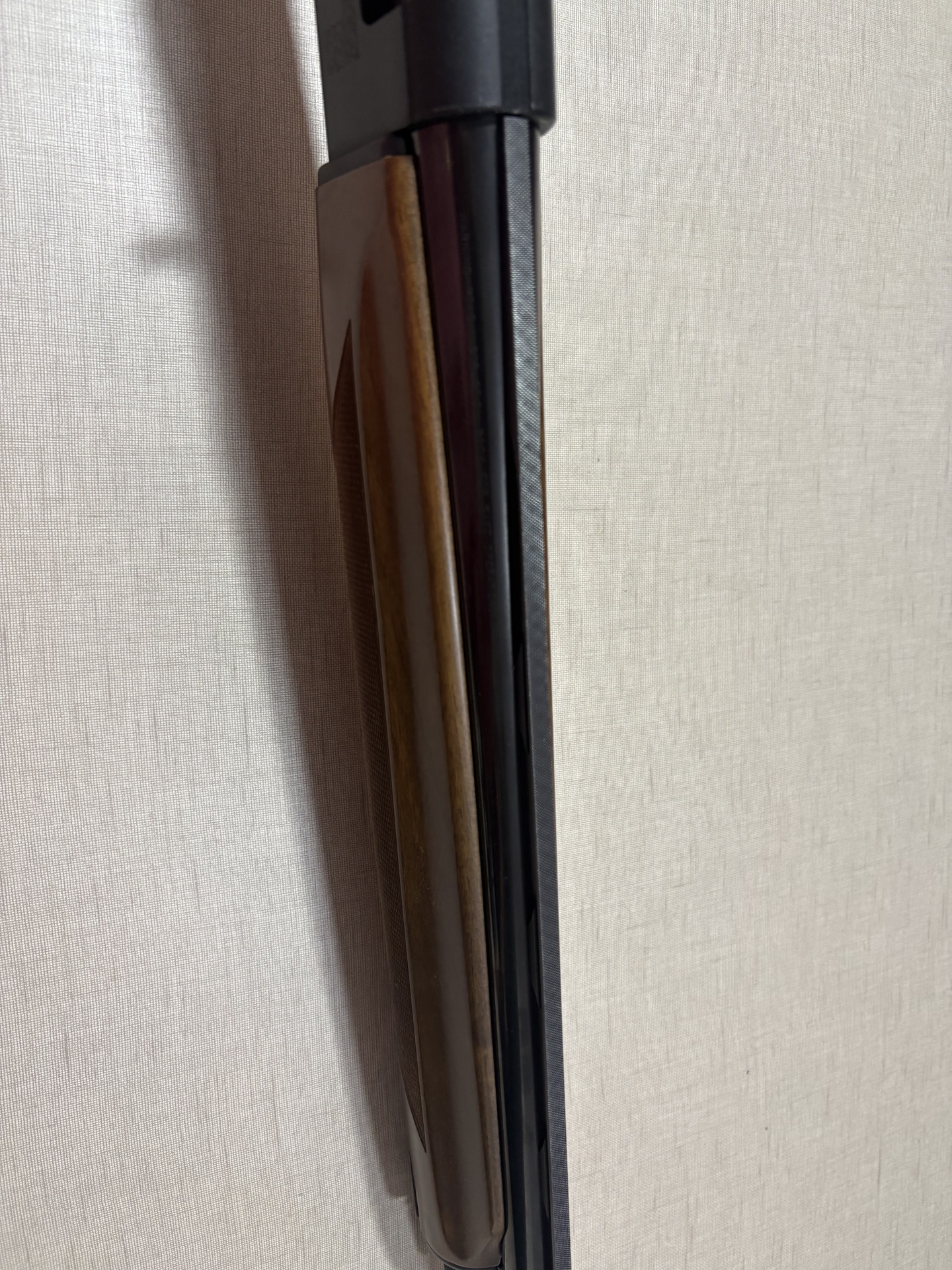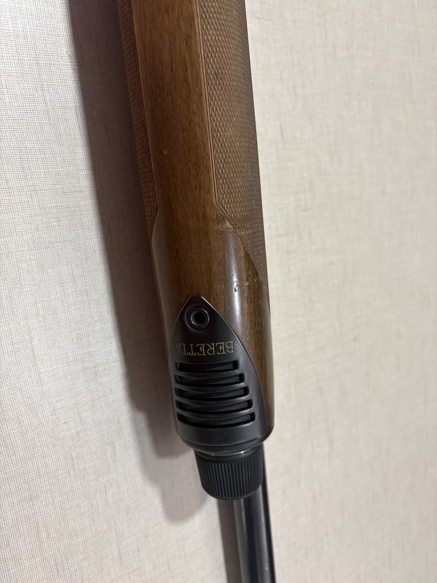 Parte de arma com coronha em madeira castanha e peça preta com escrita BERETTA