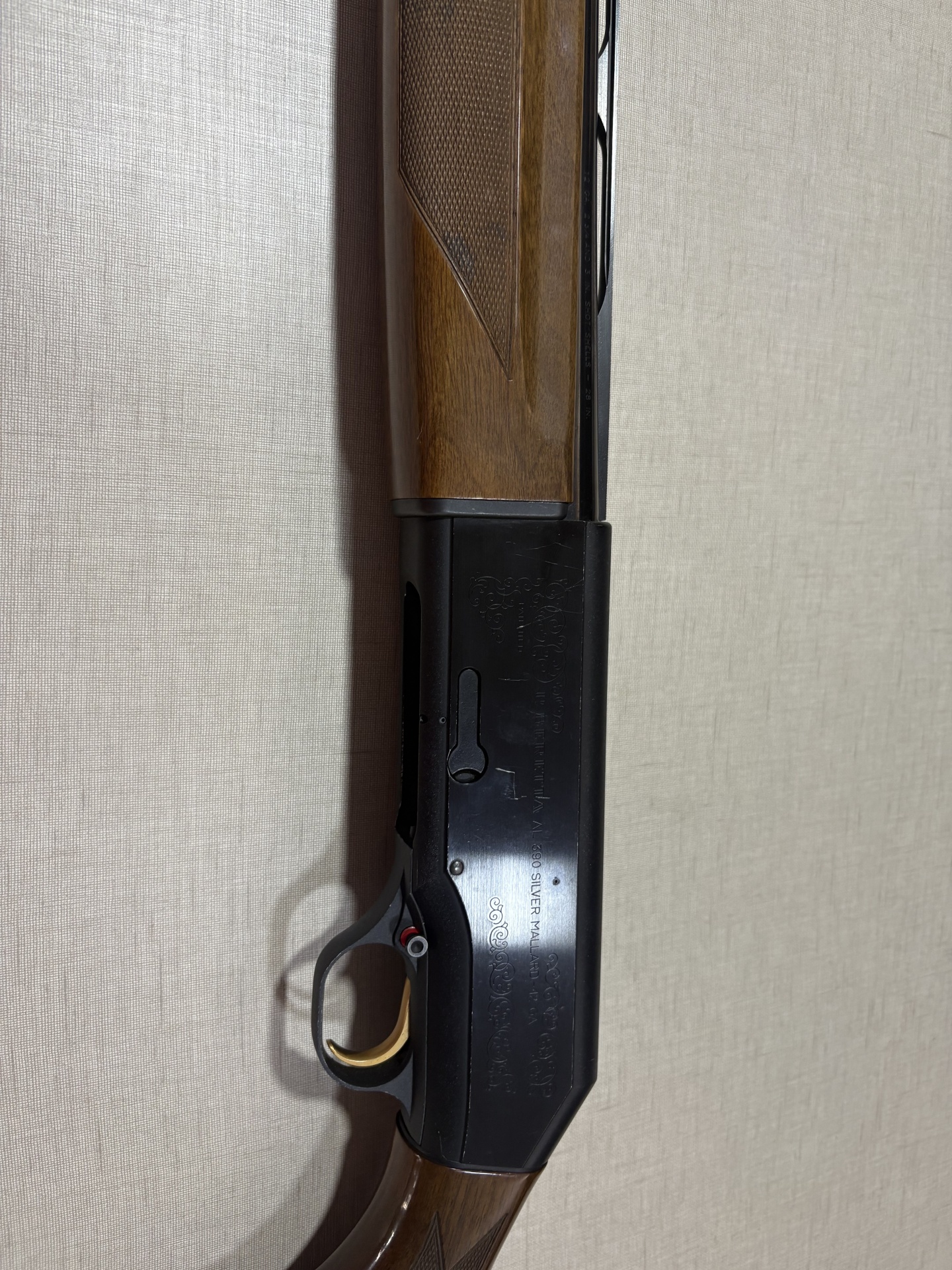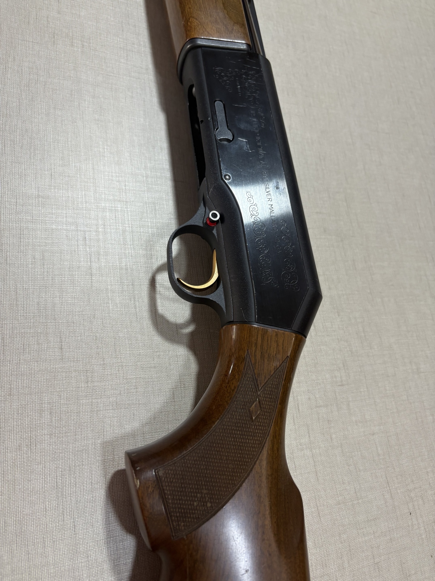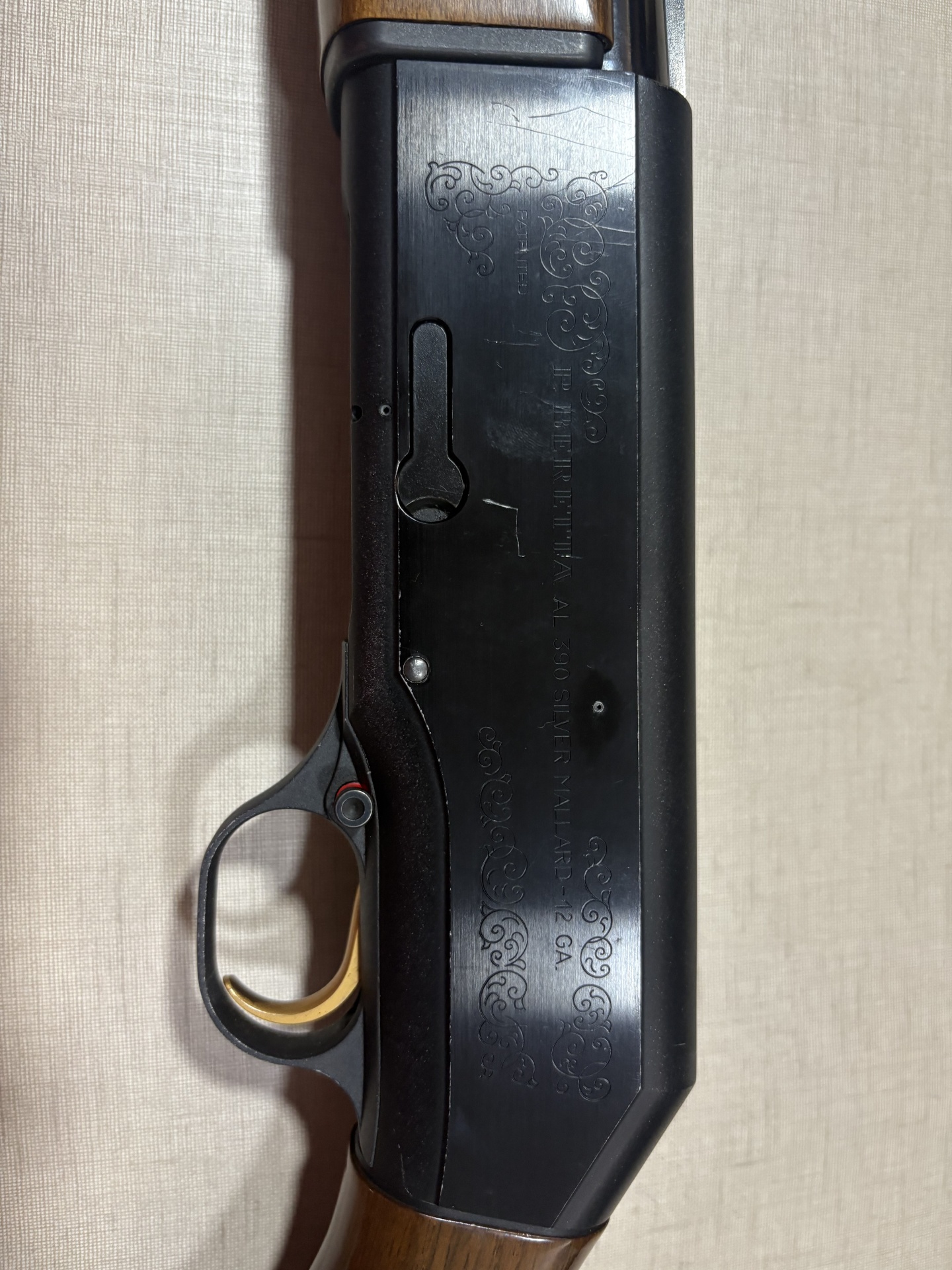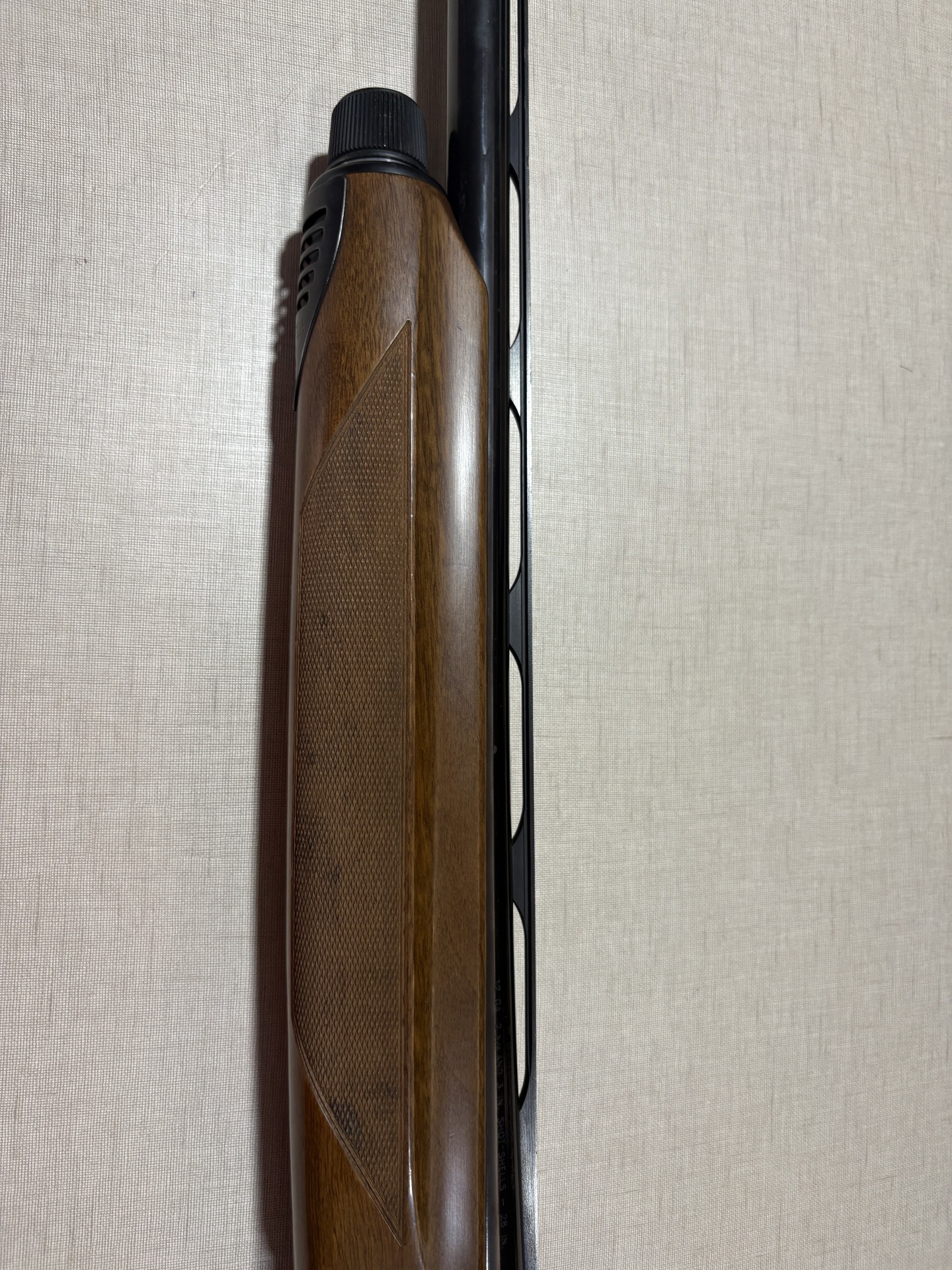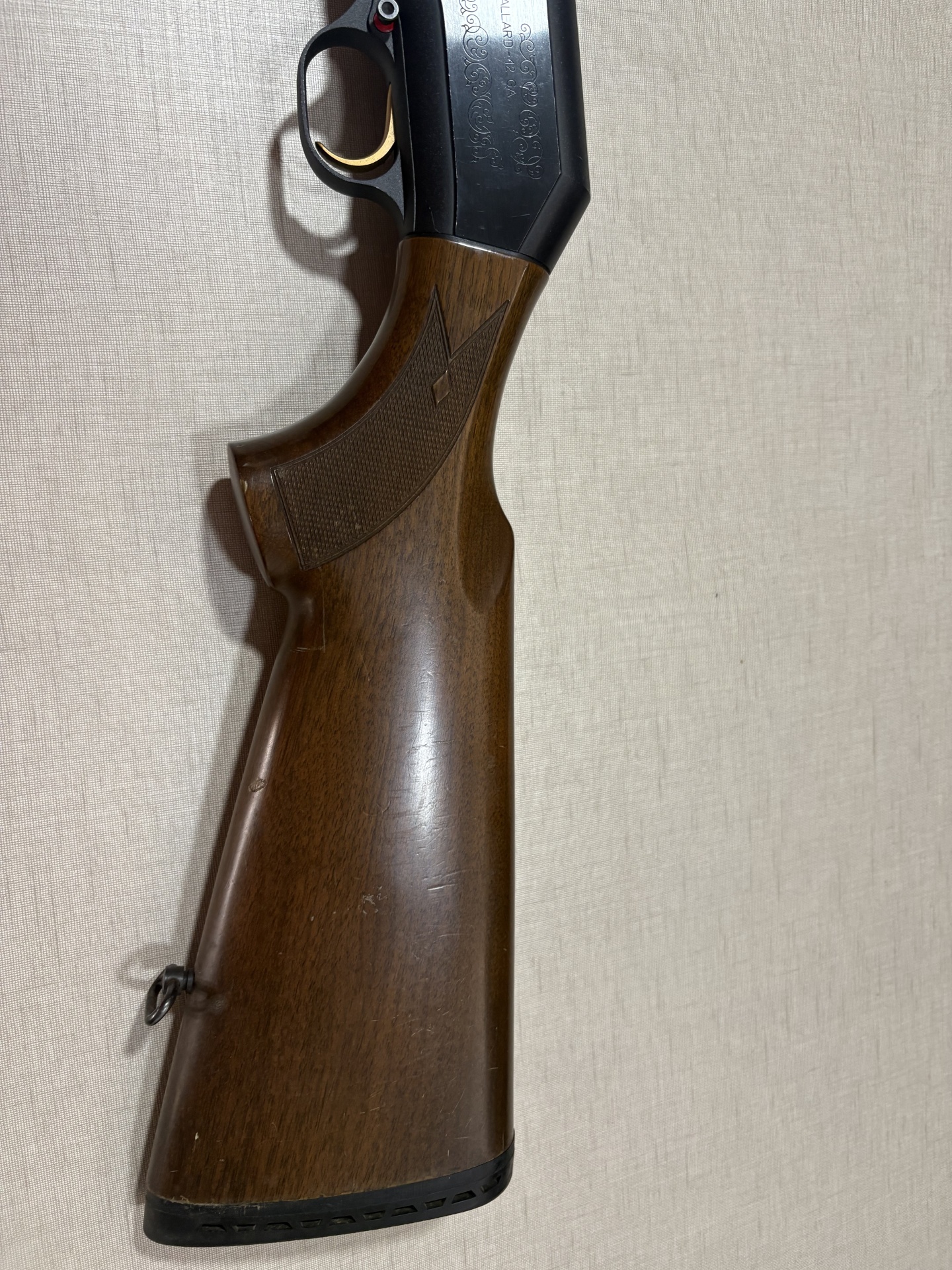 Parte de arma com coronha em madeira castanha e peça preta com escrita BERETTA