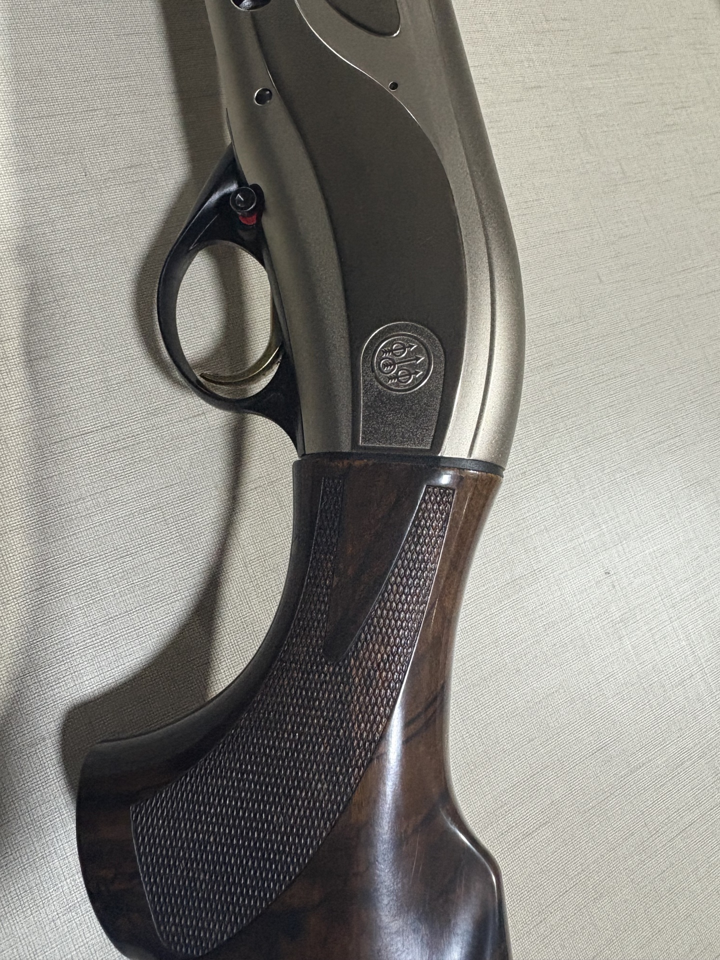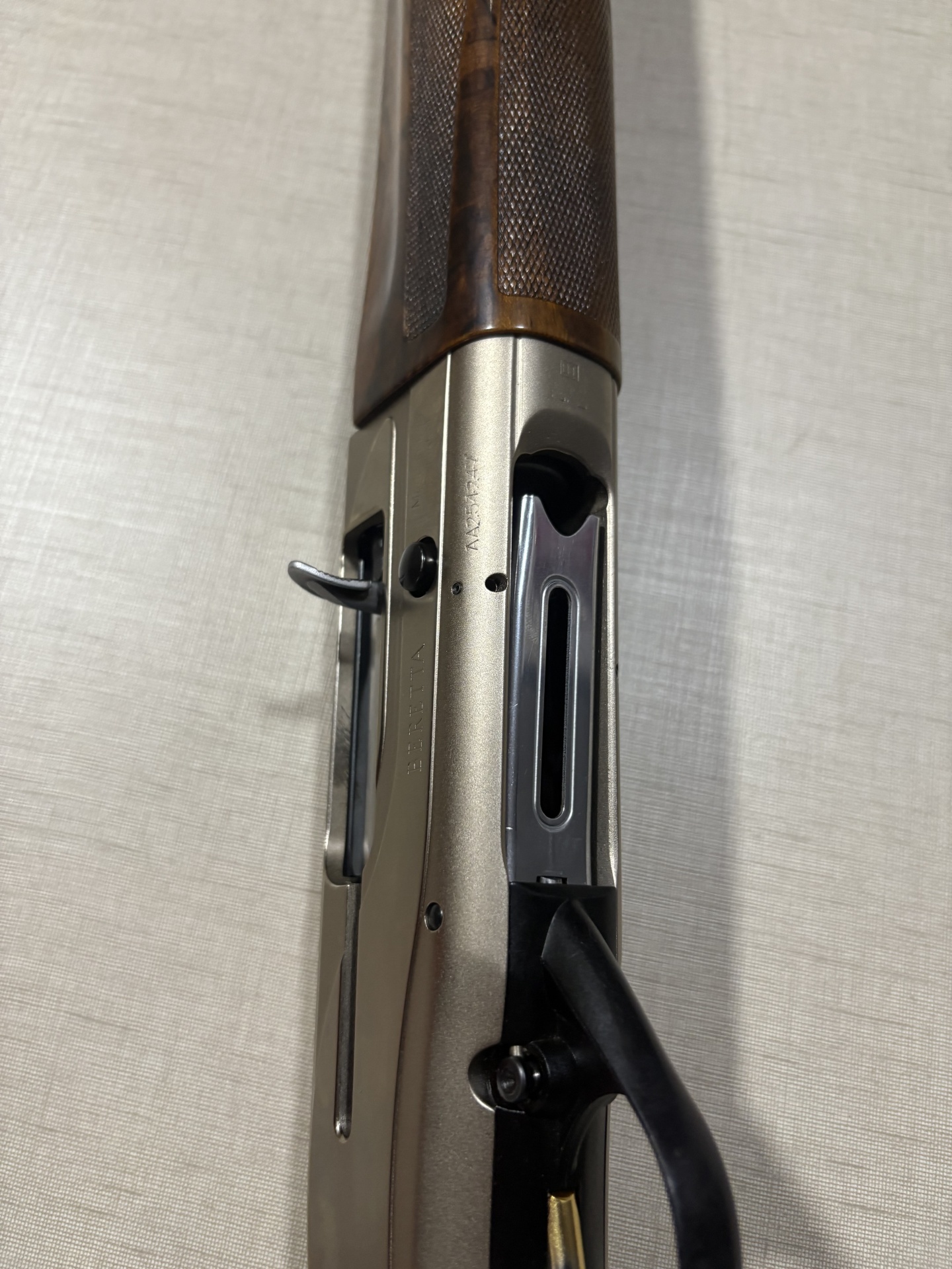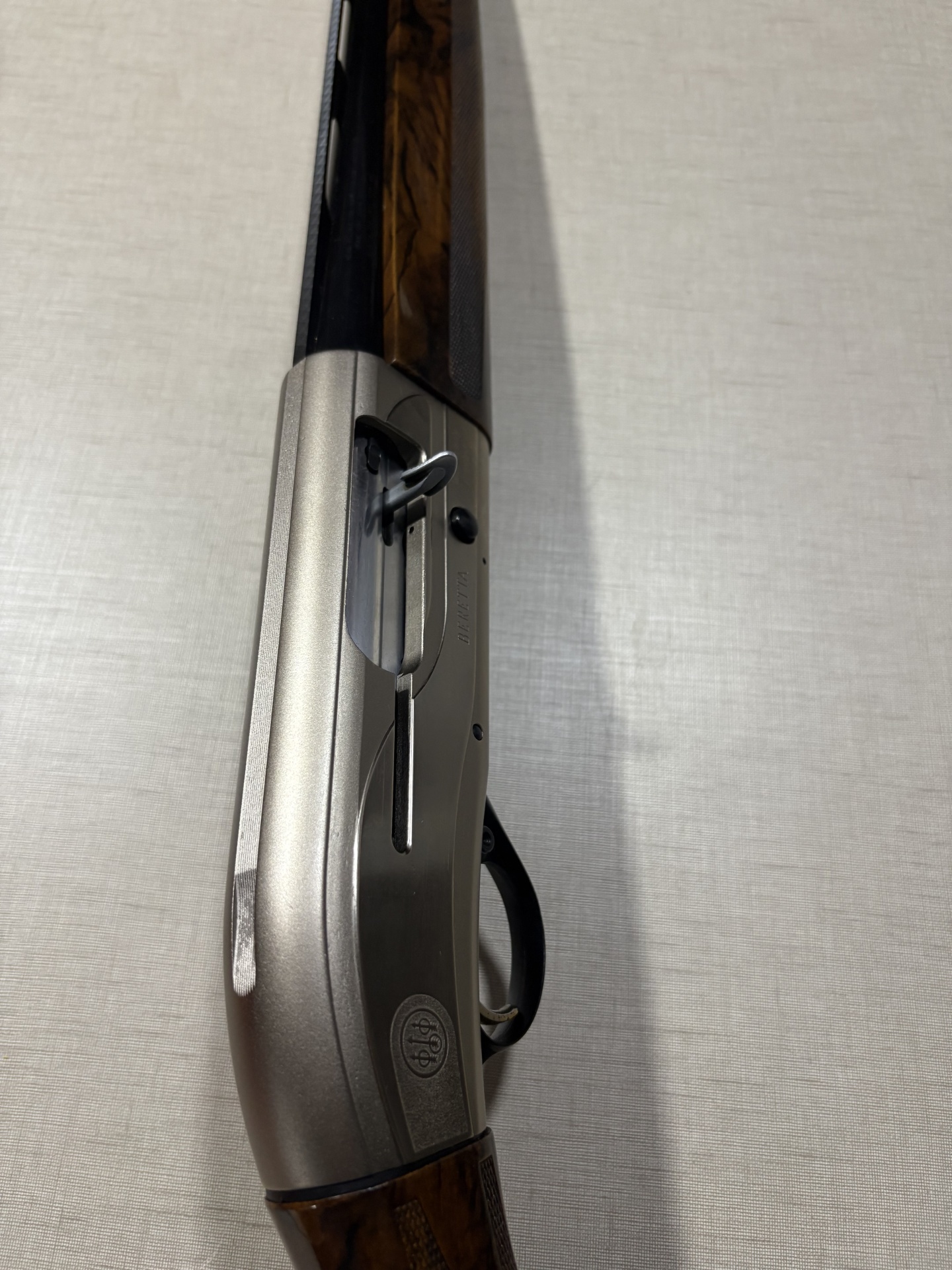 Espingarda Beretta com detalhes em madeira castanha e metal prateado