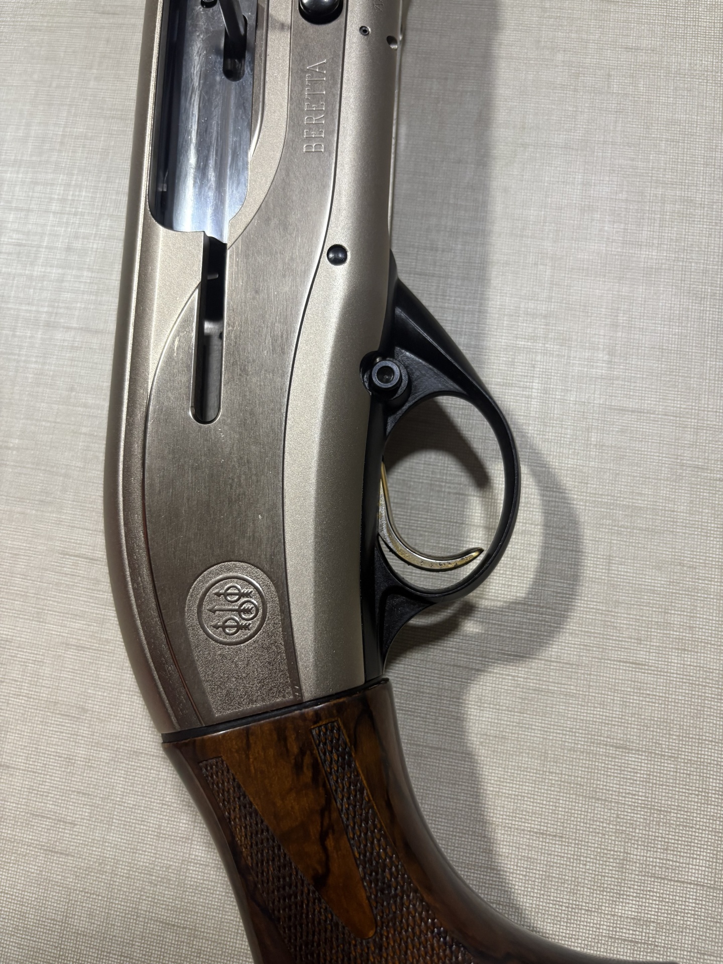 Parte central de espingarda Beretta com corpo metálico e empunhadura de madeira