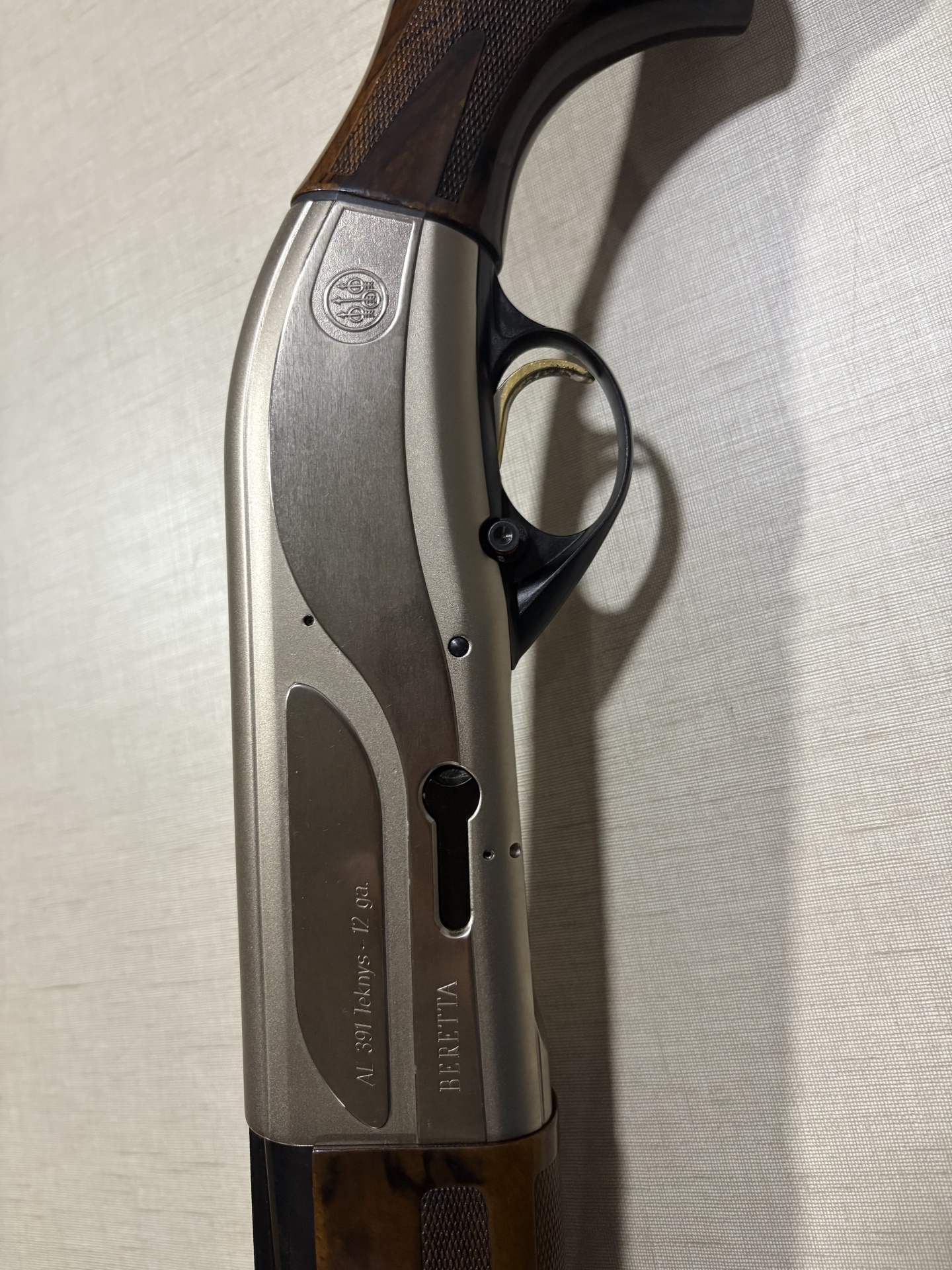 Espingarda automática em metal cinzento e madeira com texto gravado BERETTA e AL 391 Tehkys - 12 ga