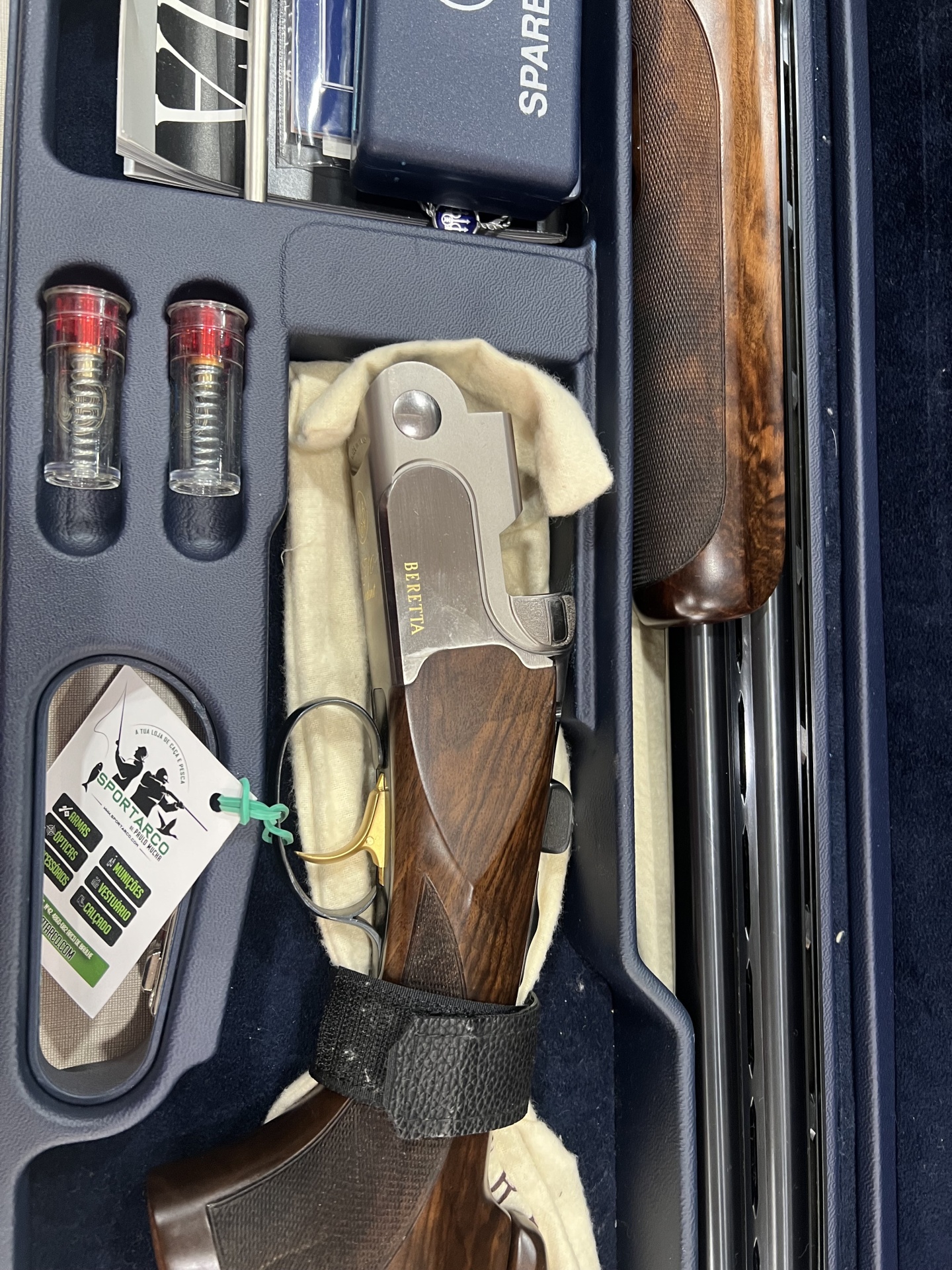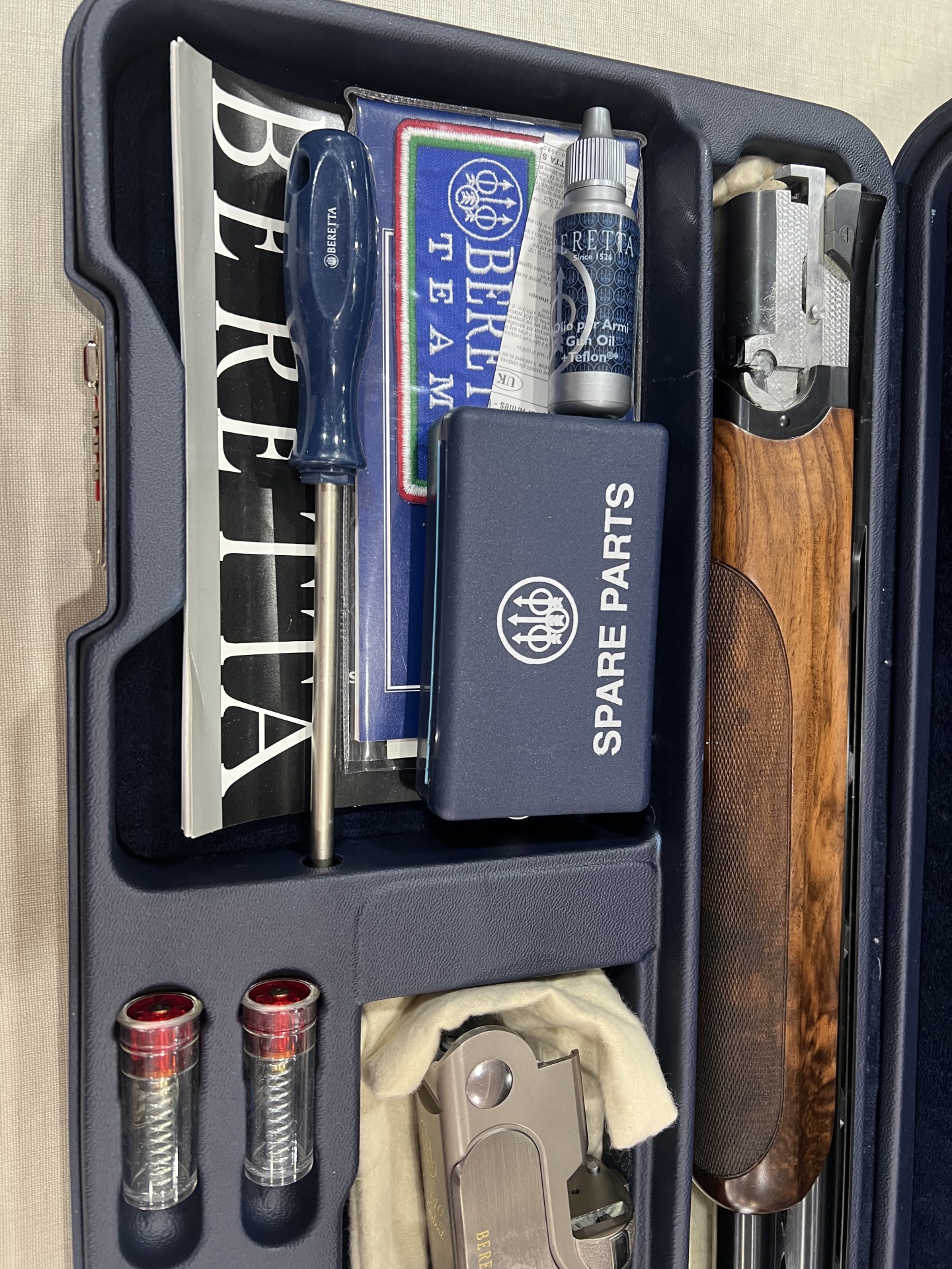 Estojo azul com espingarda Beretta desmontada em madeira e metal, cartuchos e manual