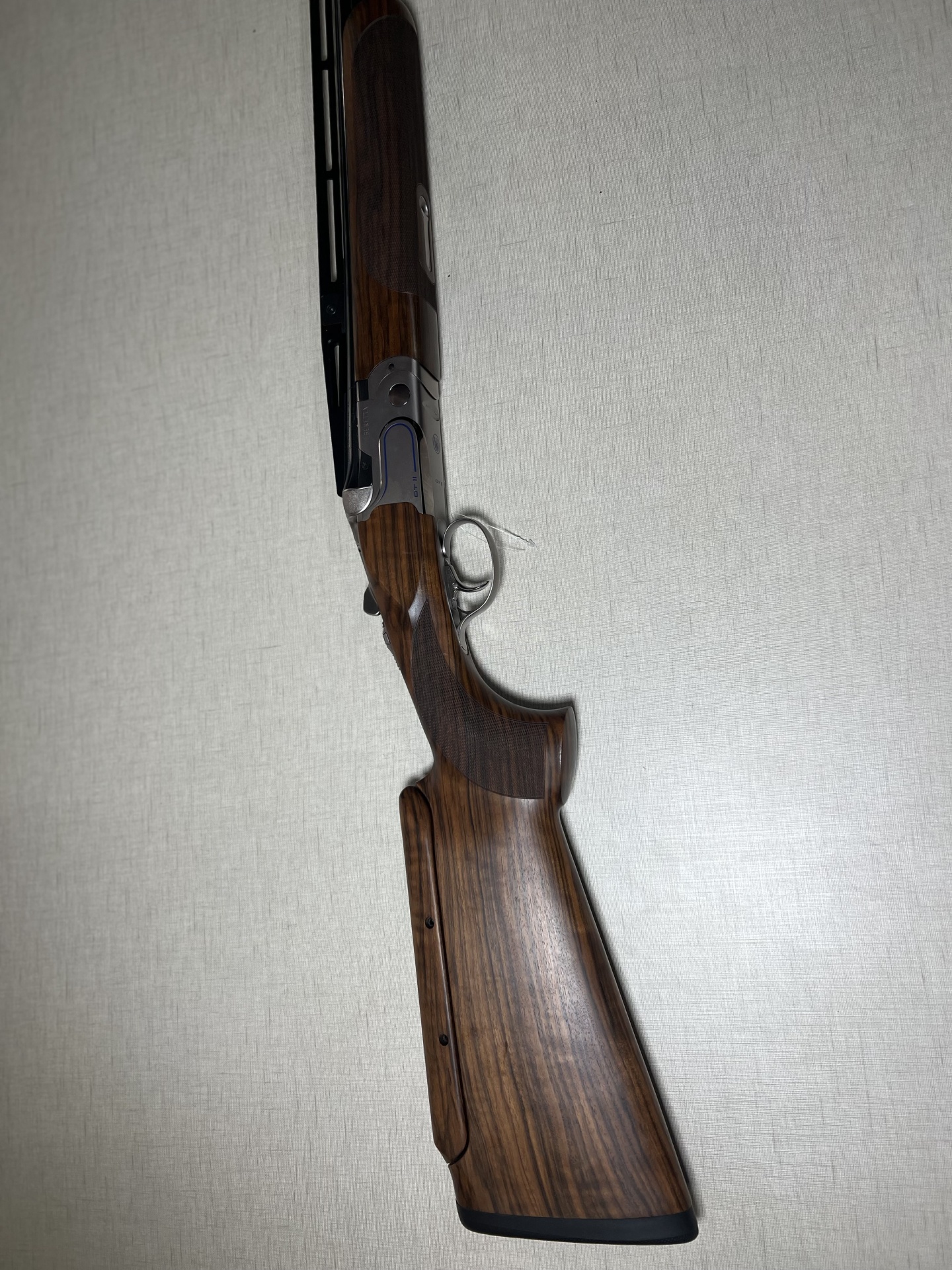 Espingarda de cano duplo com madeira castanha e detalhes metálicos