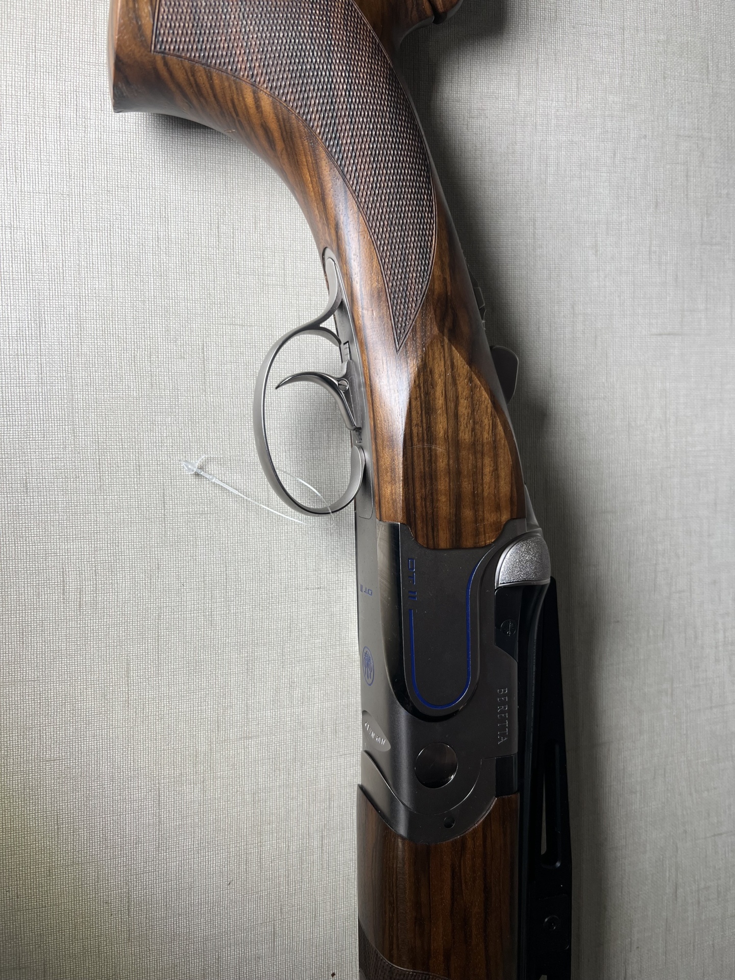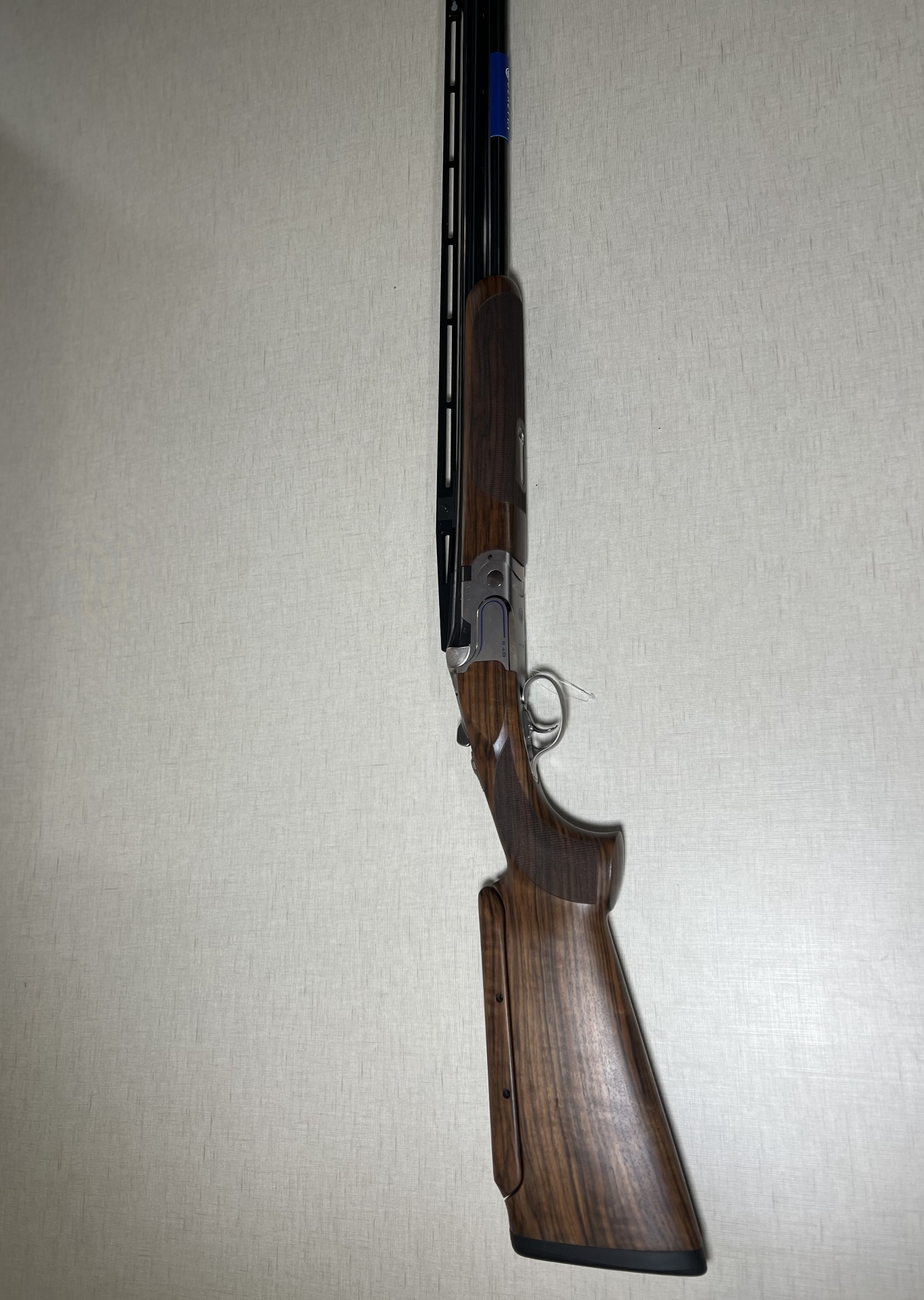 Espingarda de madeira e metal com inscrições e símbolo da marca sobre superfície clara