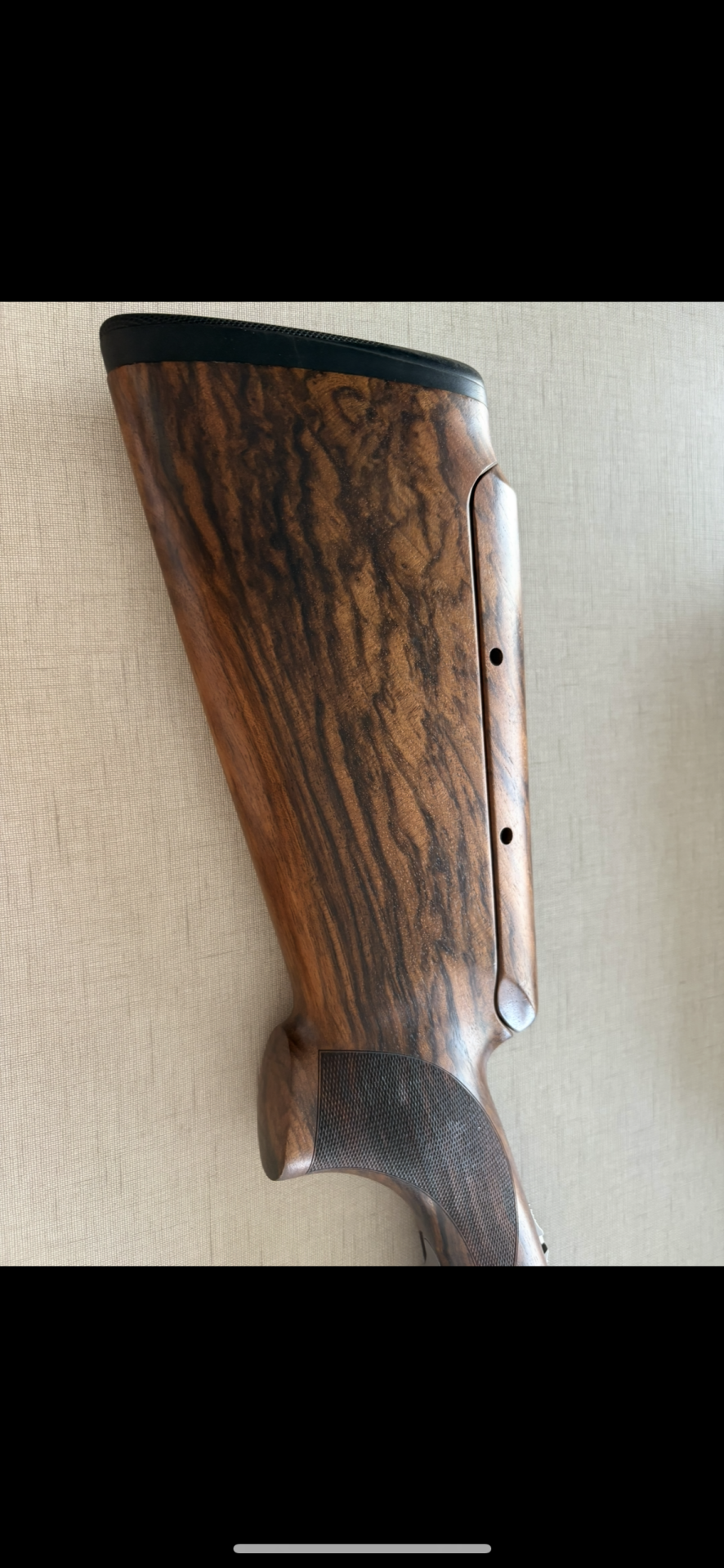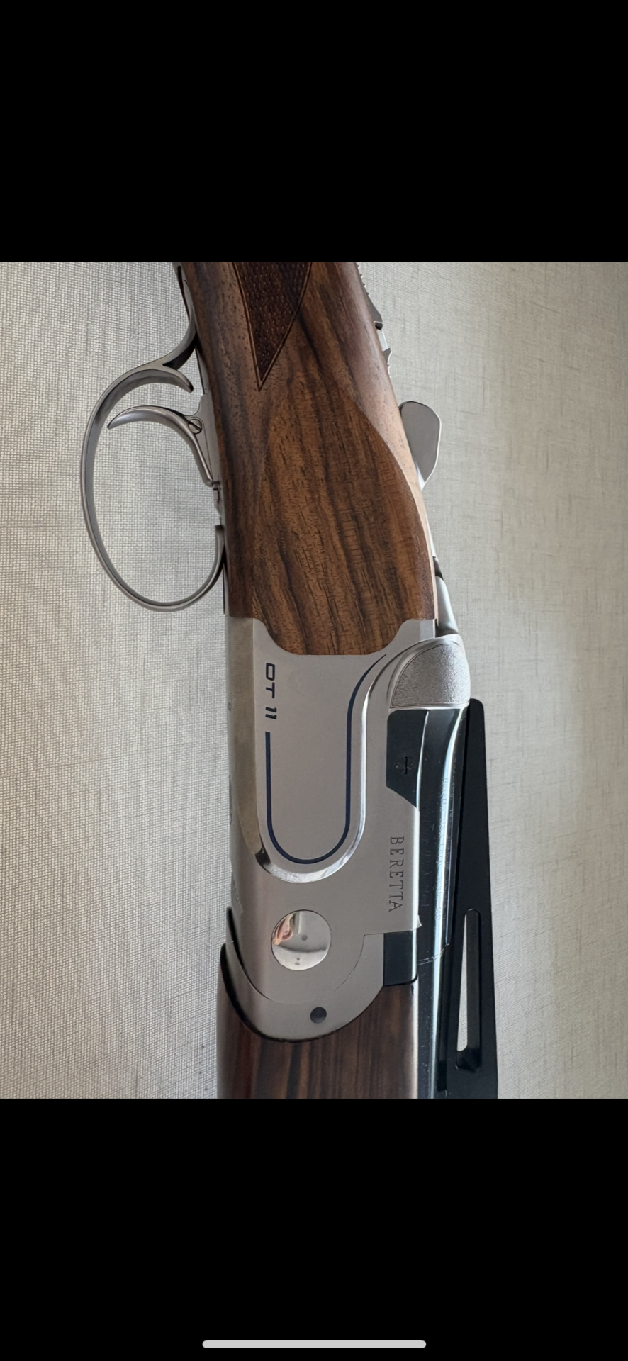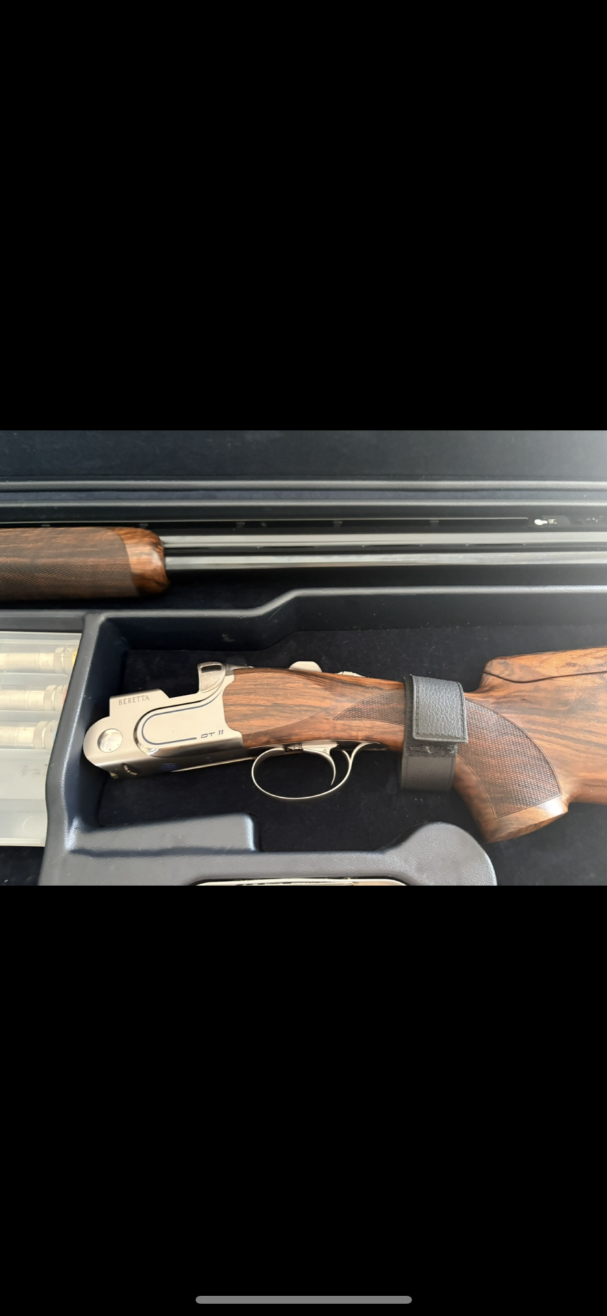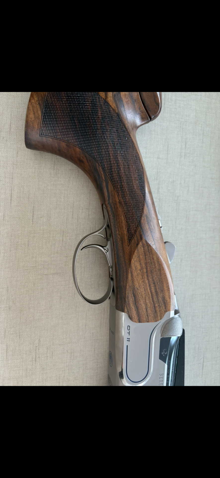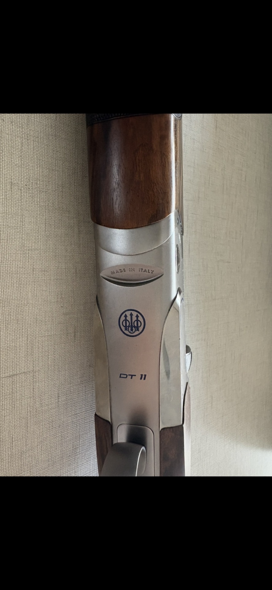 Parte superior de espingarda em madeira e metal com gravação Beretta DT 11.