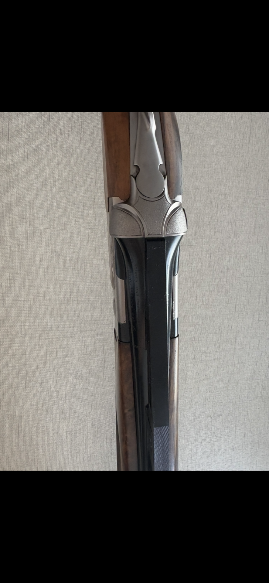 Espingarda de canos paralelos com madeira polida e caixa metálica prateada