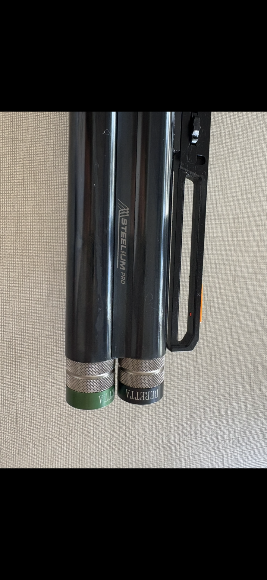Tubo de arma de fogo preto com detalhes metálicos e marcações BERETTA e STEELIUM PRO