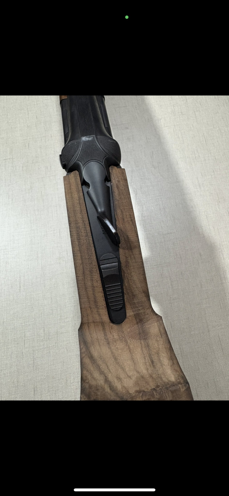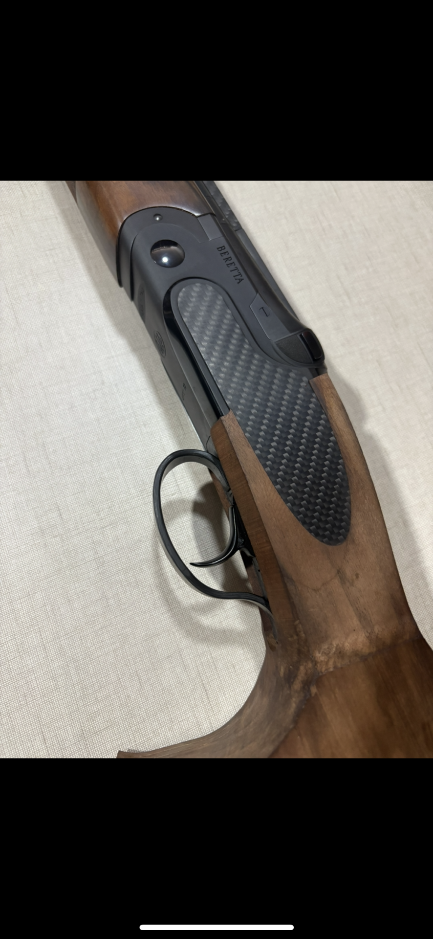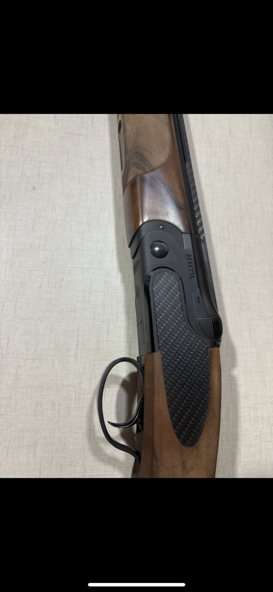Espingarda coronha de madeira castanha e empunhadura preta texturizada com inscrição BERETTA