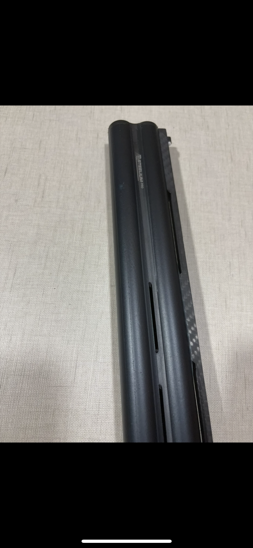 Peça metálica preta com texto STEELIUM PRO e detalhe em fibra de carbono