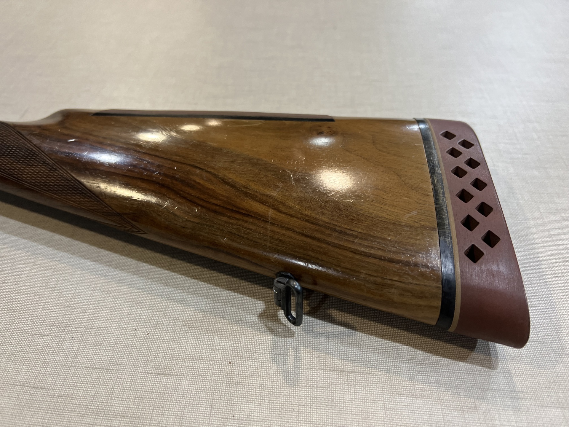 Coronha de espingarda em madeira polida com proteção de borracha vermelha próxima ao final
