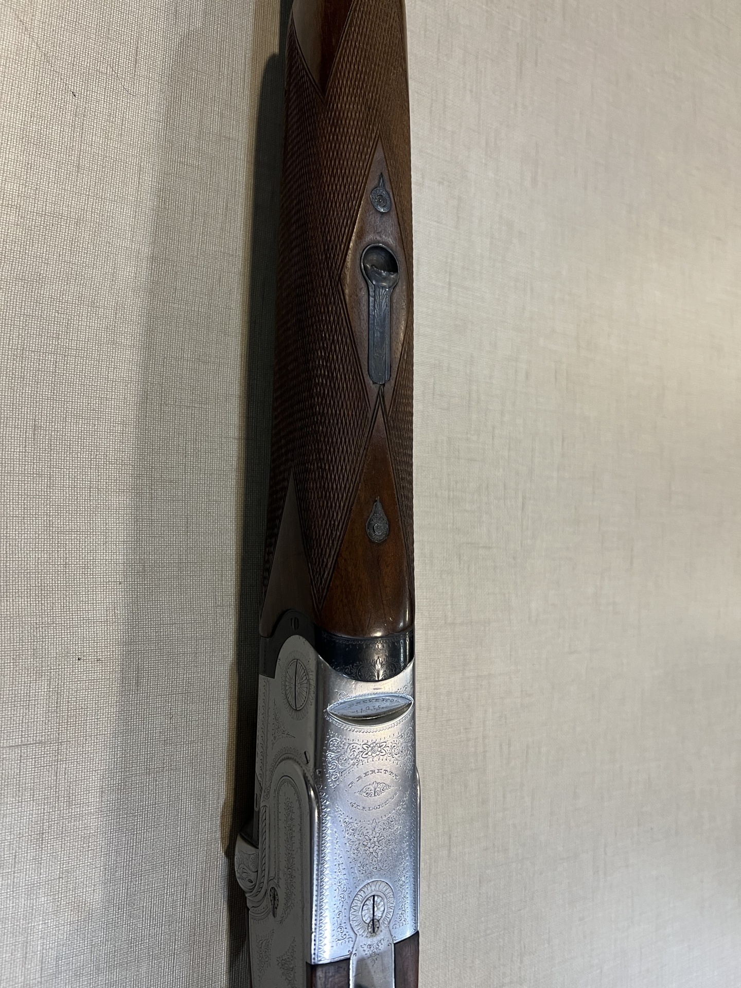 Espingarda de canos duplos com madeira castanha e metal prateado pendurada na parede