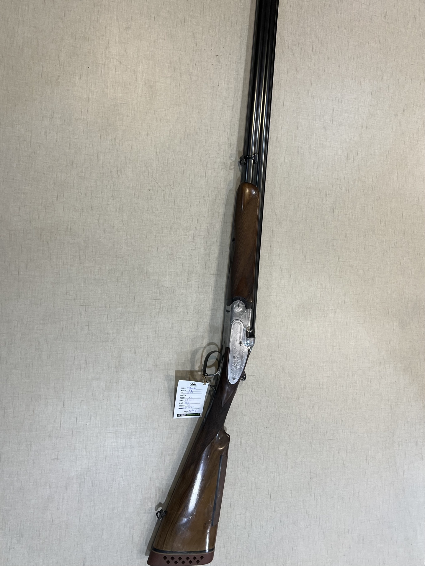 Espingarda com caixa metálica prateada e coronha de madeira castanha