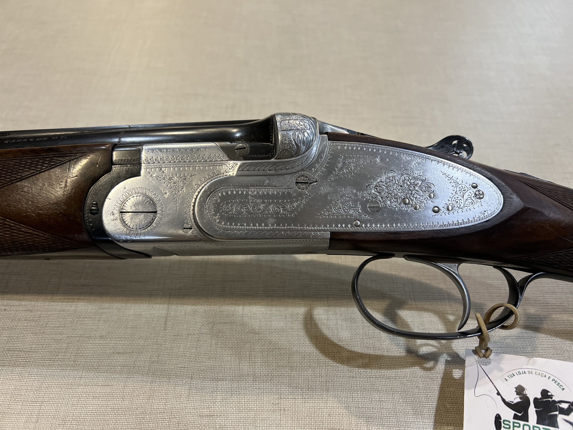 Espingarda com madeira castanha texturizada e metal prateado gravado