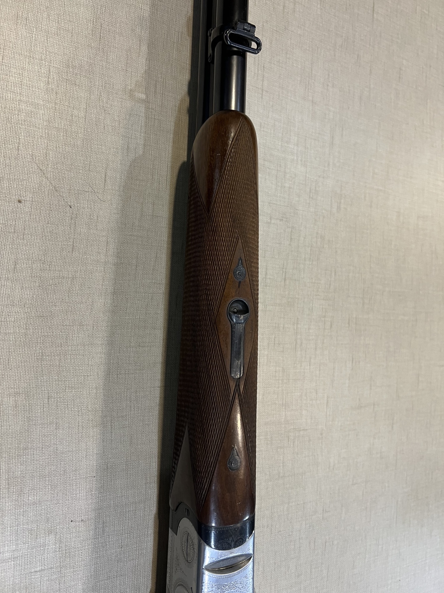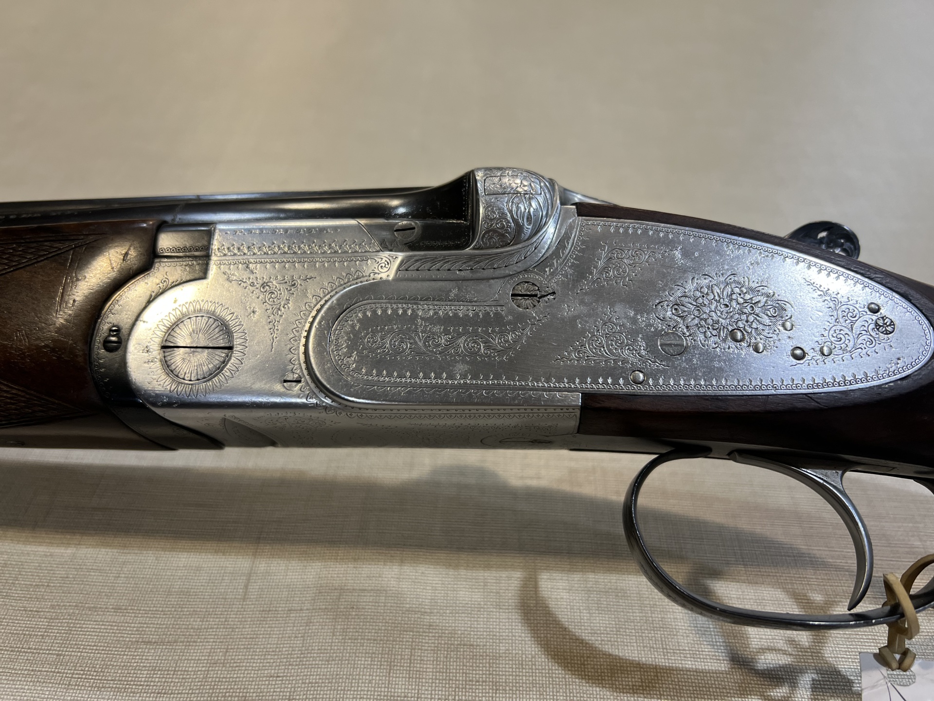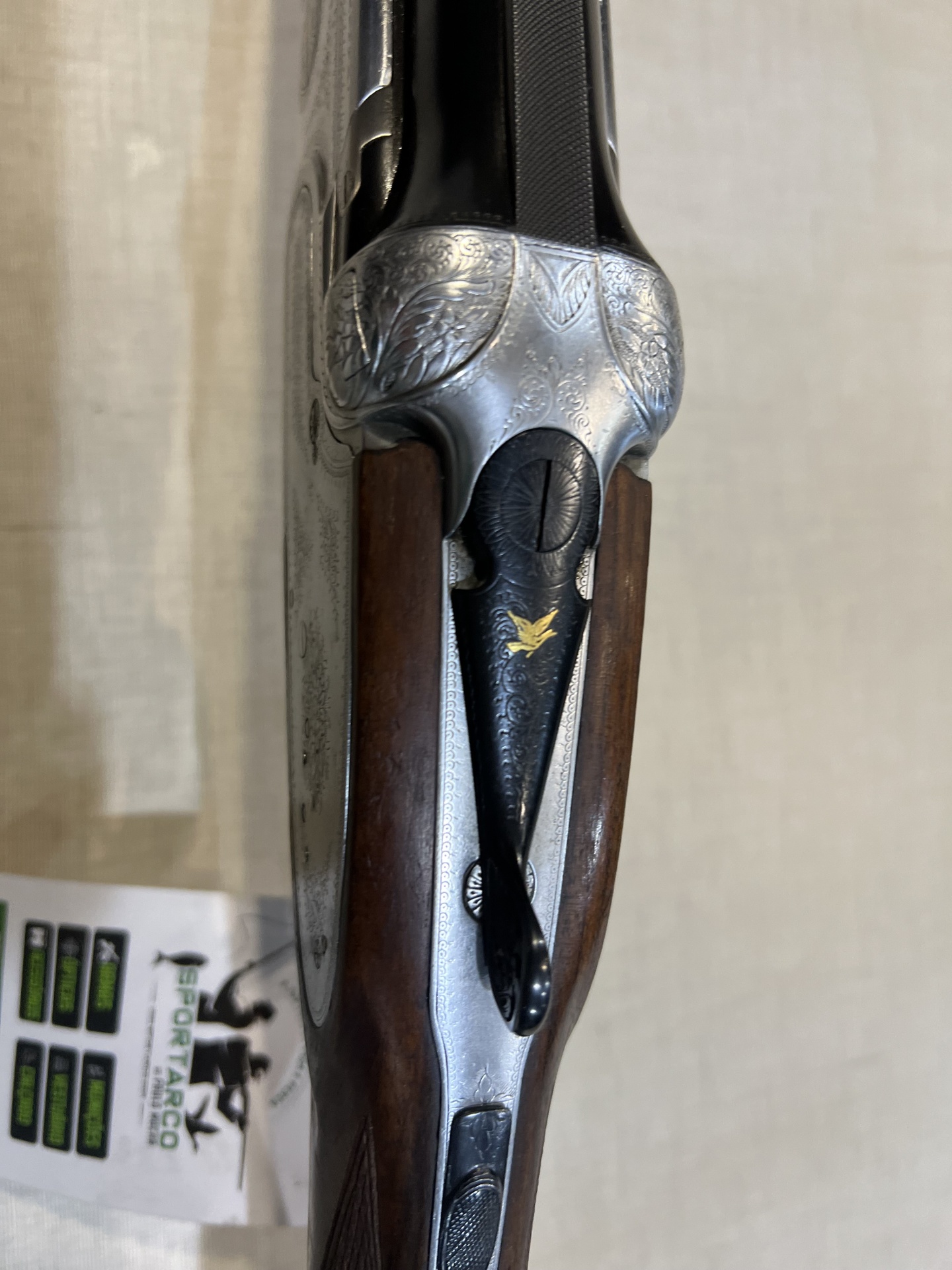 Rifle com madeira castanha e detalhes metálicos gravados, com detalhe dourado de ave