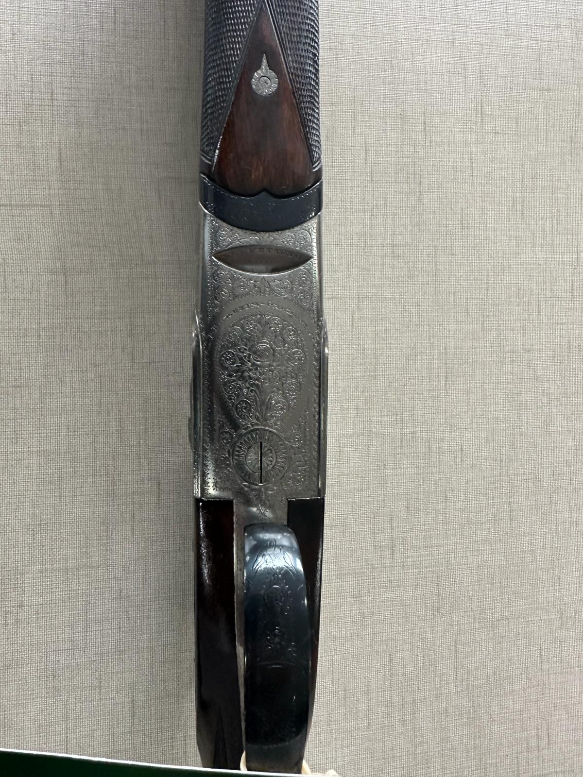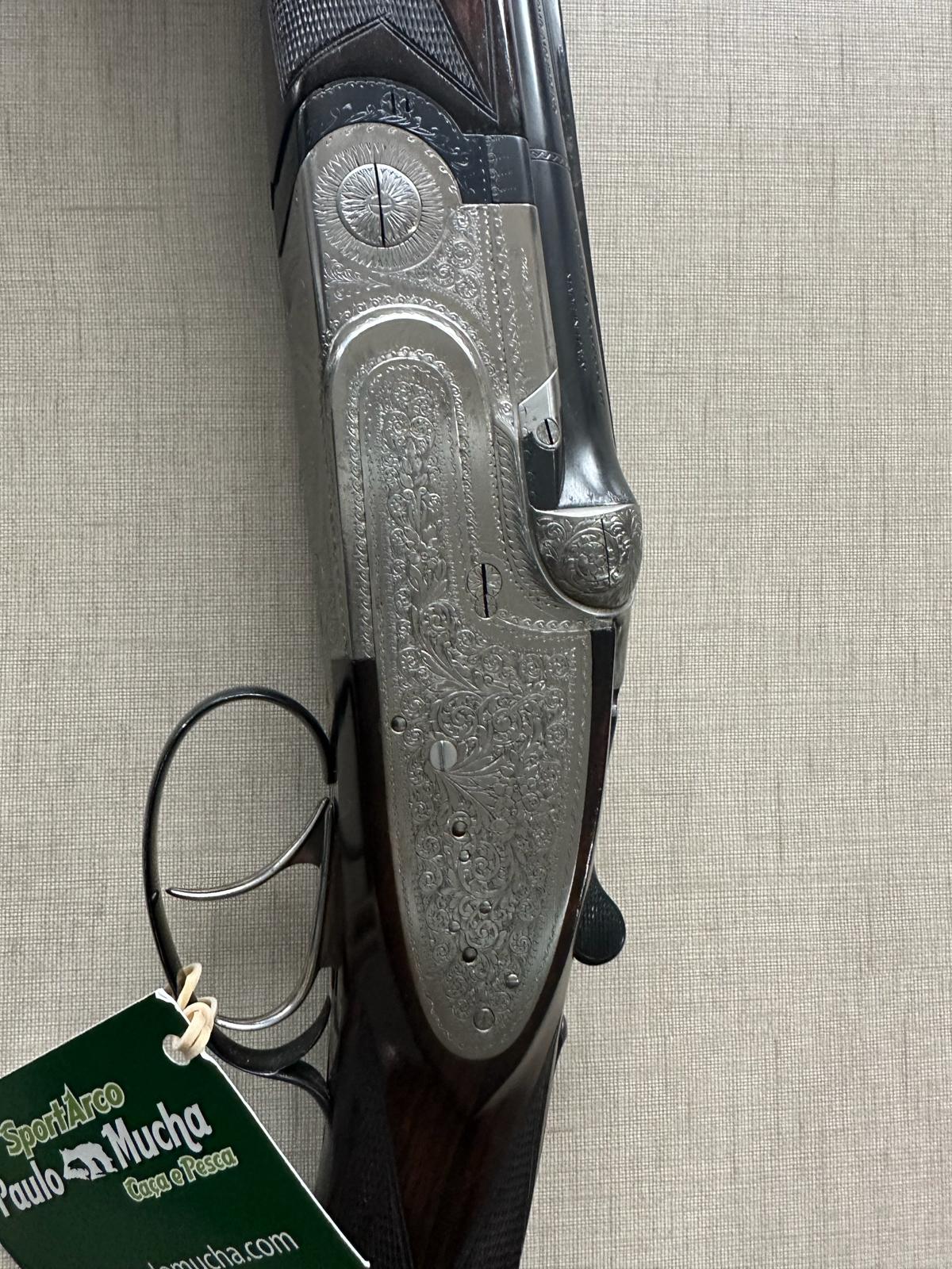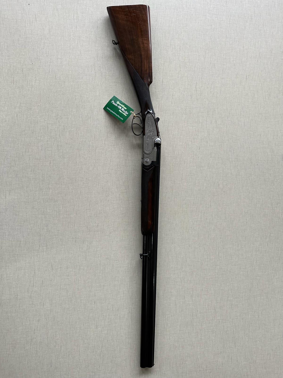 Espingarda de cano duplo com detalhes gravados e coronha de madeira escura.