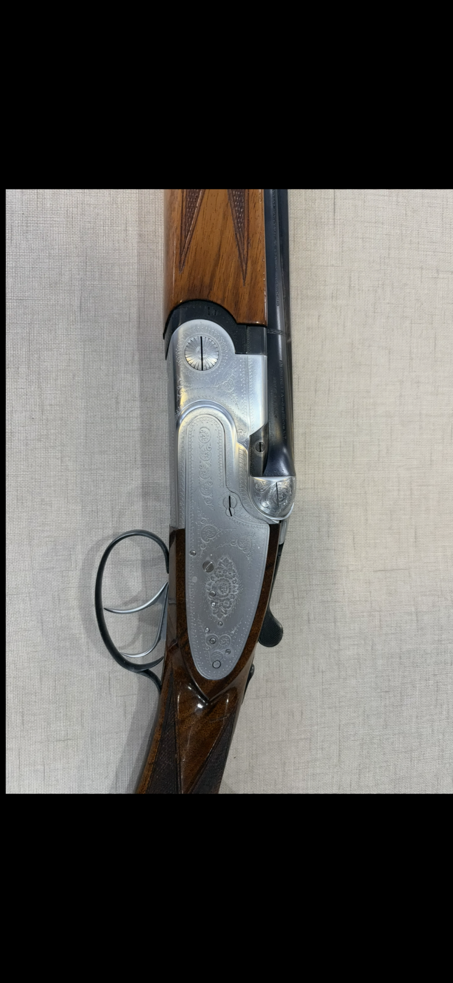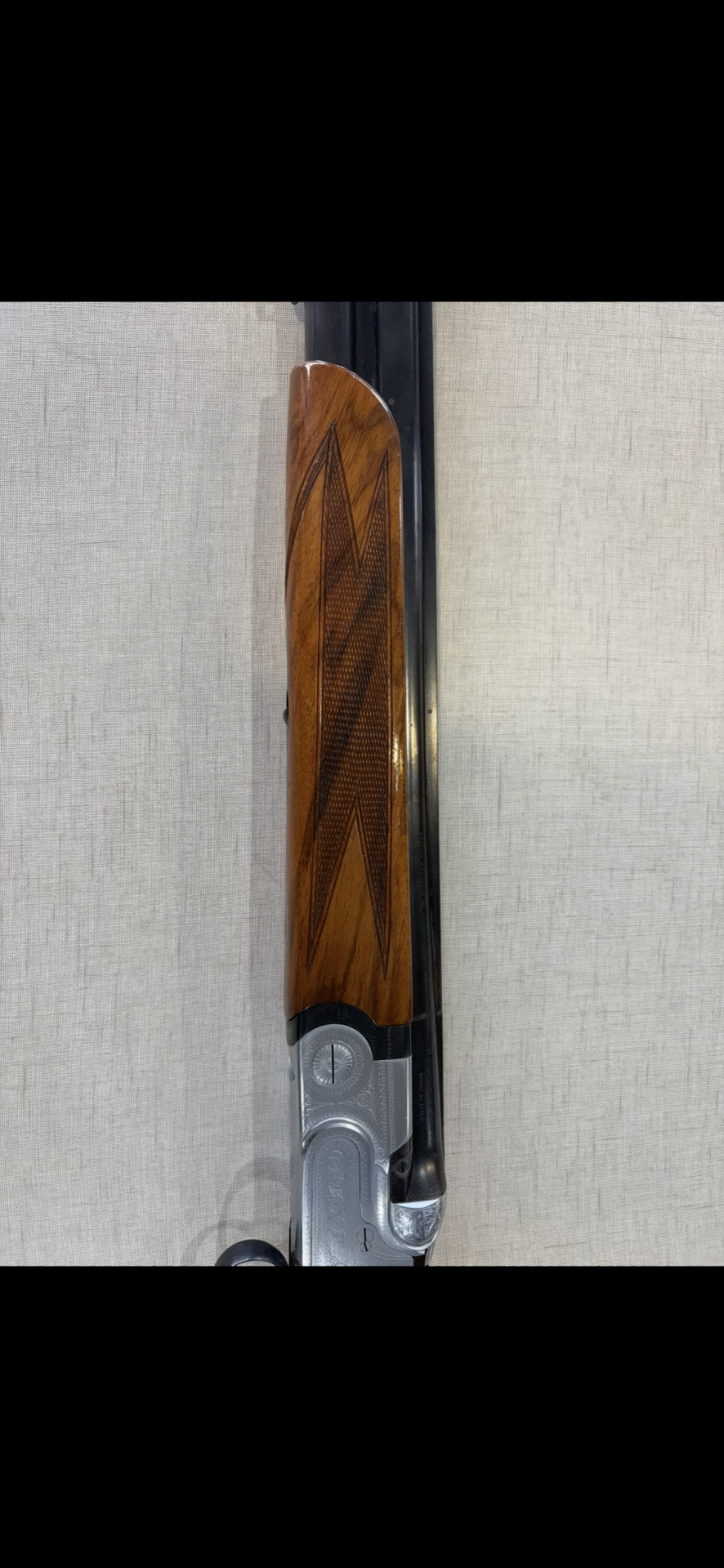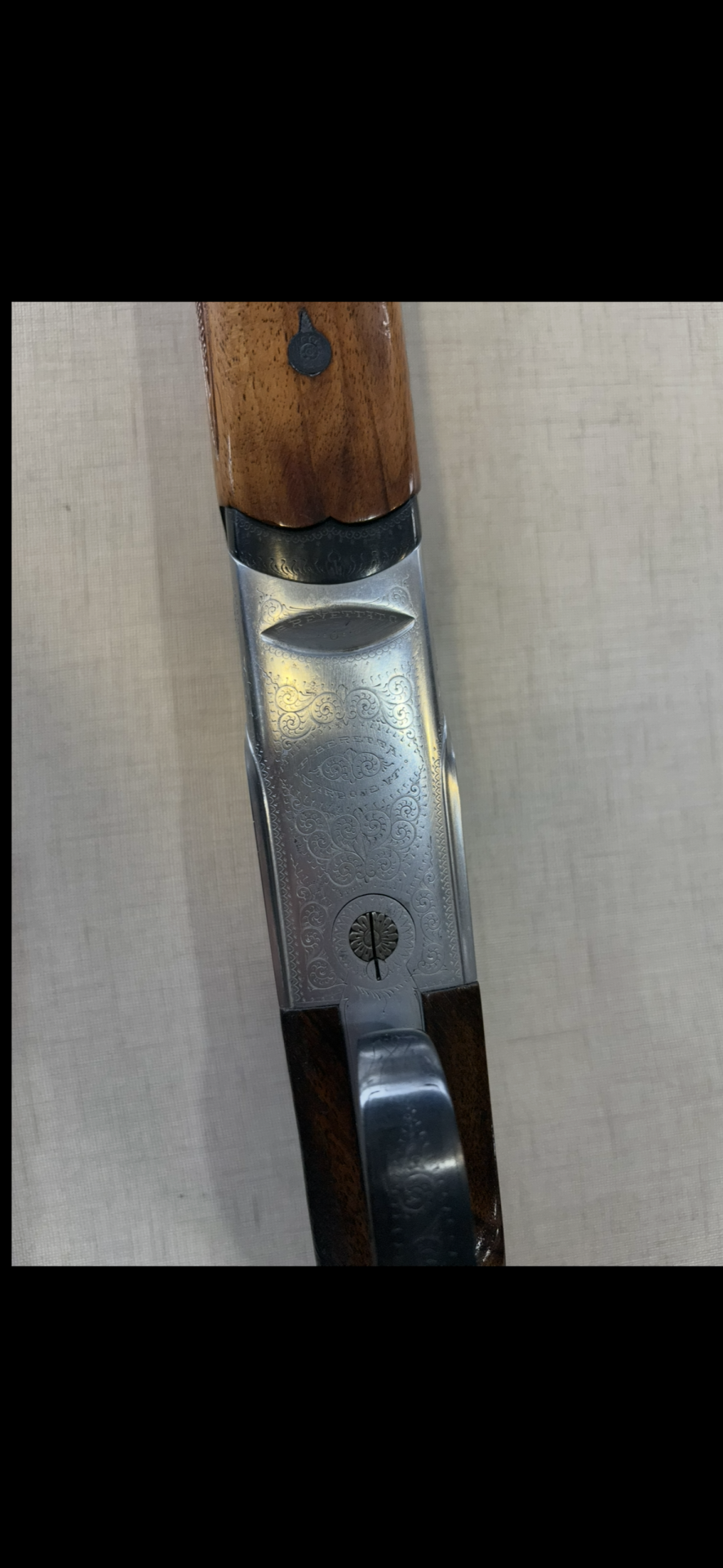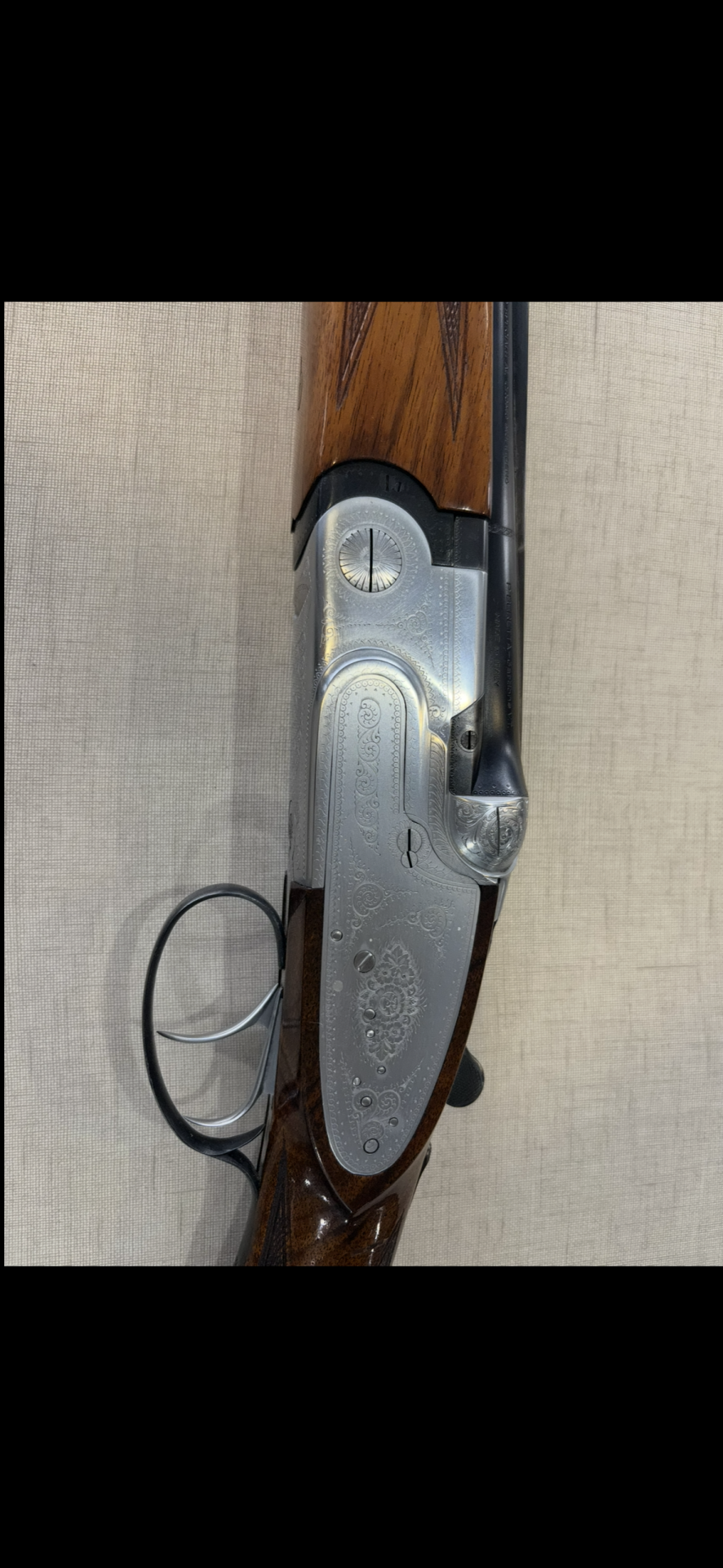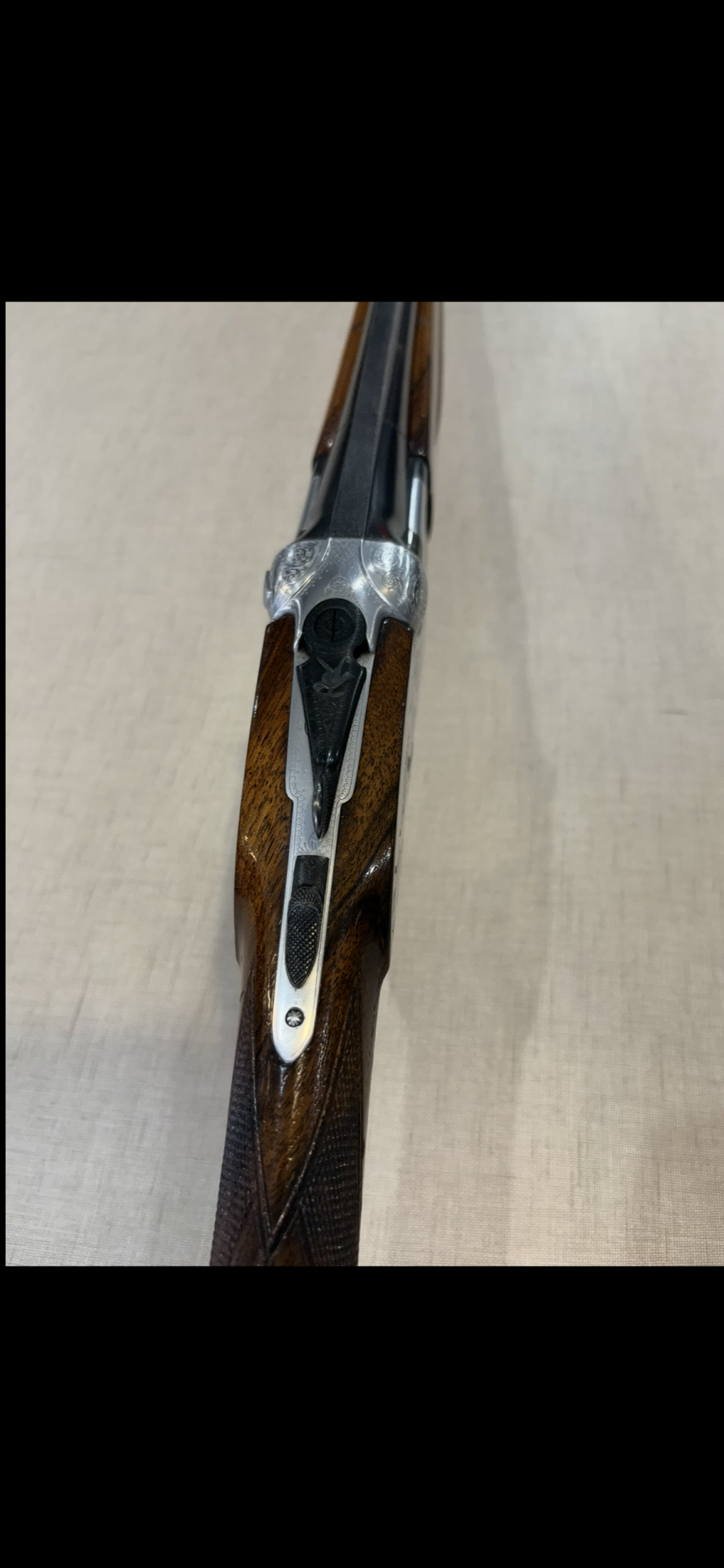 Espingarda dupla com coronha em madeira e armação metálica gravada vista de cima.