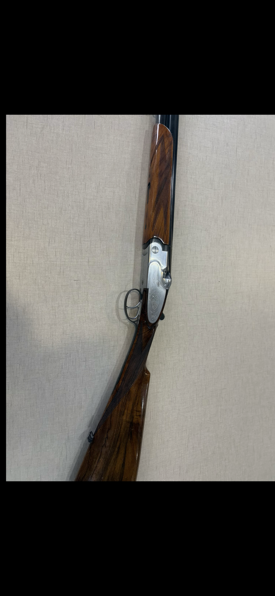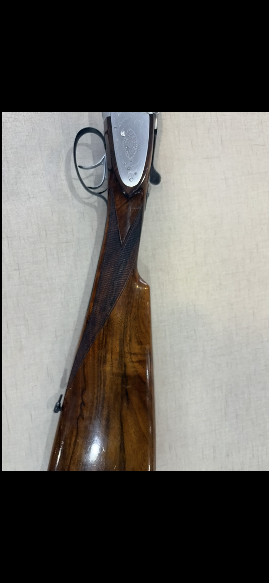 Espingarda com madeira castanha e parte metálica prateada pendurada num fundo bege