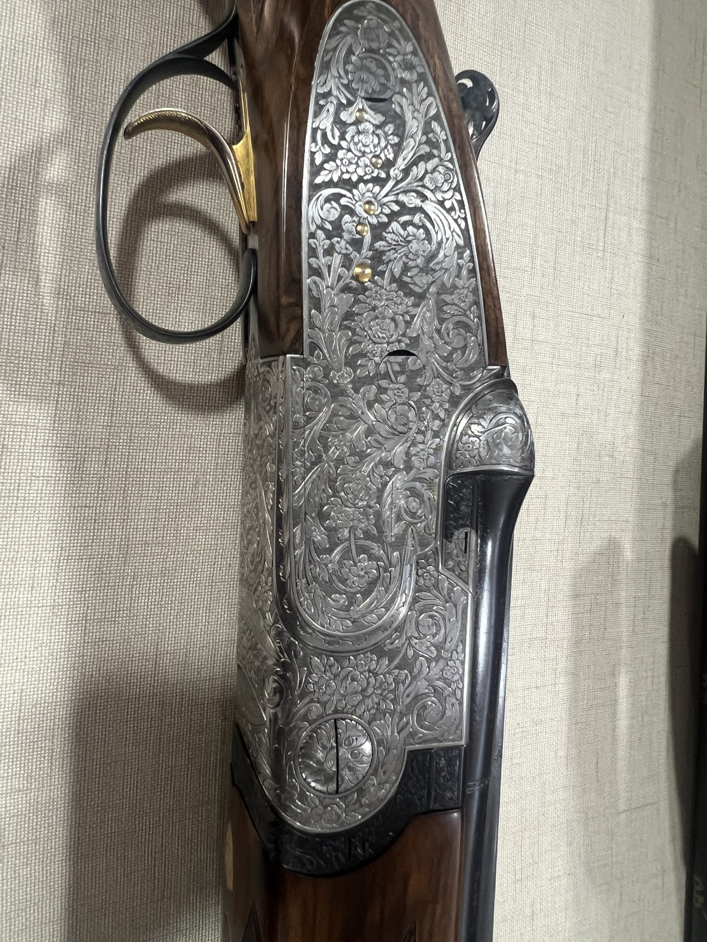 Espingarda de cano duplo com gravação detalhada em metal prateado e cabo em madeira