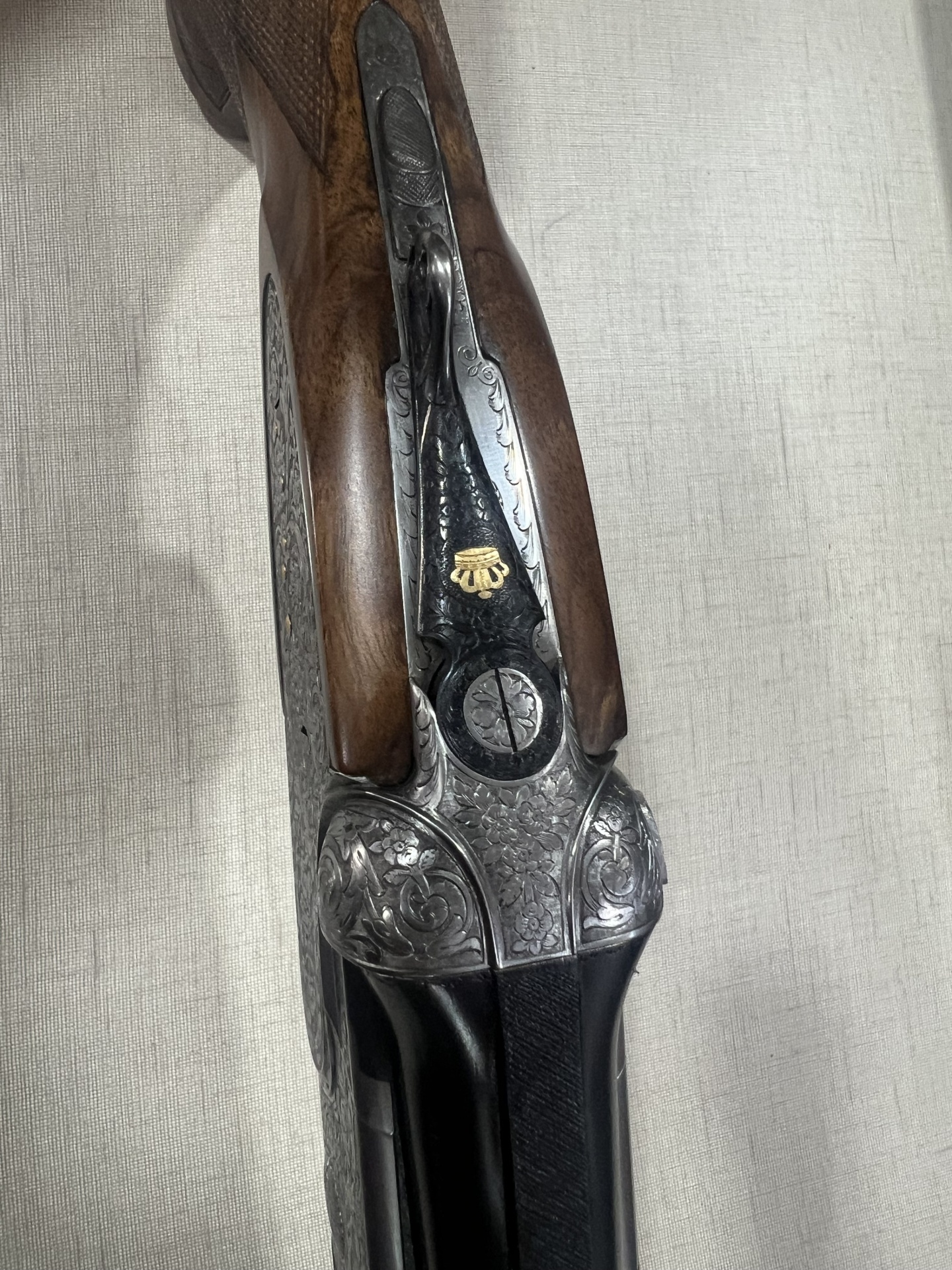 Espingarda de cano duplo com madeira e metal gravado