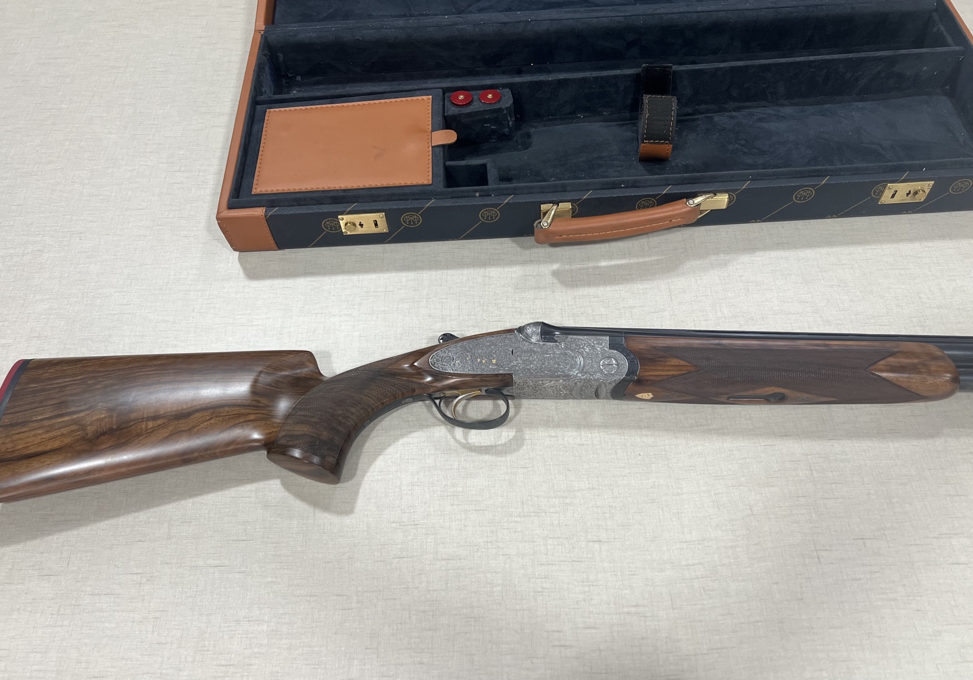 Espingarda desmontada em caixa de transporte com interior azul e couro castanho