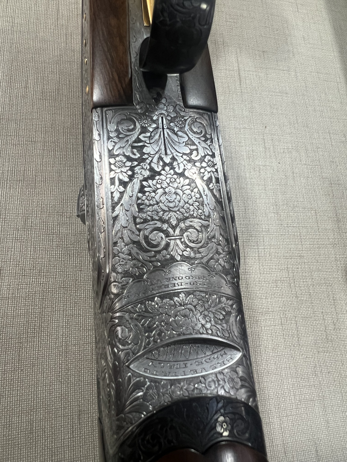 Parte de espingarda com gravações florais em metal e madeira escura