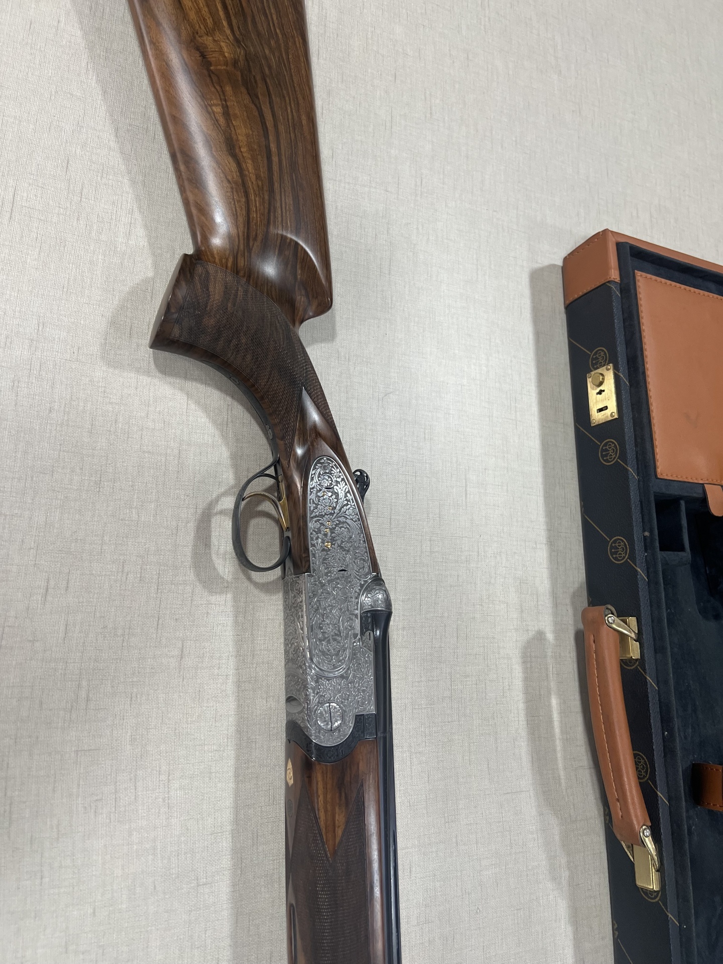 Espingarda de caça em madeira e metal gravado com mala preta e castanha ao lado.