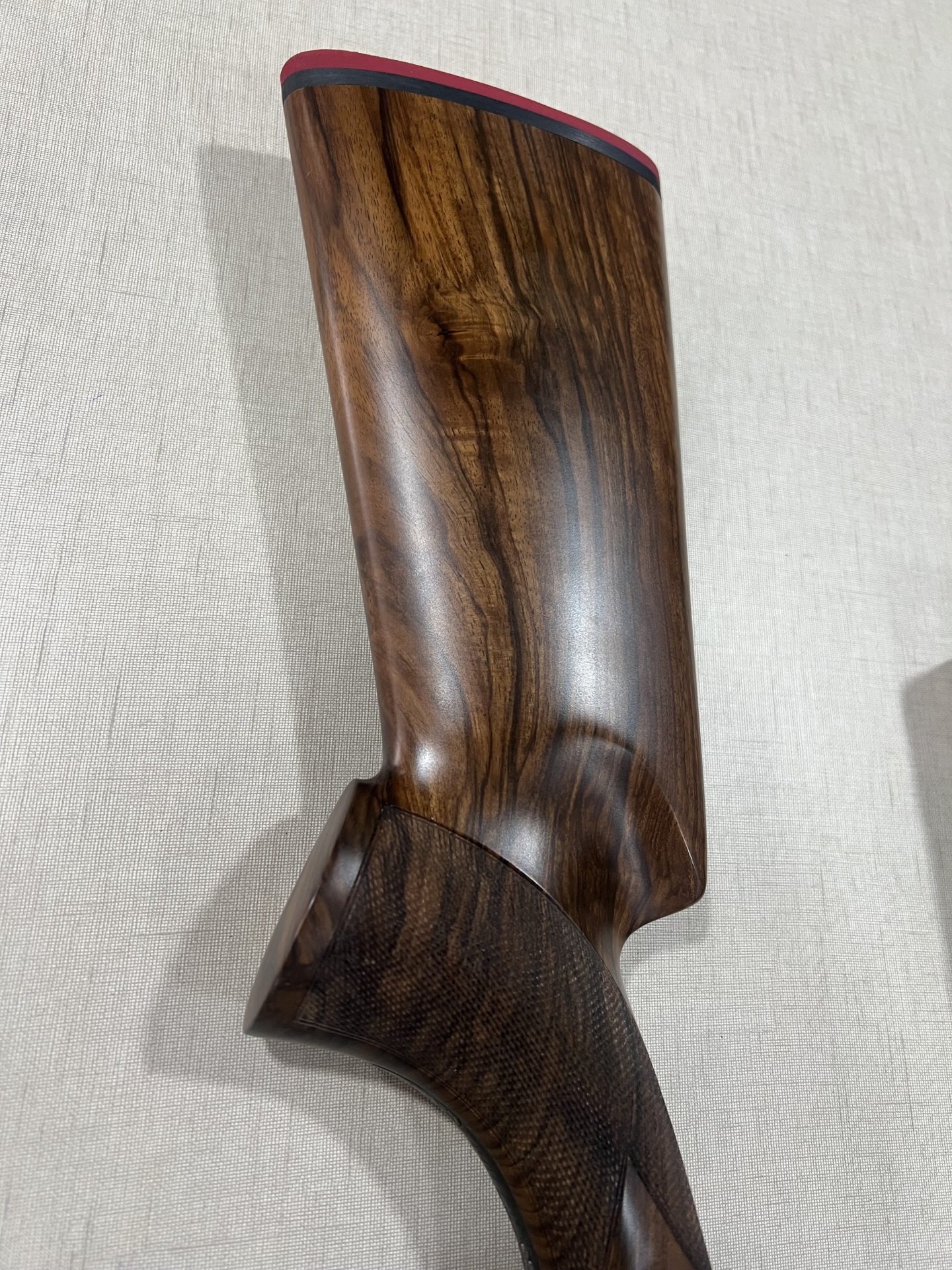 Peça de madeira polida com acabamento vermelho na borda, sobre tecido bege claro