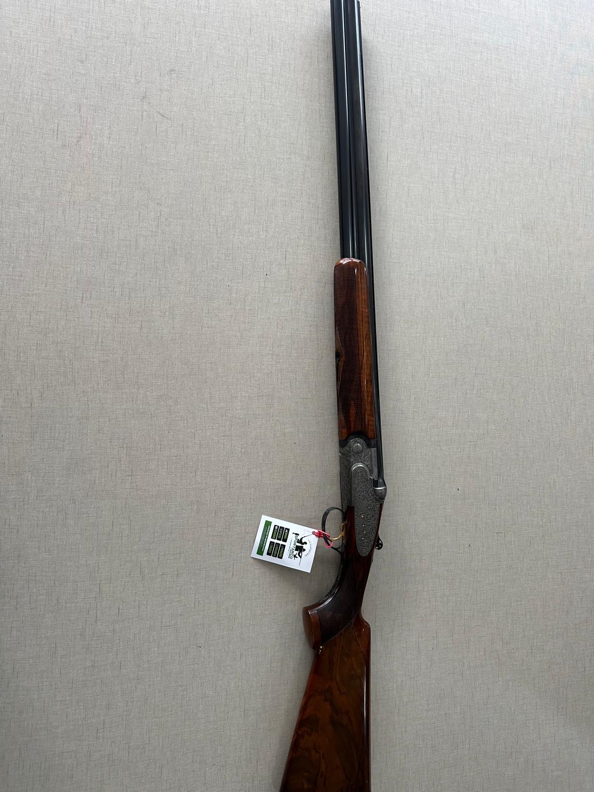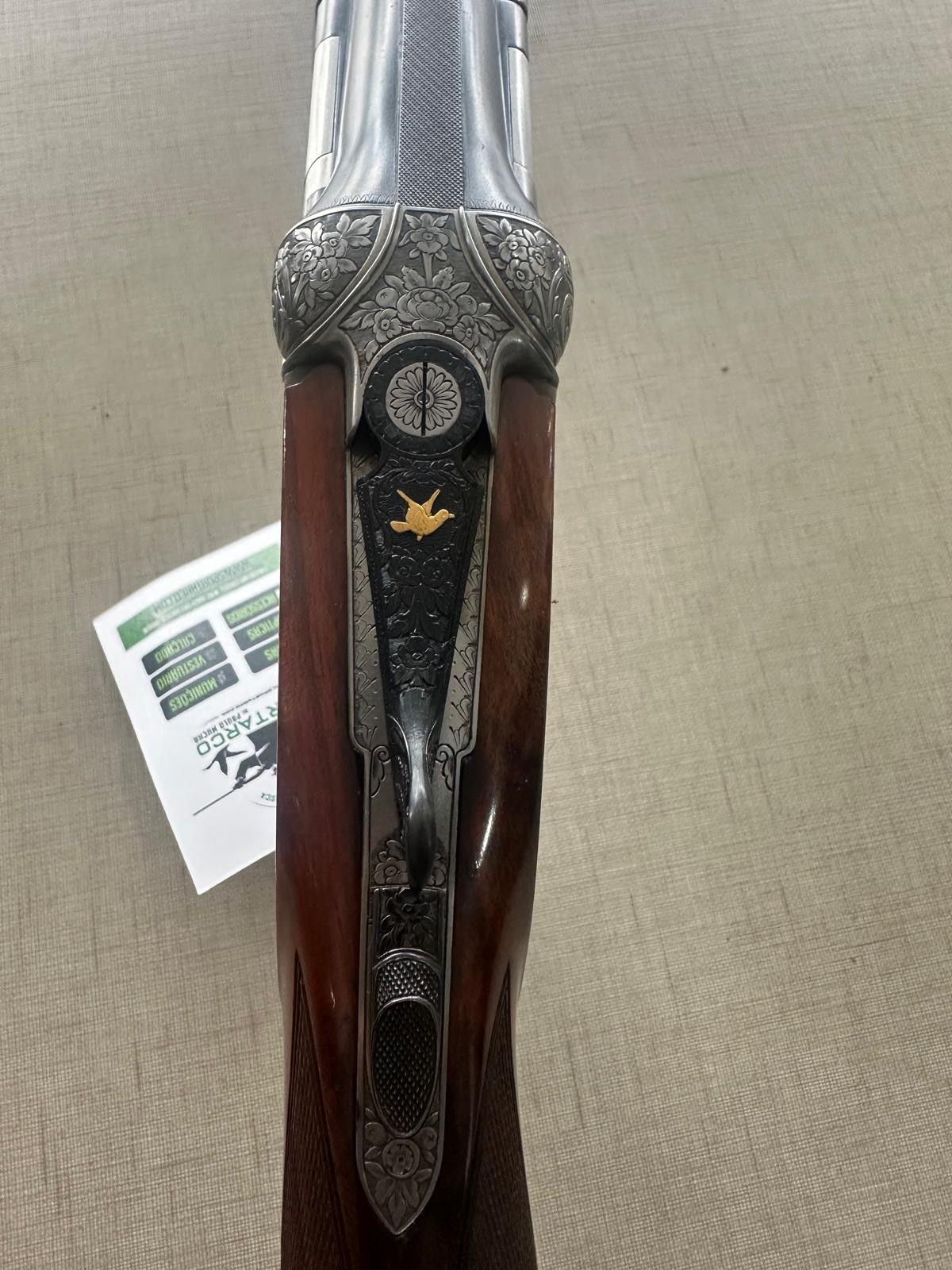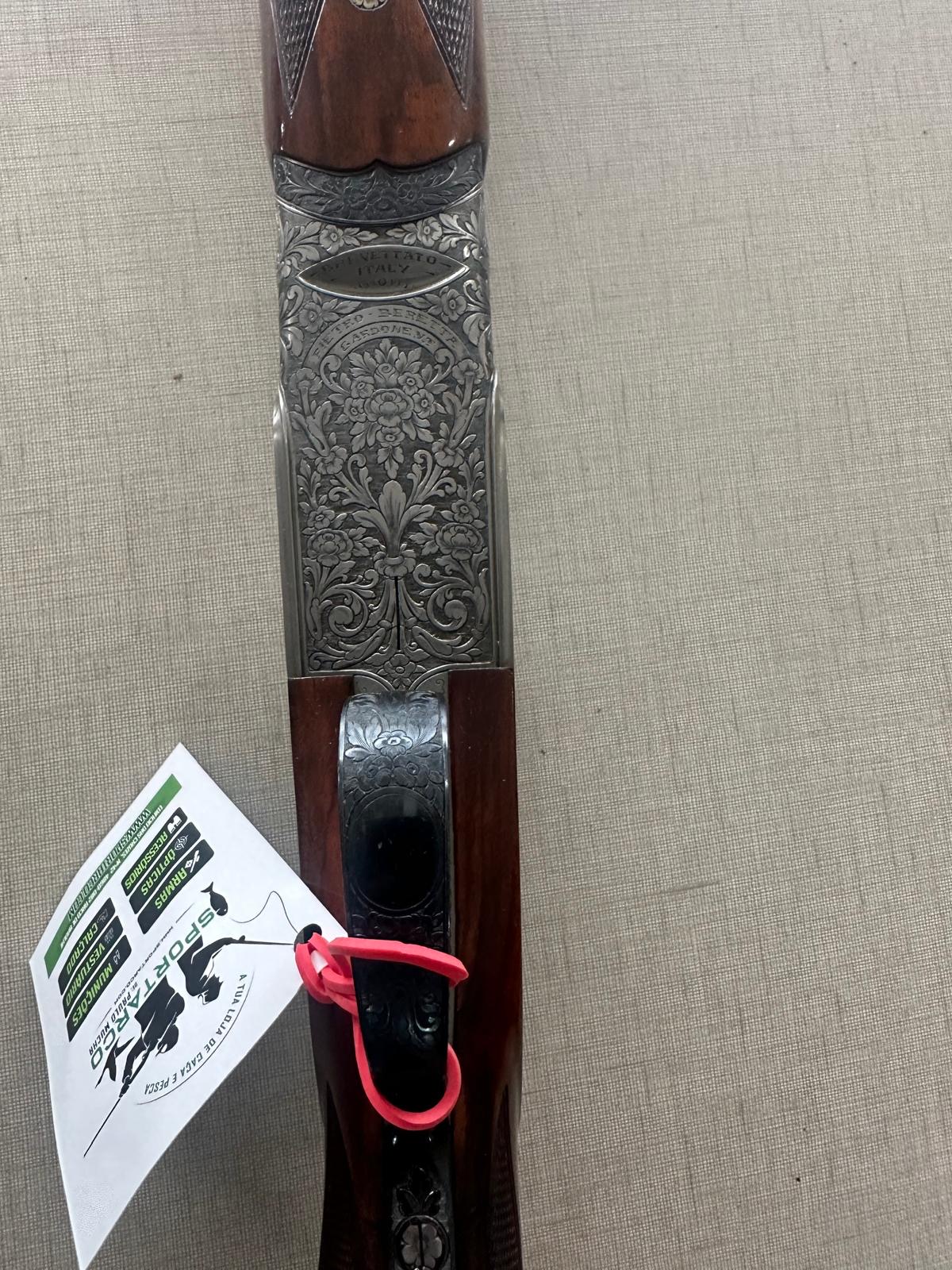 Espingarda com madeira castanha e detalhes metálicos gravados com padrão floral, etiqueta branca com texto e cordão vermelho.