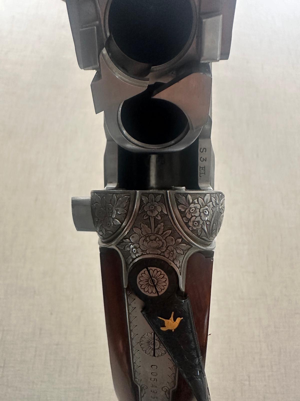 Espingarda de canos duplos com gravações florais em metal escuro e madeira castanha