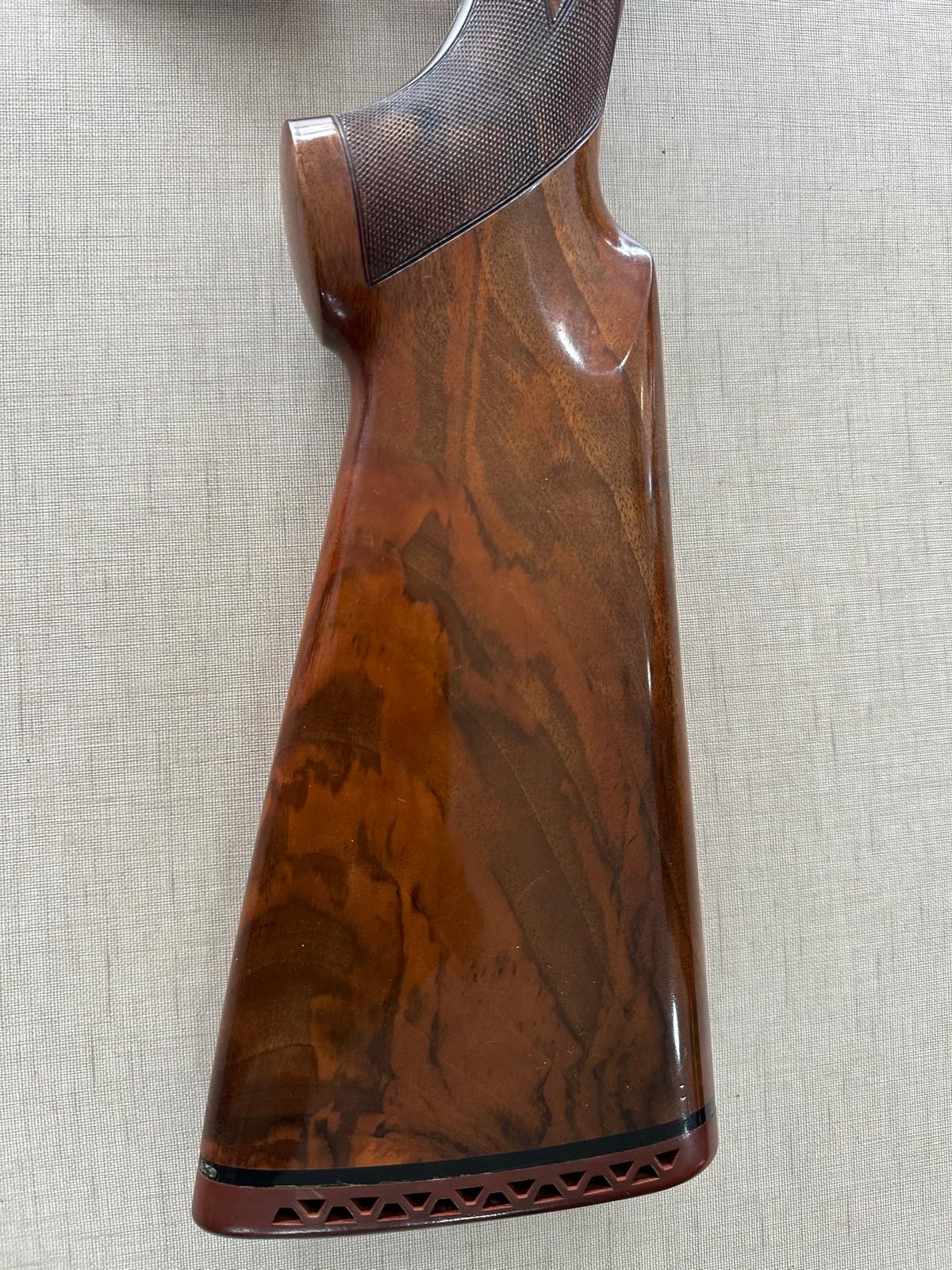 Cabo traseiro de arma de fogo em madeira polida castanha com detalhes texturizados.