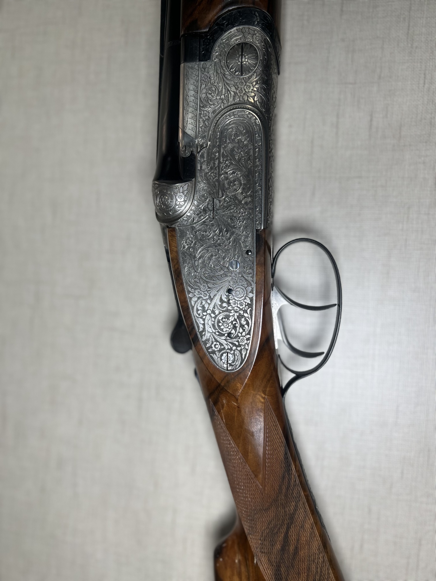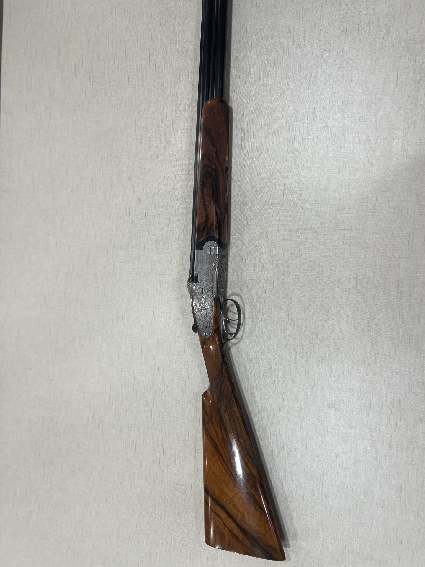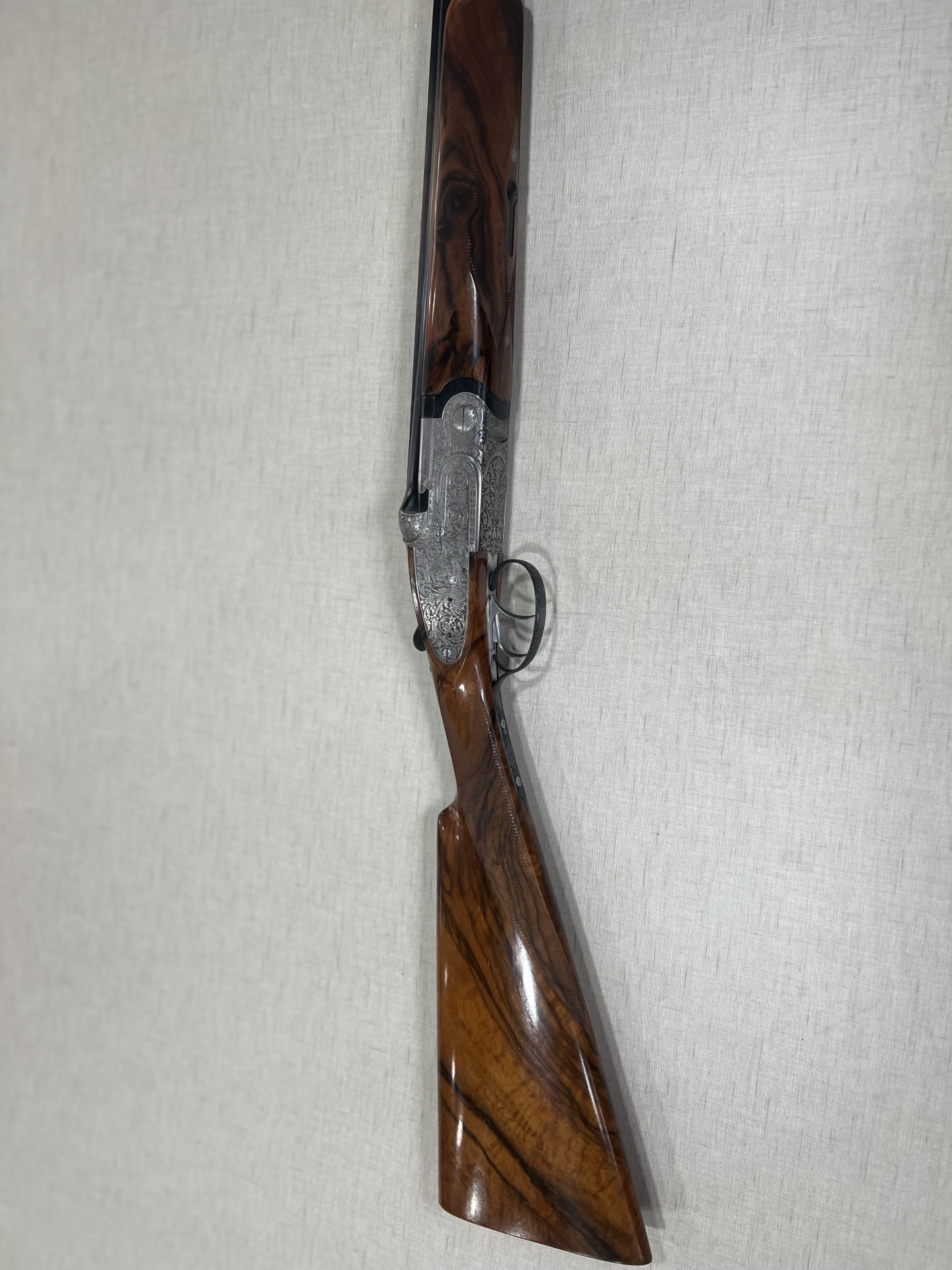 Espingarda de canos duplos com madeira castanha polida e corpo metálico prateado